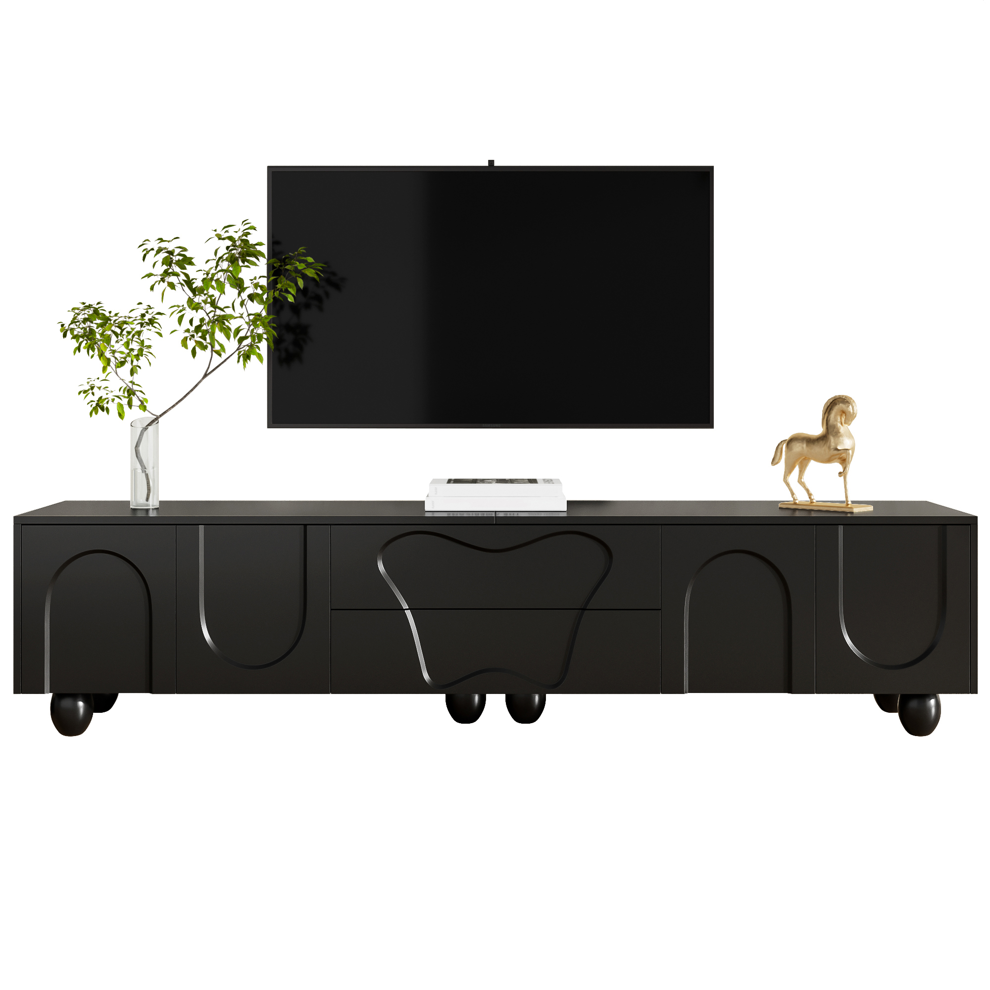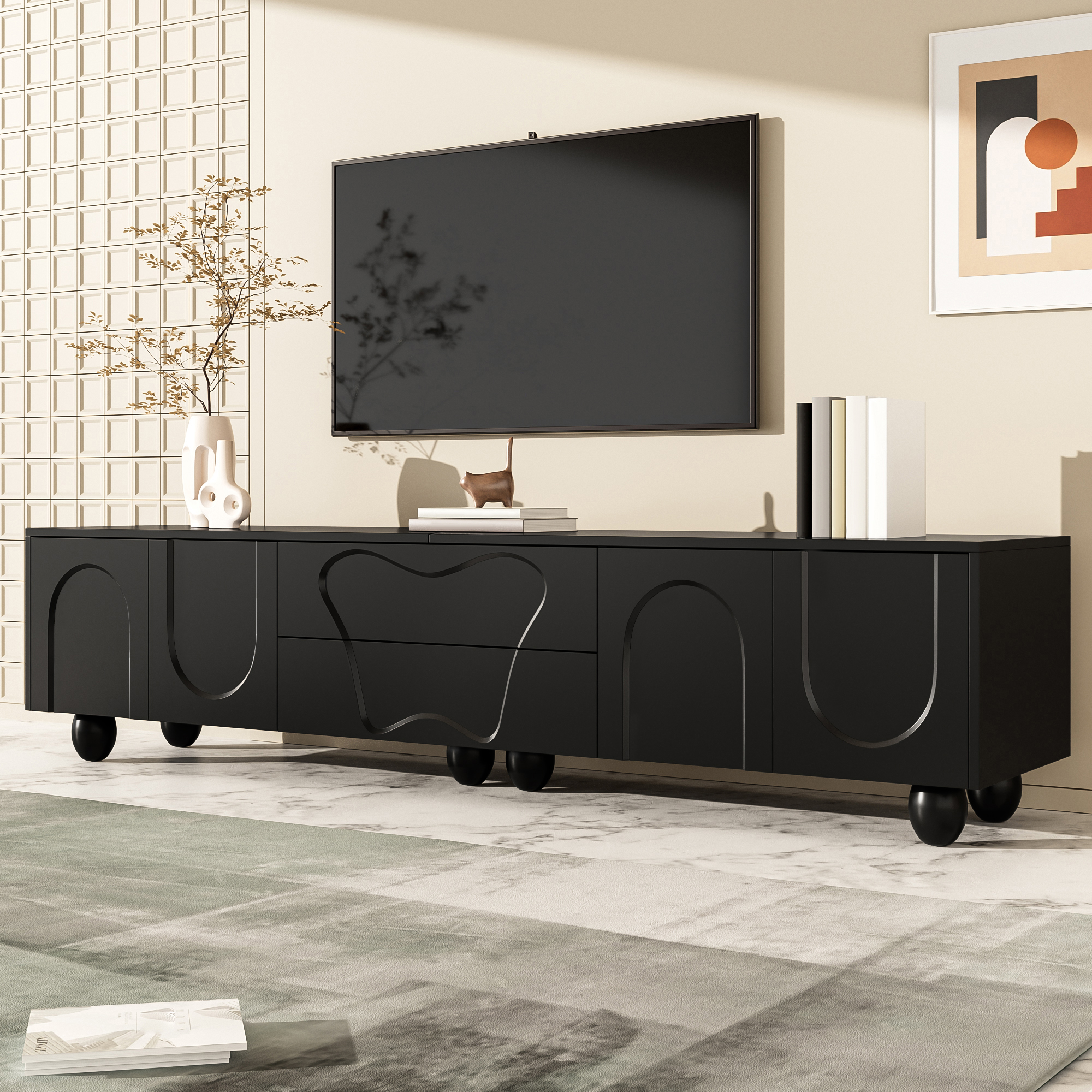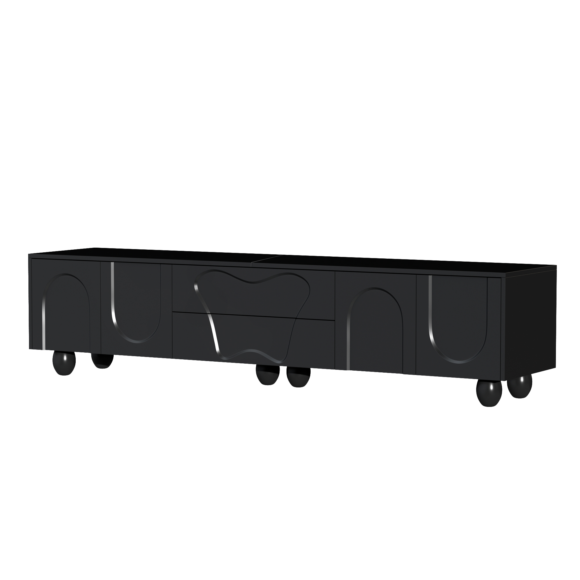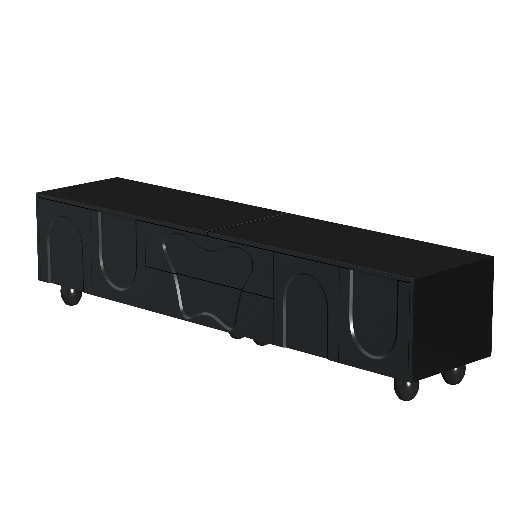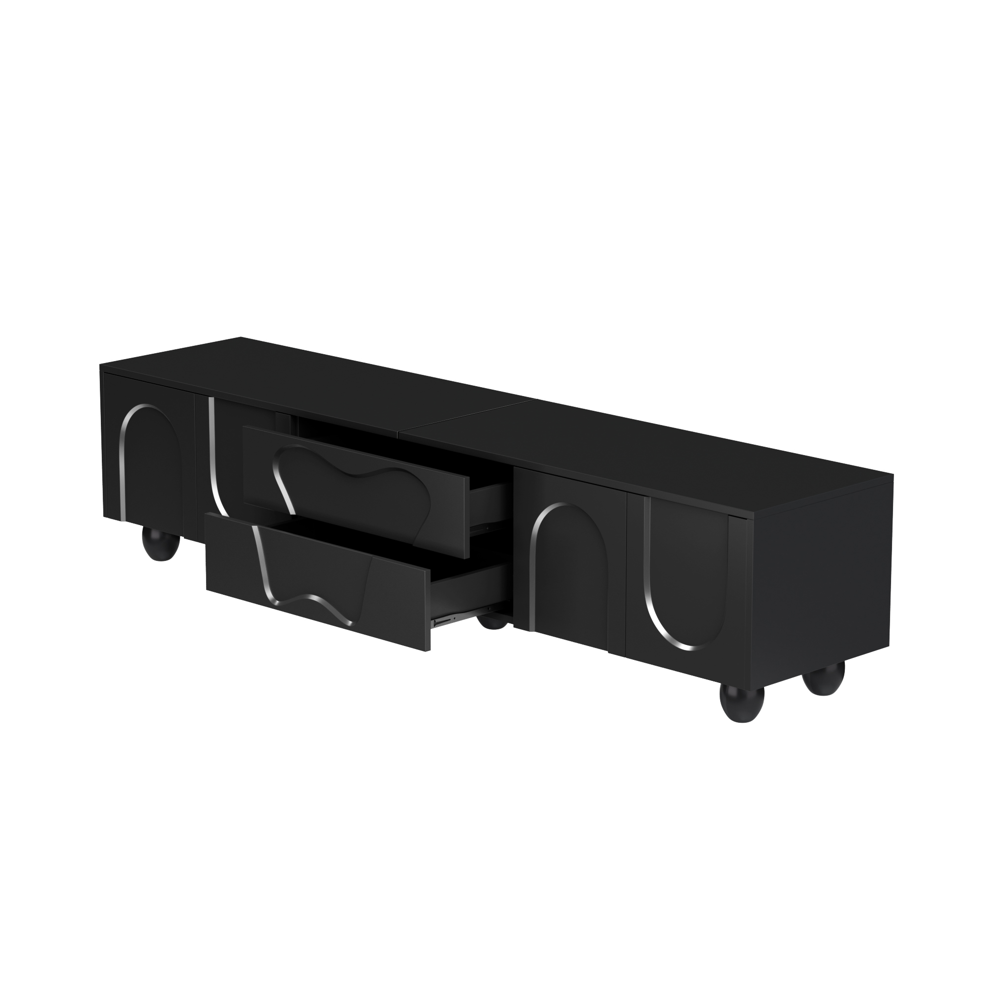 This black TV cabinet combines modern design with outstanding functionality. It is made from high-quality PB material and features a matte black surface that is easy to clean and scratch-resistant. The round wooden legs made of solid natural wood complement the modern design and ensure long-lasting stability. The unique design, with clean lines and curved doors, adds an elegant and fresh atmosphere to your living room. The spacious tabletop provides ample room for decorations, plants, and speakers without causing space constraints. This cabinet is not just a piece of furniture but also a true work of art that fits perfectly into modern and Nordic interior styles. The integrated storage space offers flexible solutions to keep your belongings neat and organized. Behind the curved doors, there is plenty of room for larger devices such as game consoles or routers, while the specially designed drawers store smaller items like remote controls, CDs, and batteries. With a length of 180 cm and a width of 40 cm, this cabinet fits perfectly into small to medium-sized rooms without making the space feel crowded. Especially in smaller apartments, it creates a sense of openness and order, while the natural wood grain and elegant design enhance the overall ambiance. Another highlight is the easy installation. Thanks to the clear instructions and the included tools, you can assemble the TV cabinet yourself quickly and effortlessly. Ideal for anyone who wants to furnish their space in a stylish yet practical way.