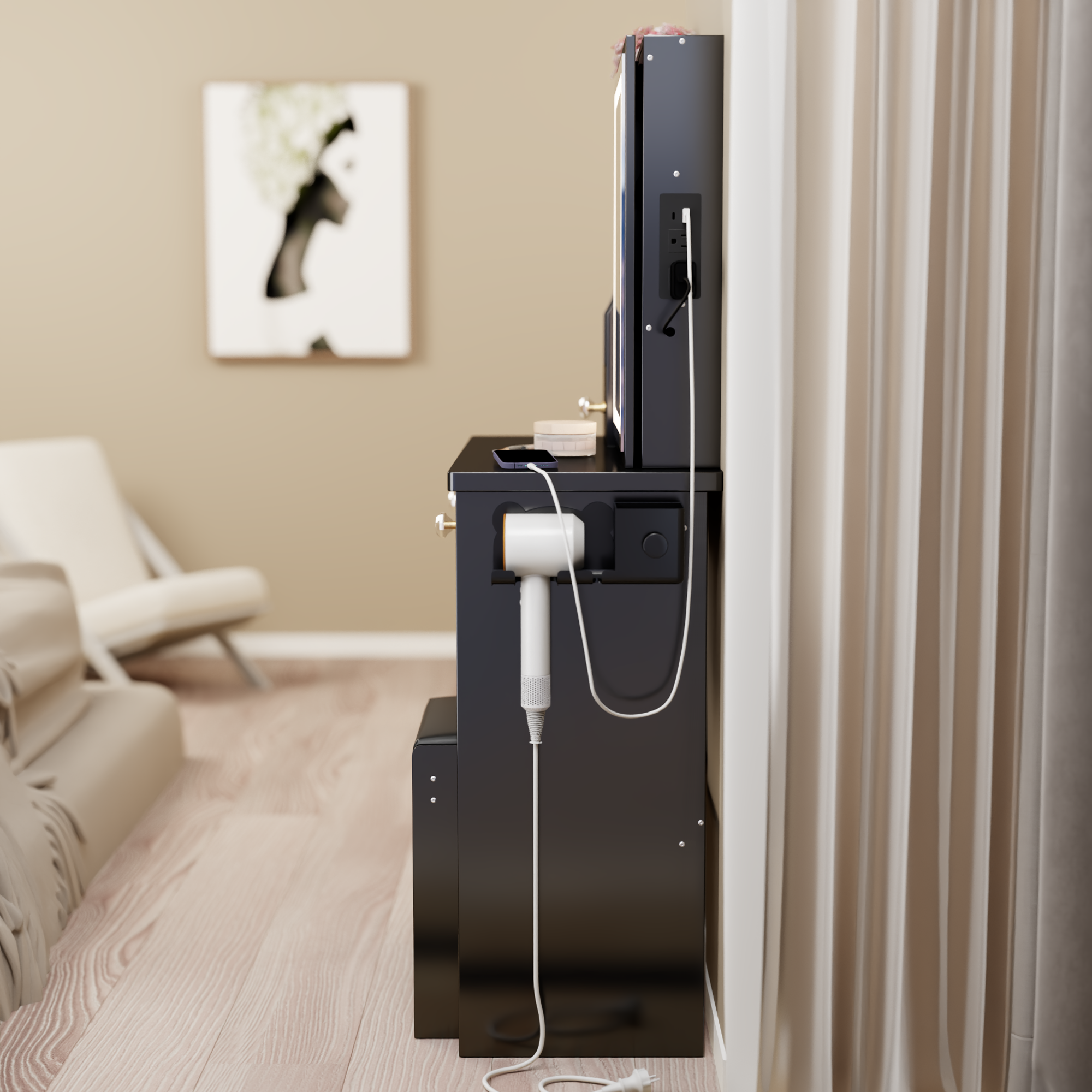 - [2 AC powers and 2 USB ports built-in socket]: Equipped with 2 built-in AC powers and 2 USB ports socket, it can conveniently charge phones and tablets while you are dressing up. Two AC power sources allow you use both a curler and a hair dryer simultaneously.