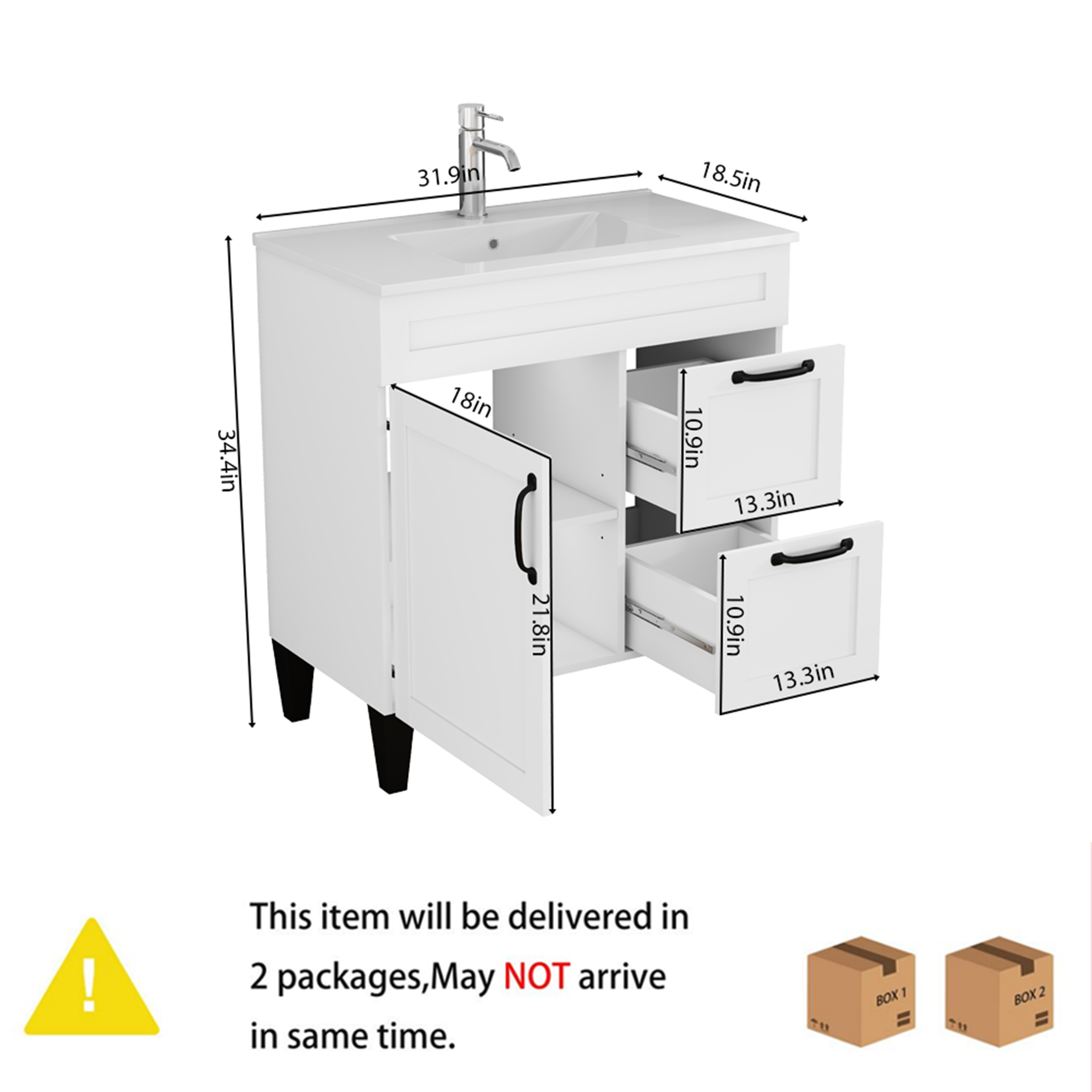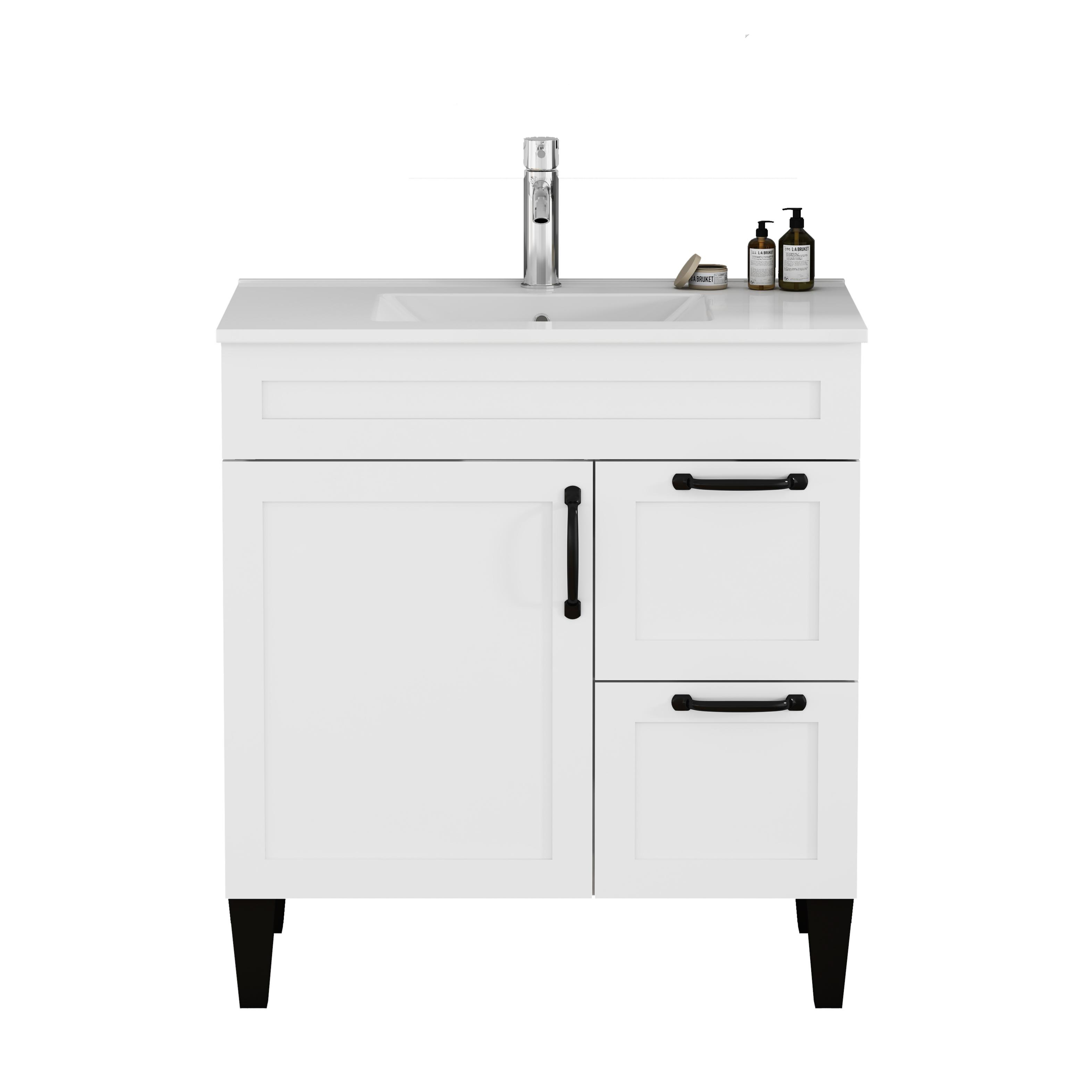 Product Name:31.5-inch Bathroom Vanity With Sink Combo,Cabinet With 1 Doors and 2 Drawer,Black Metal Handle,Black Feet,Soft Close Hinge,Mordern Bathroom Cabinet,Ceramic Basin,Easy Assemble,White