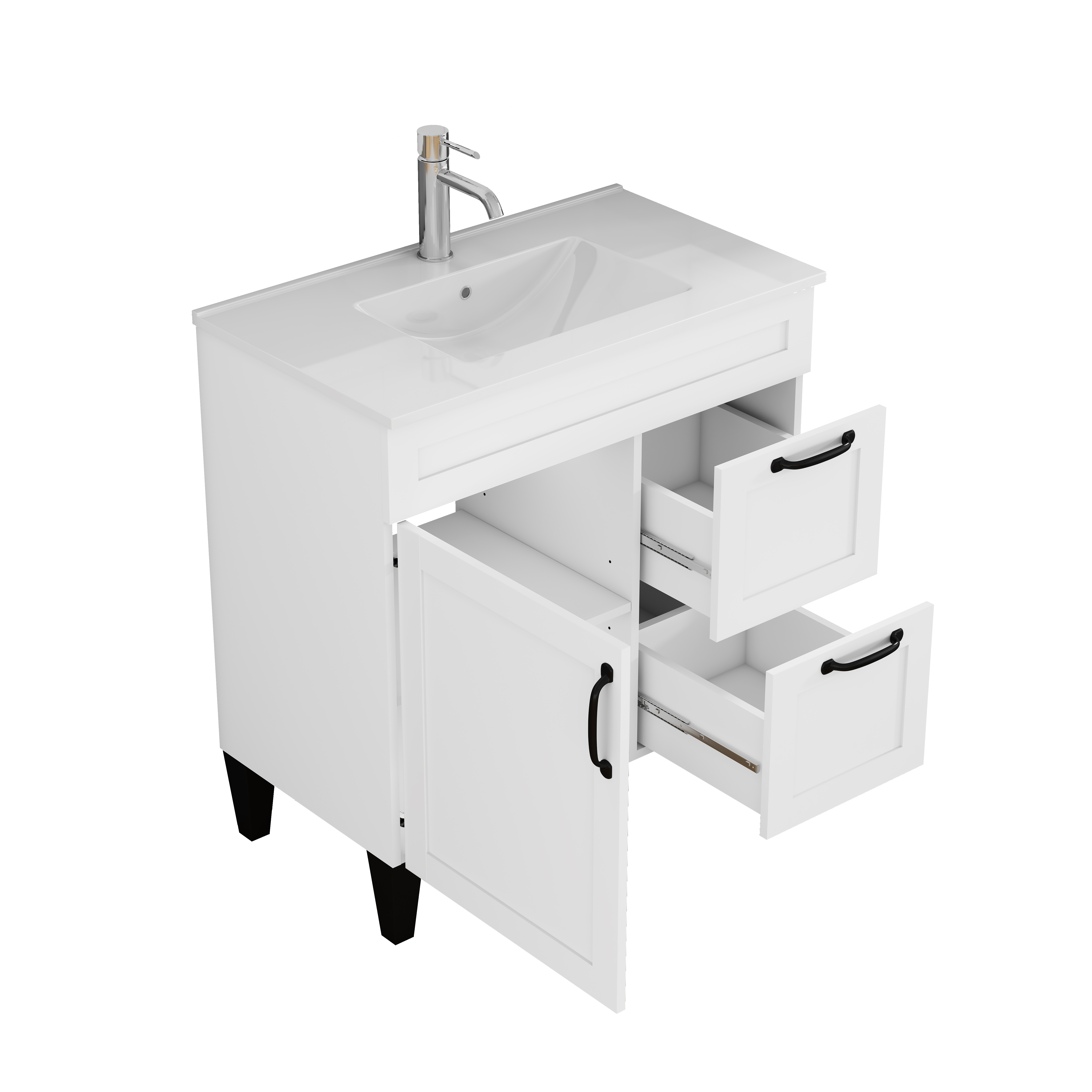 - Modern Contrast: Black Metal Handle & Black Feet:Featuring sleek black metal handles and black feet, this white vanity creates a striking contemporary look that elevates any bathroom decor. The durable metal handle provides a comfortable grip and adds subtle industrial charm, while the black feet offer stable support and lift the cabinet off the floor—simplifying floor cleaning and protecting against ground moisture damage. It turns a functional piece into a stylish focal point effortlessly.