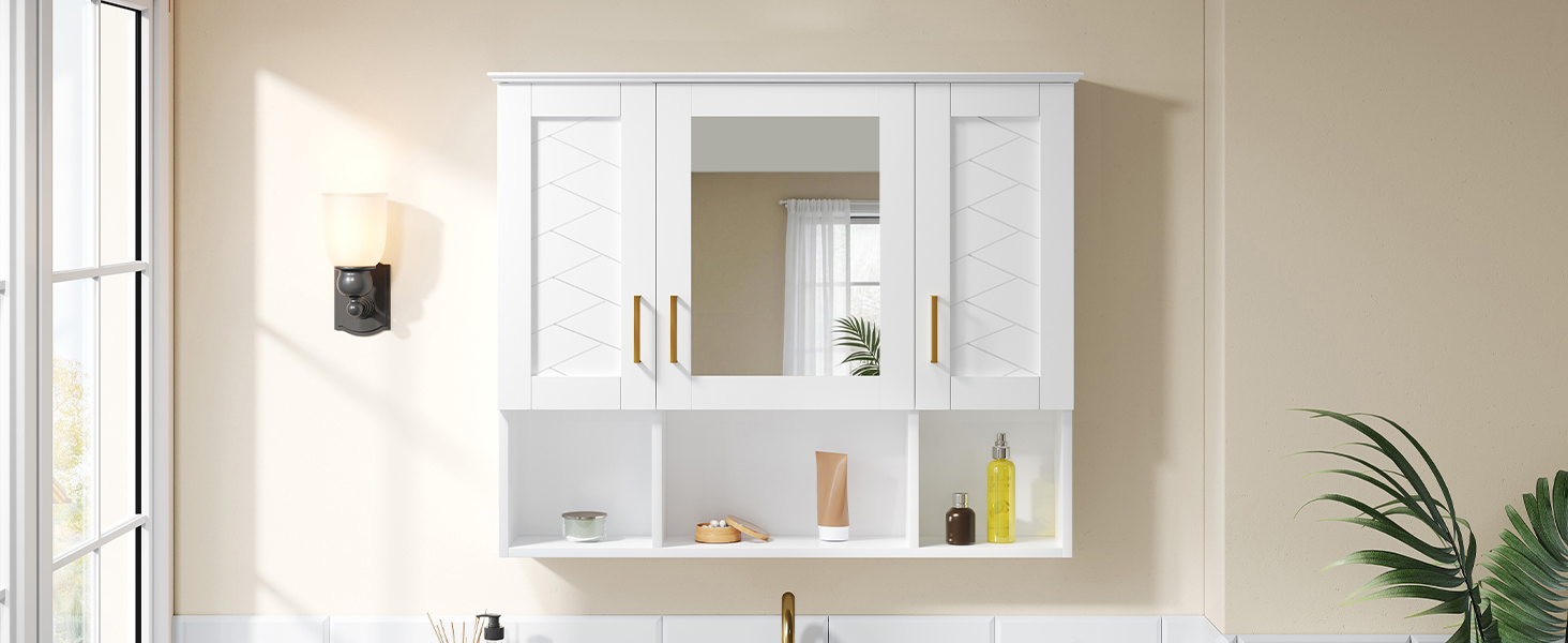 - [Crystal-Clear Reflection & Elegant Design] Our 2-in-1 Wall Mounted Mirror Cabinet begins with its core function: providing a perfect view. Featuring a high-definition mirror, it offers a flawless, distortion-free reflection for your daily routine. Beyond its practicality, the surface is artfully textured with intersecting sculpted lines, creating a sophisticated woven-line motif.
