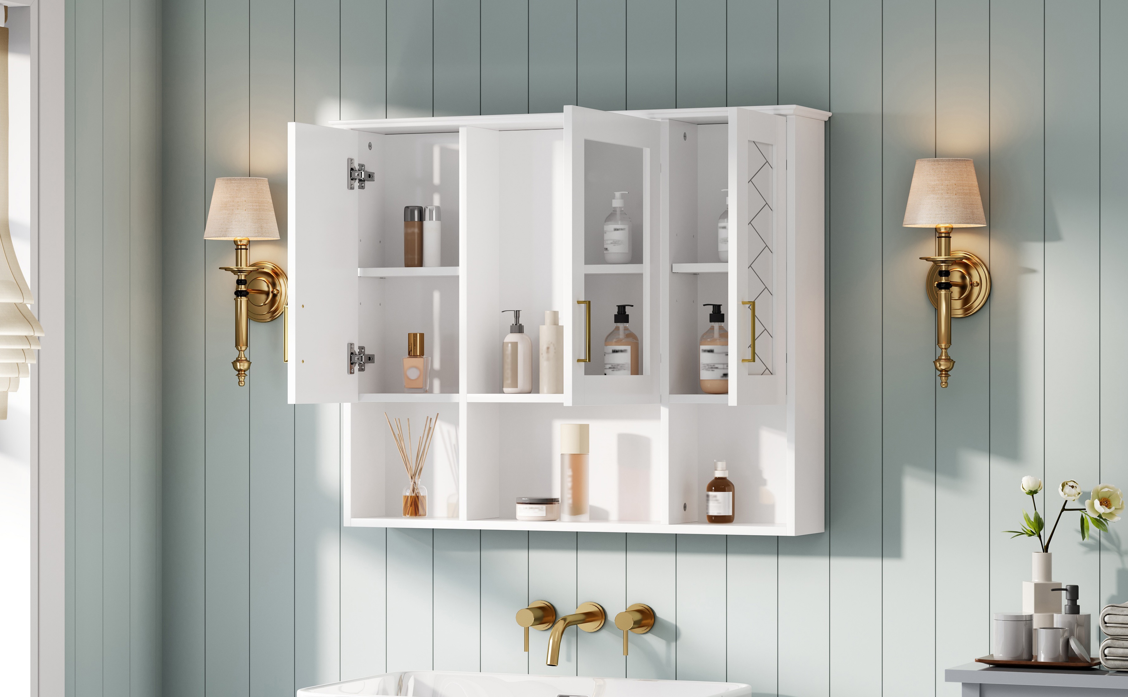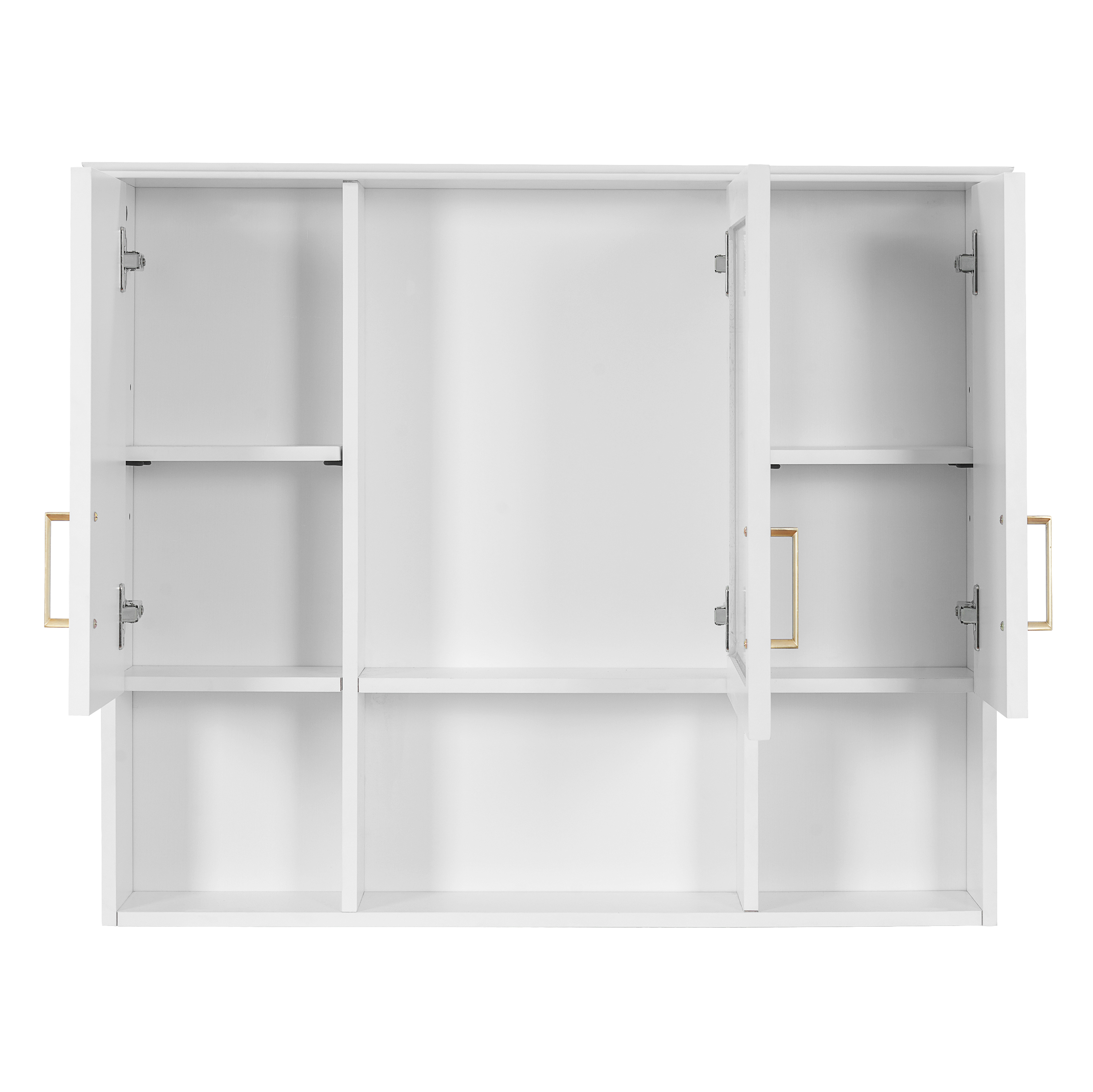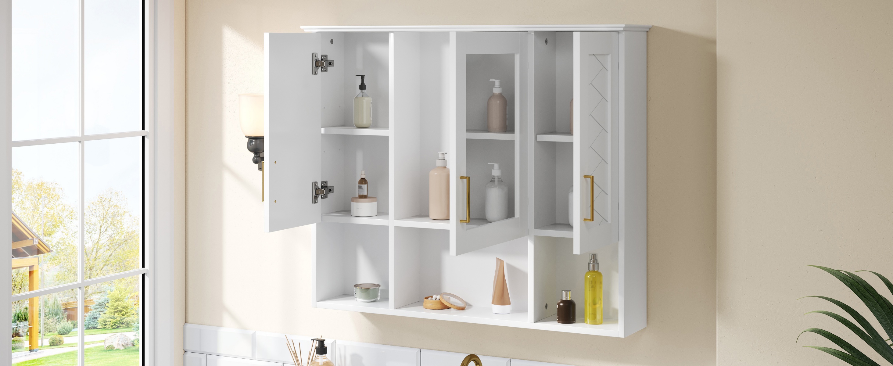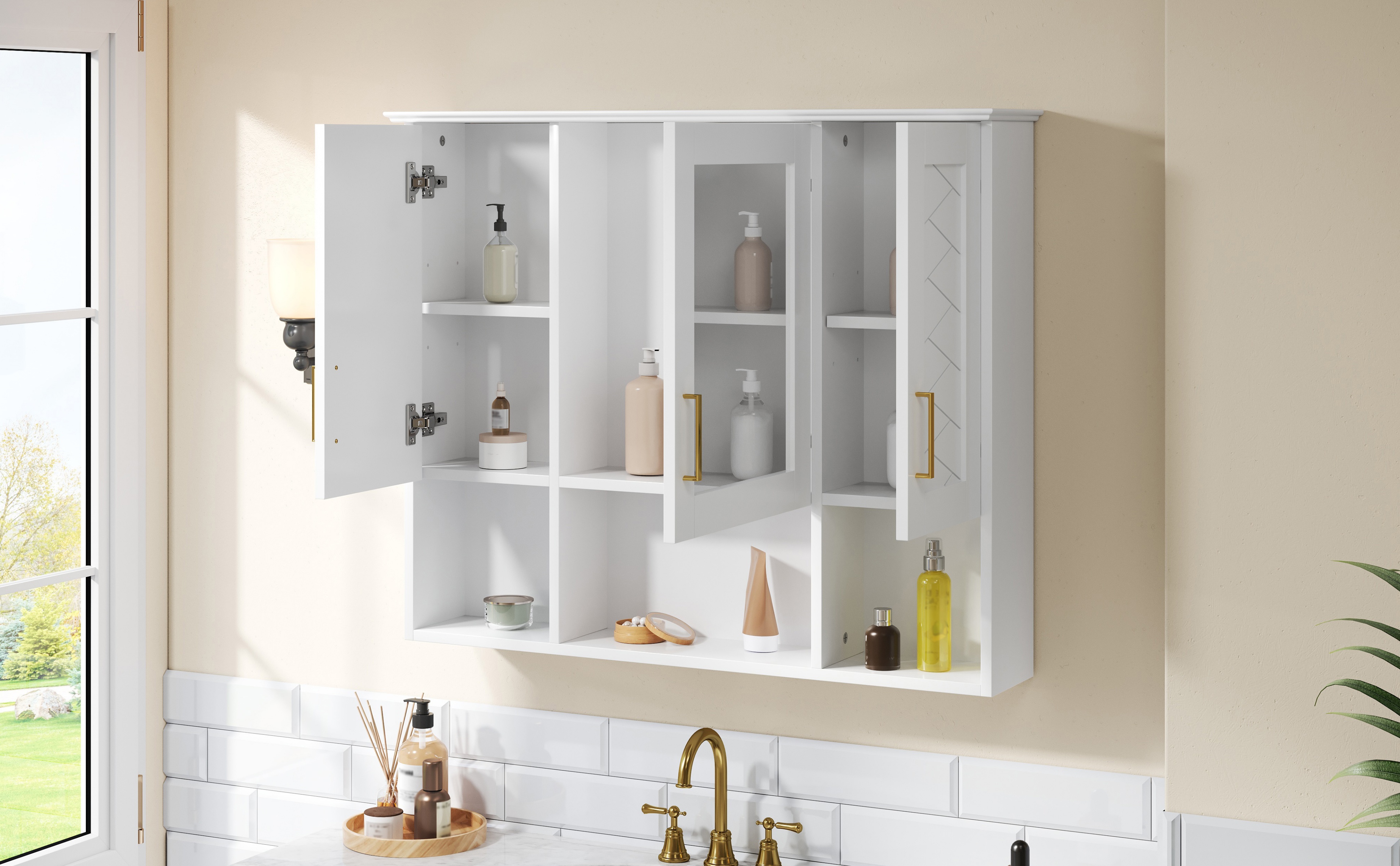 This wall-mounted mirror cabinet seamlessly combines elegant design with practical functionality. Its high-definition mirror provides a flawless, distortion-free reflection. Premium details including a sturdy metal handle, soft-closing hinges, and a refined top design ensure quiet operation, lasting durability, and a cohesive aesthetic that elevates any bathroom decor.