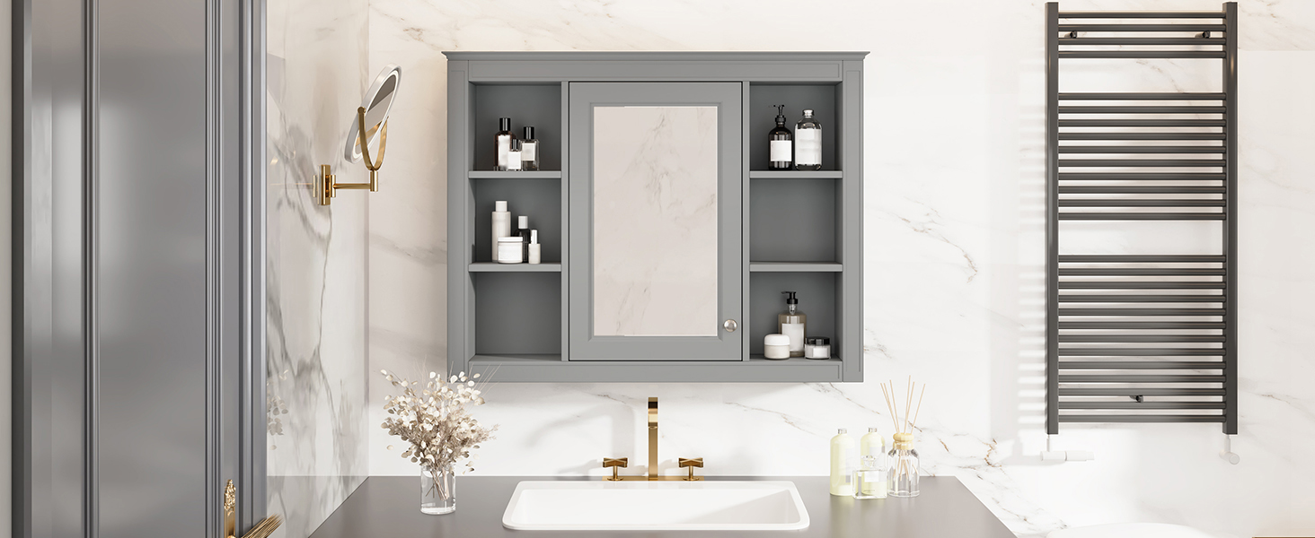 Product Name:35'' x 27.5'' Medicine Cabinet, Wall Mounted Bathroom Storage Cabinet, Modern Bathroom Wall Cabinet with Mirror, Mirror Cabinet with 6 Open Shelves (Not Include Bathroom Vanity )
