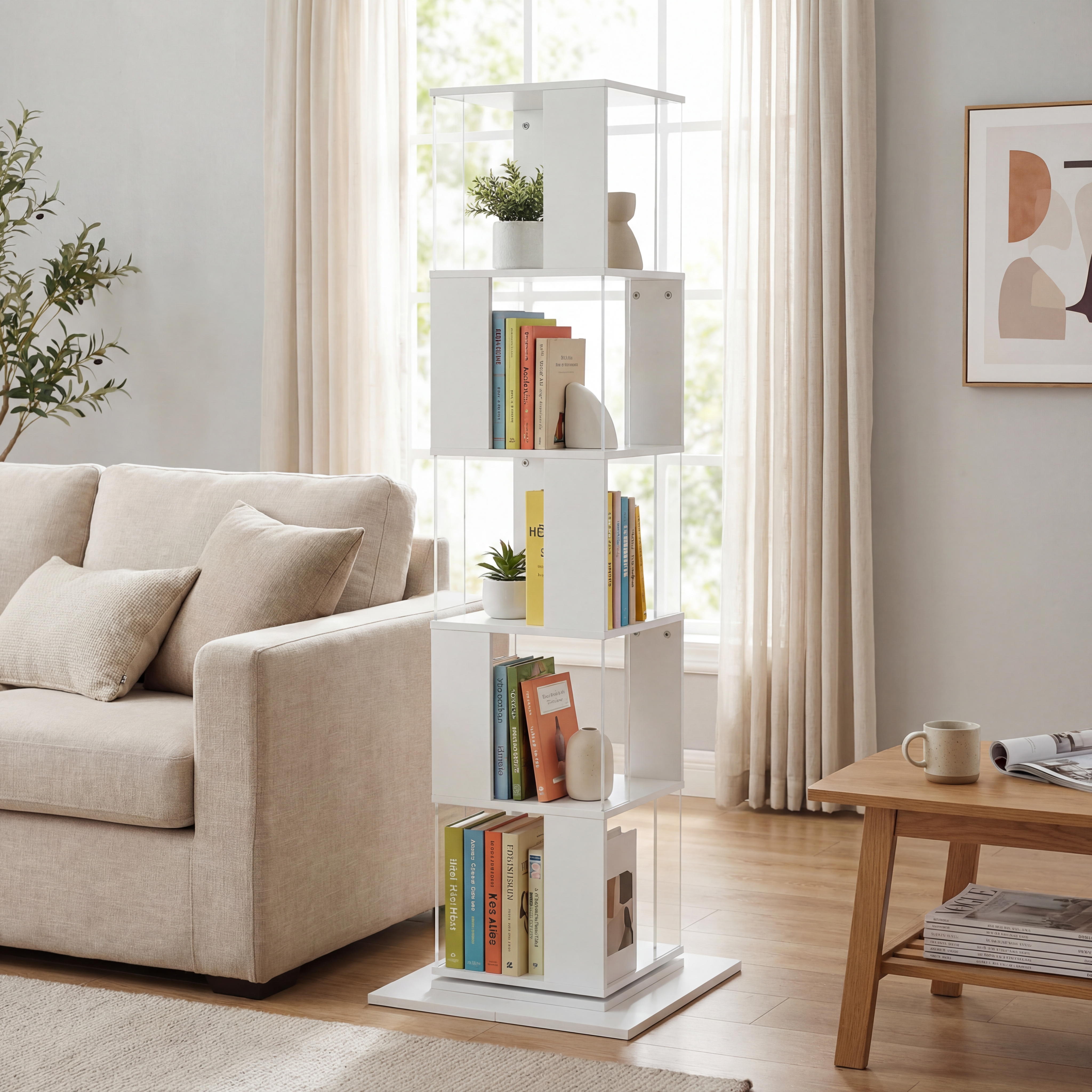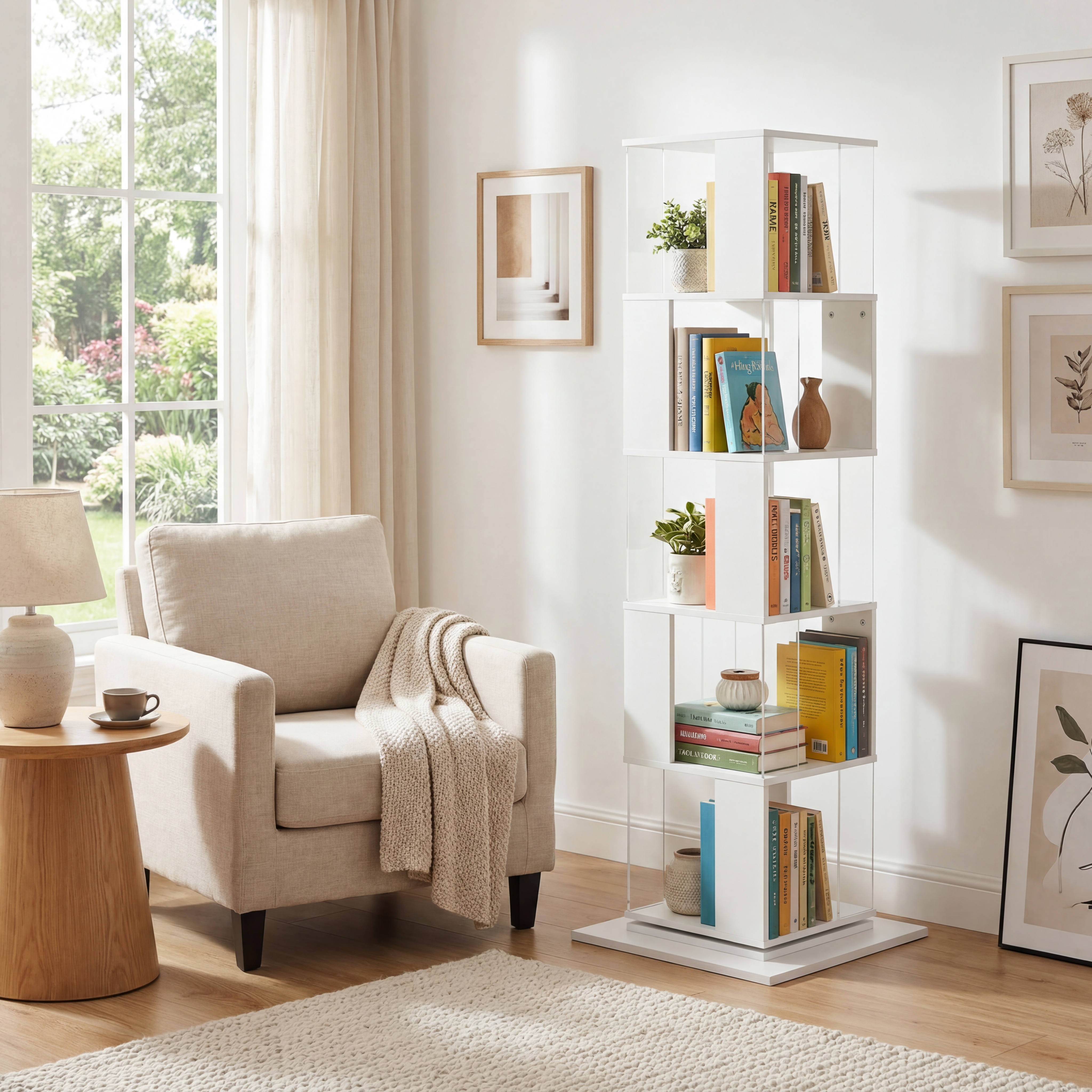 Specification Product Information Product Type :Single Box Product Product Name:360° Rotating Bookshelf with Acrylic Plate, 5-Tier Tall, Floor Rack Simple Bookcase, Modern Display Shelf for Living Room/Home Office/ Be...