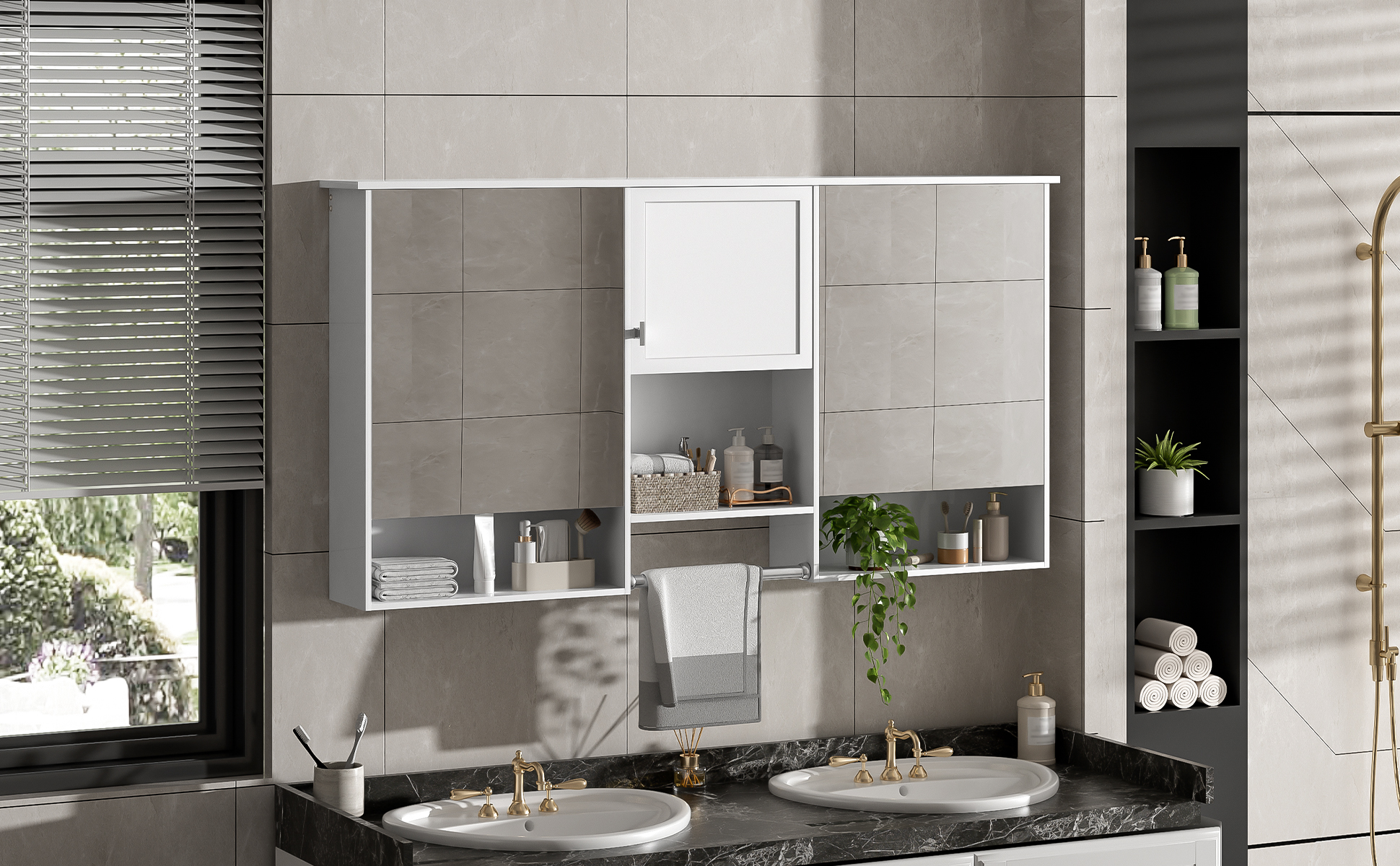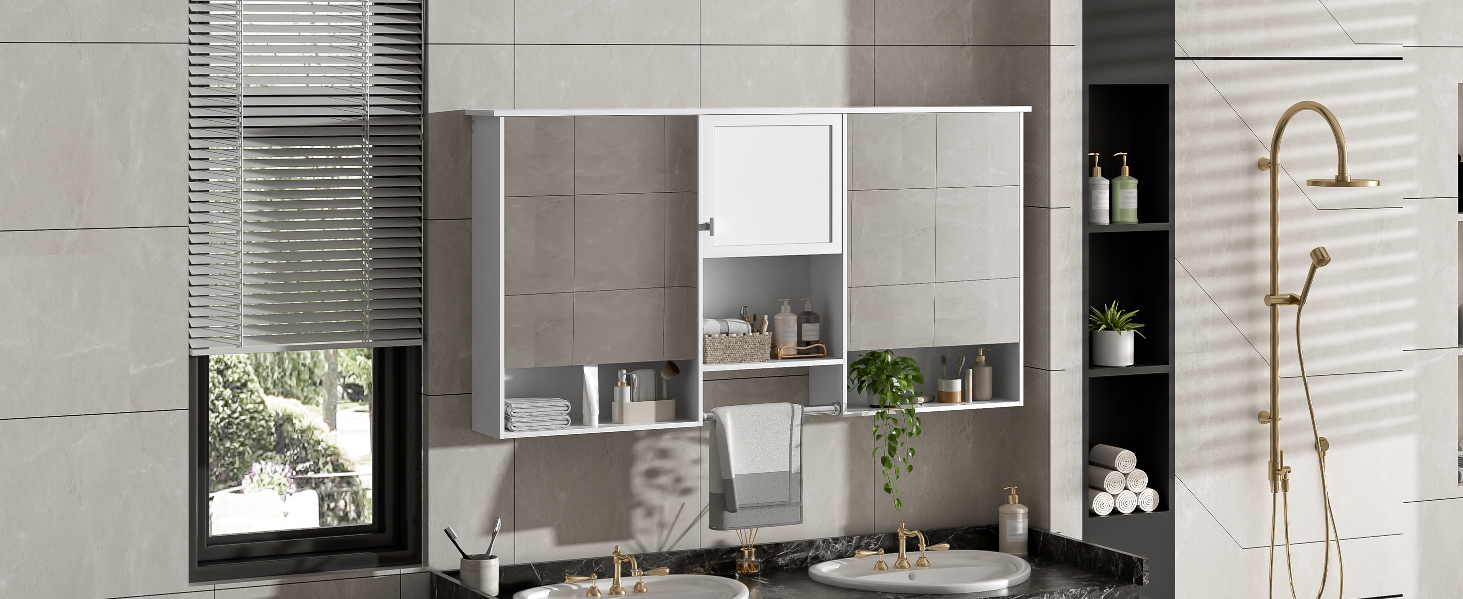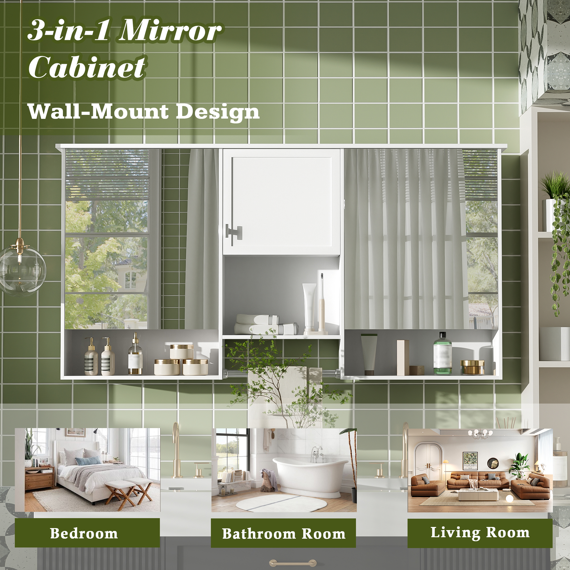 Product Name:55 inch Wall-Mount 3-in-1 Mirror Cabinet with Adjustable Shelf, Soft-Closing Hinges, High-Quality MDF, for Bathroom Vanity, Living Room, Bedroom Storage Organizer
