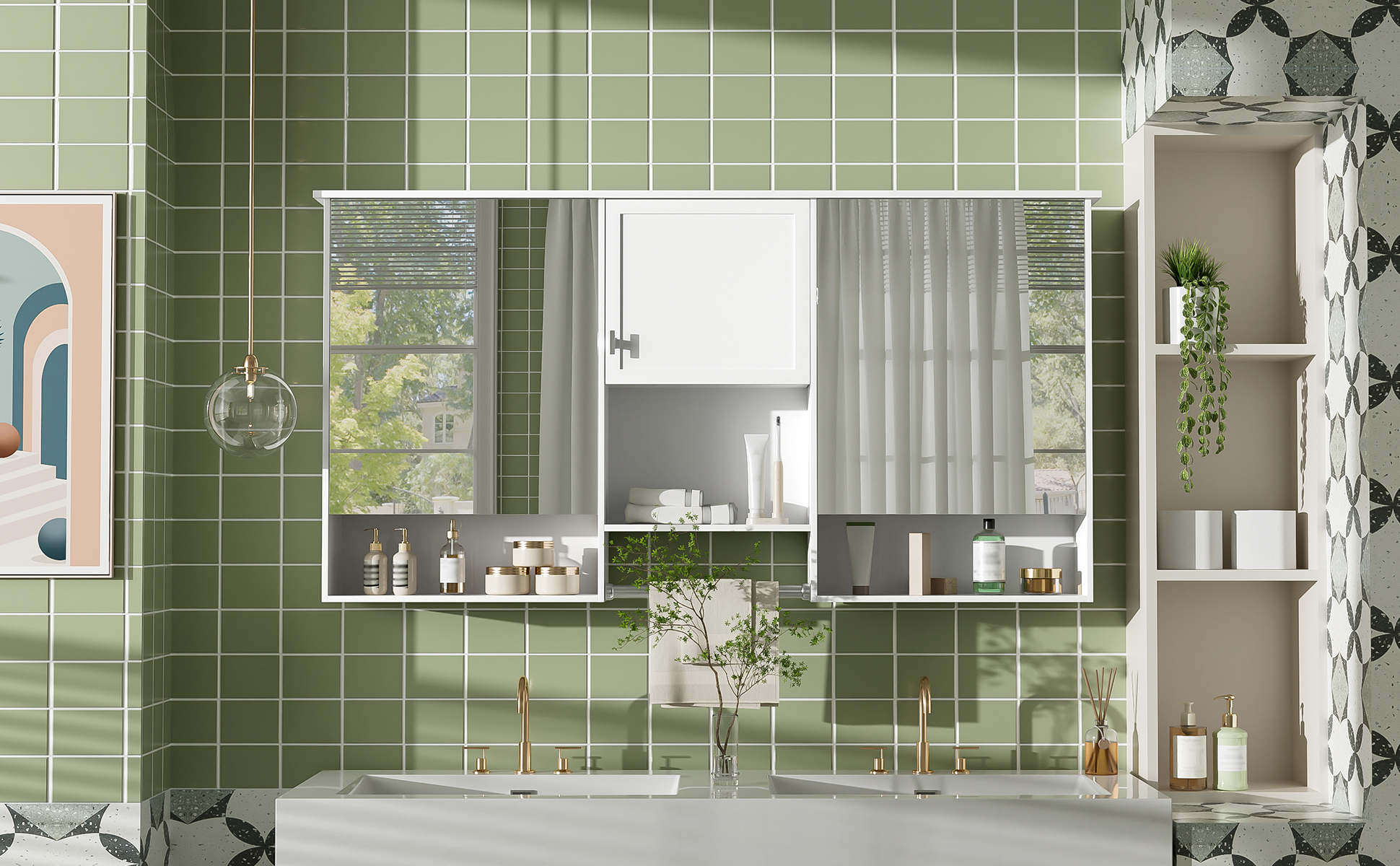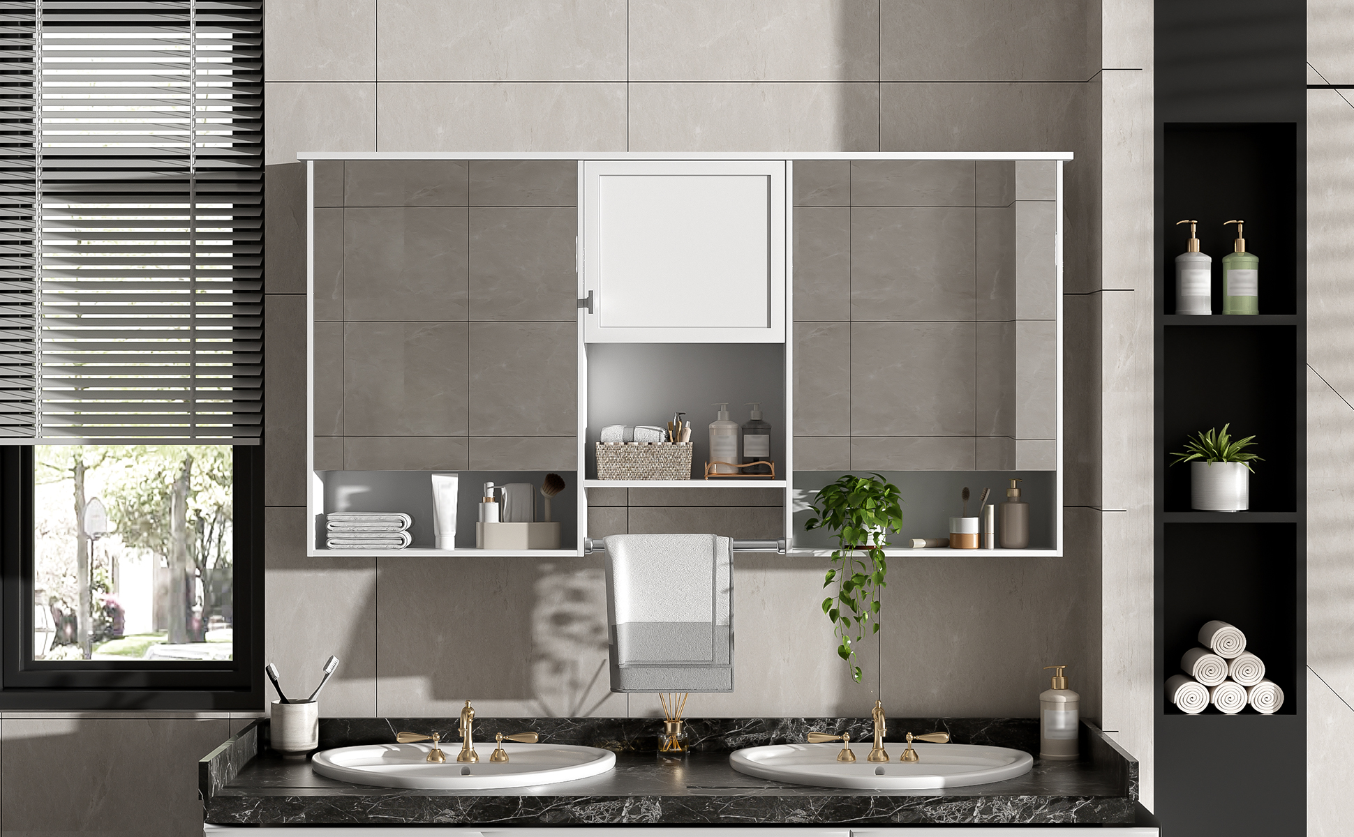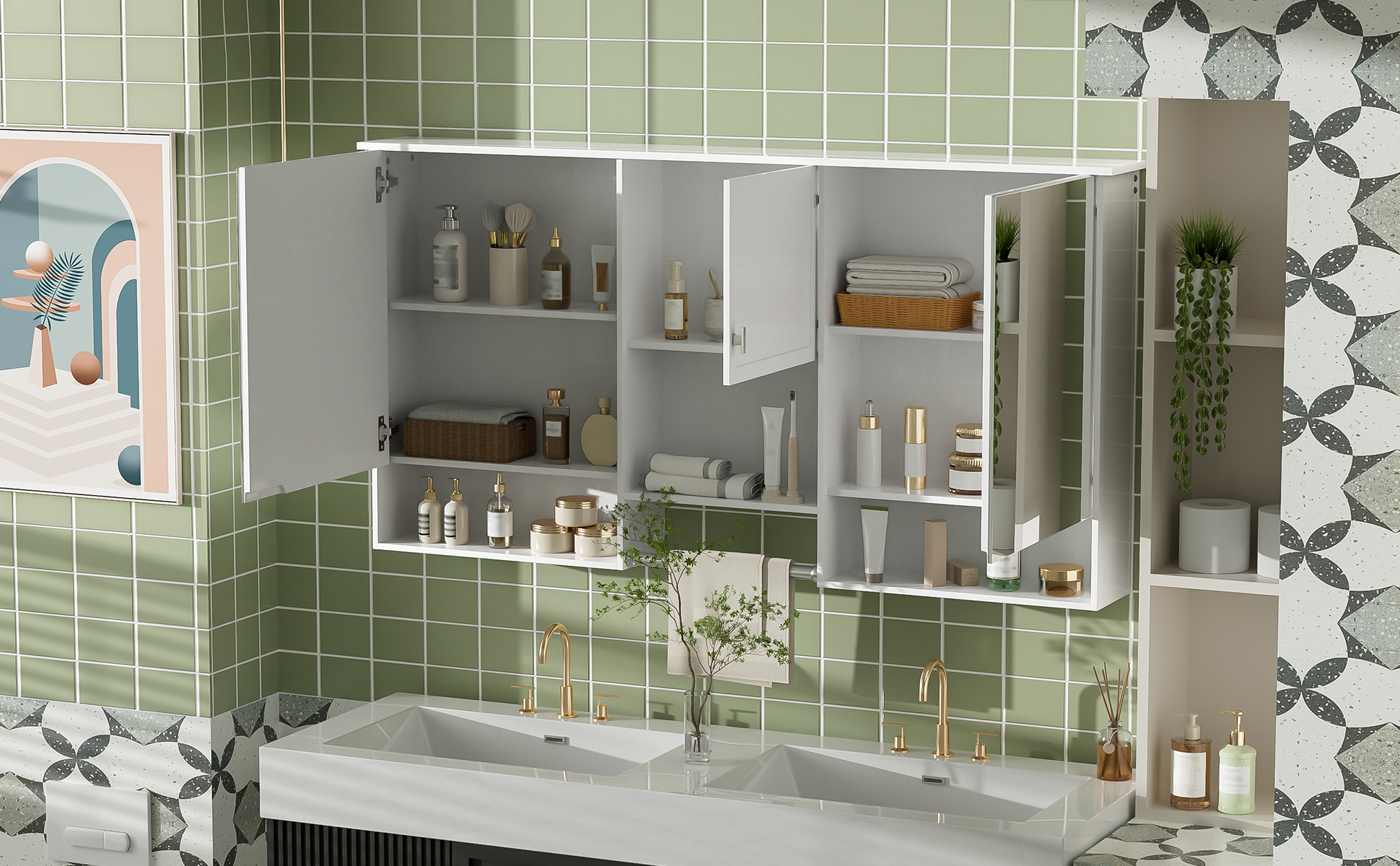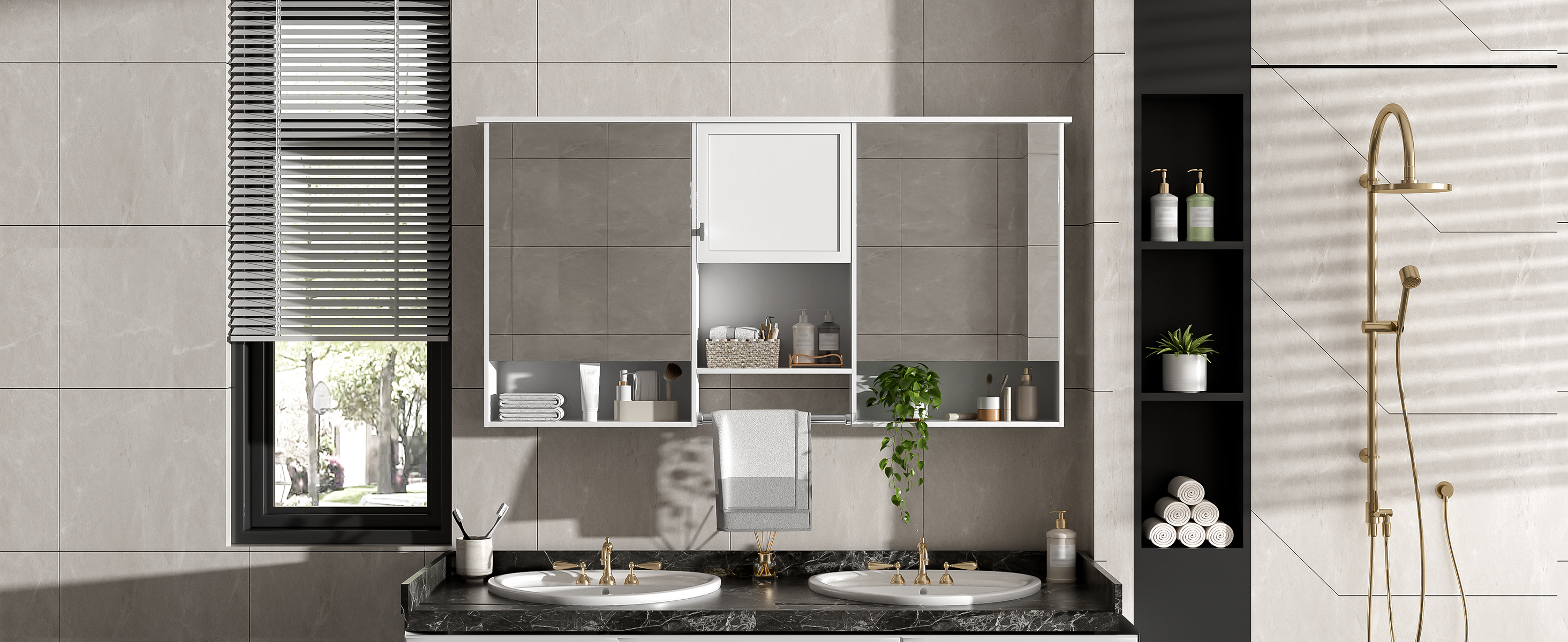 Product Name:55 inch Wall-Mount 3-in-1 Mirror Cabinet with Adjustable Shelf, Soft-Closing Hinges, High-Quality MDF, for Bathroom Vanity, Living Room, Bedroom Storage Organizer