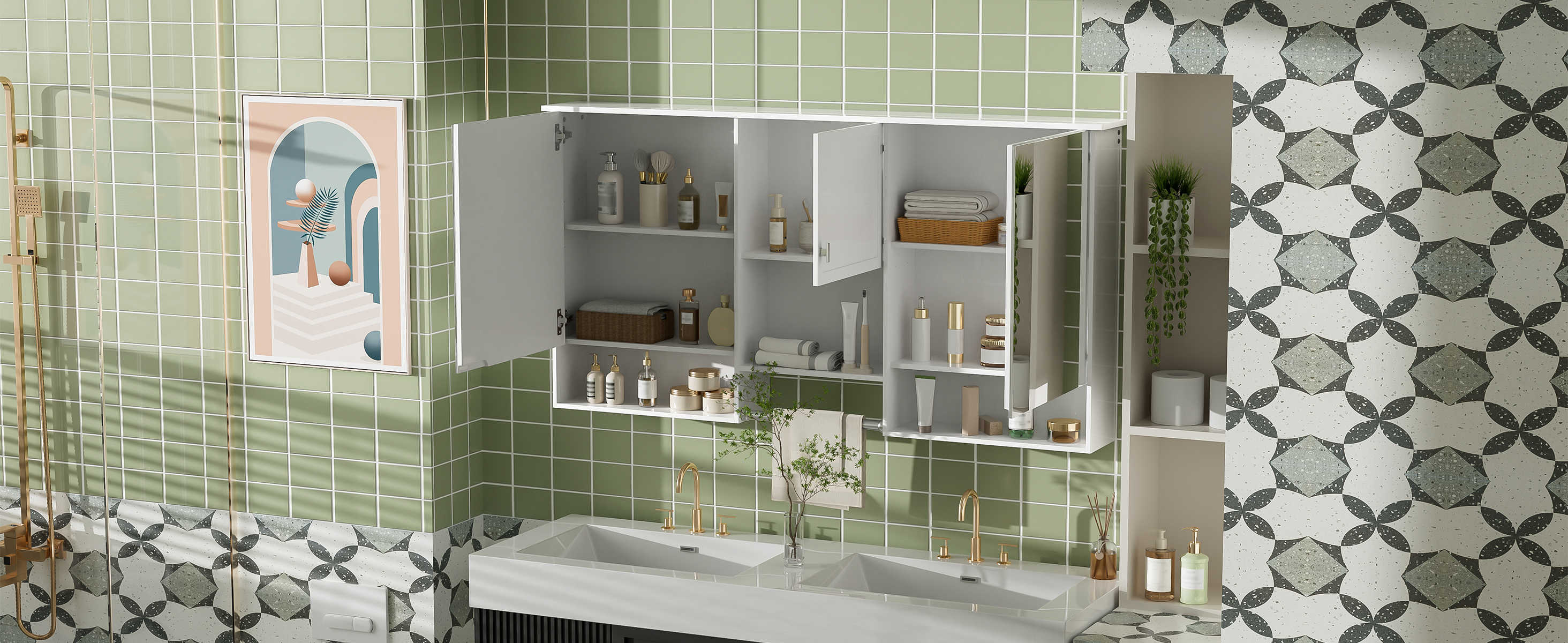 - [A New Dimension in Organized Storage] This versatile bathroom cabinet introduces a new dimension in organized storage, designed to adapt to your lifestyle. It features multiple organizer and storage options, including an adjustable shelf with three different height settings. Whether you need space for tall bottles or smaller essentials, you can customize the interior to fit your needs perfectly.
