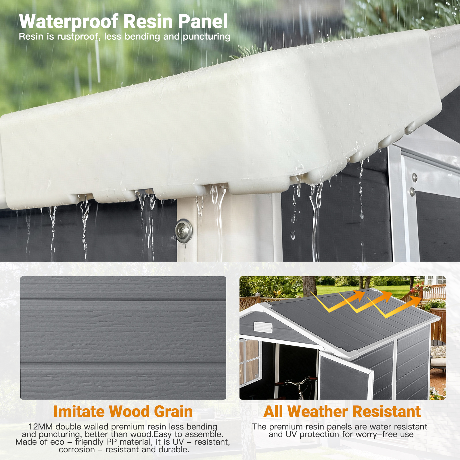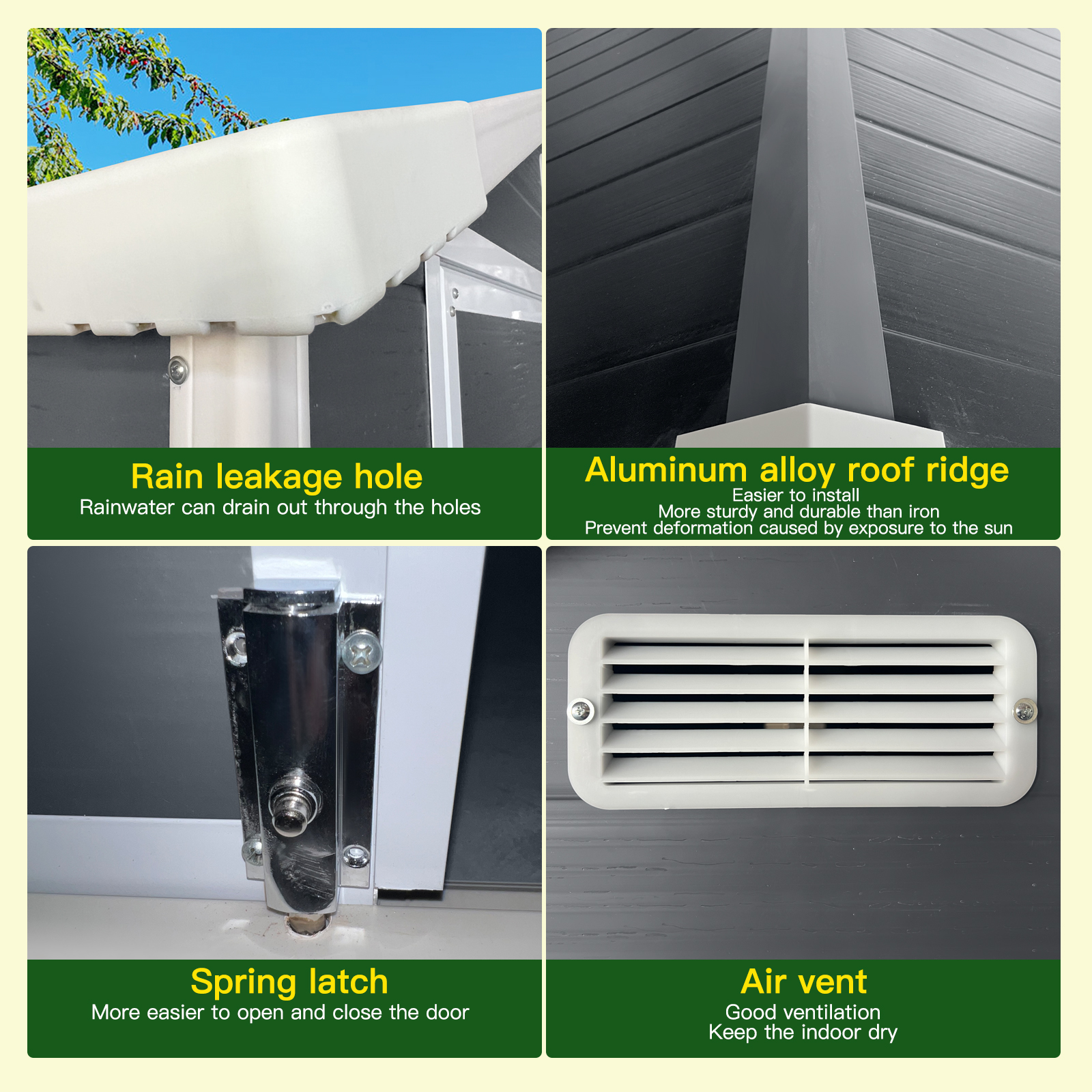 PP resin material - environmental, corrosion-resistant, lightweight and easy to install. It is waterproof, sun-resistant, and offers excellent insulation, complemented by an elegant appearance. With a 12mm thickness, the board ensures enhanced sturdiness after assembly, enabling it to withstand heavy wind and snow loads. UV stabilizers are incorporated into the panels to resist ultraviolet radiation and prevent aging. The frame and roof ridge are constructed from aluminum alloy, featuring an integrated interlocking design that is lightweight yet robust, rust-resistant, and more stable than alternatives. It is easy to install and won’t crack under prolonged sun exposure. The four corners adopt an advanced leak-proof hole design to avoid water accumulation. The door latch utilizes an automatic snap mechanism for effortless use, while built-in ventilation ports maintain dry indoor air over time. Fewer screws simplify the installation process. The product offers spacious storage capacity, balancing practicality with aesthetic appeal. Side windows allow natural light to permeate, and the sloped roof design prevents water and snow buildup.