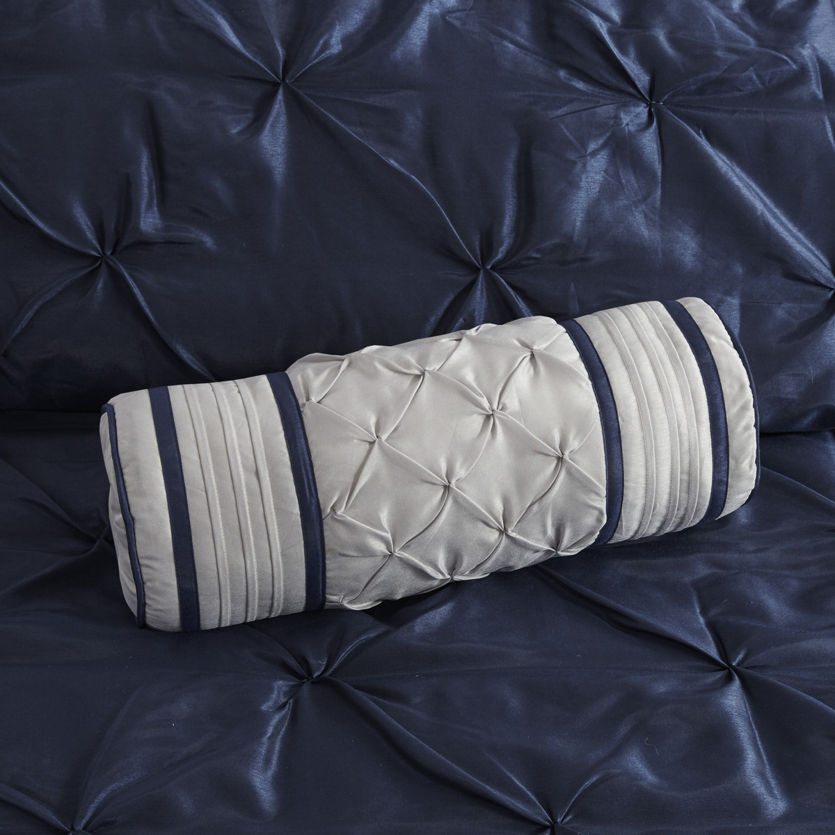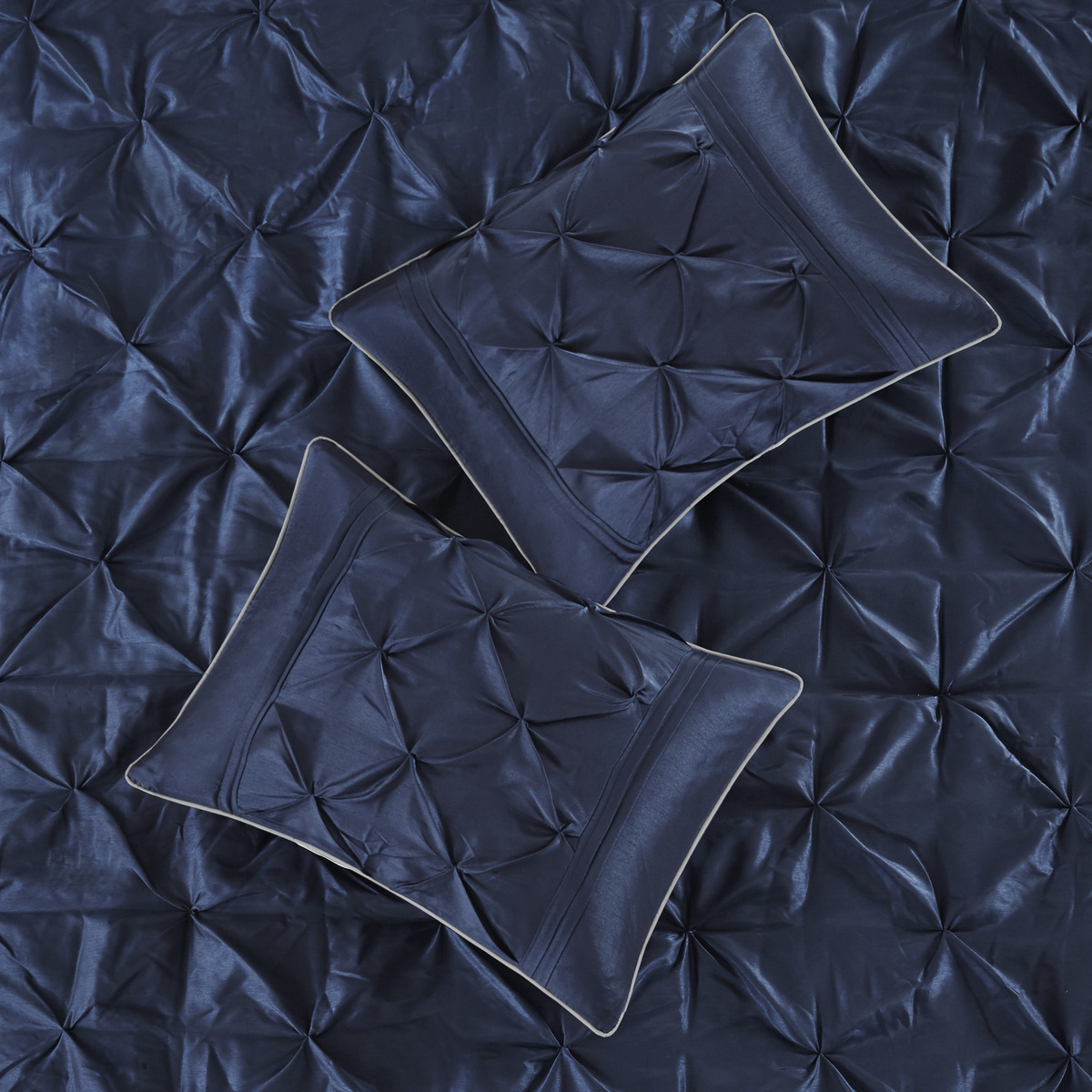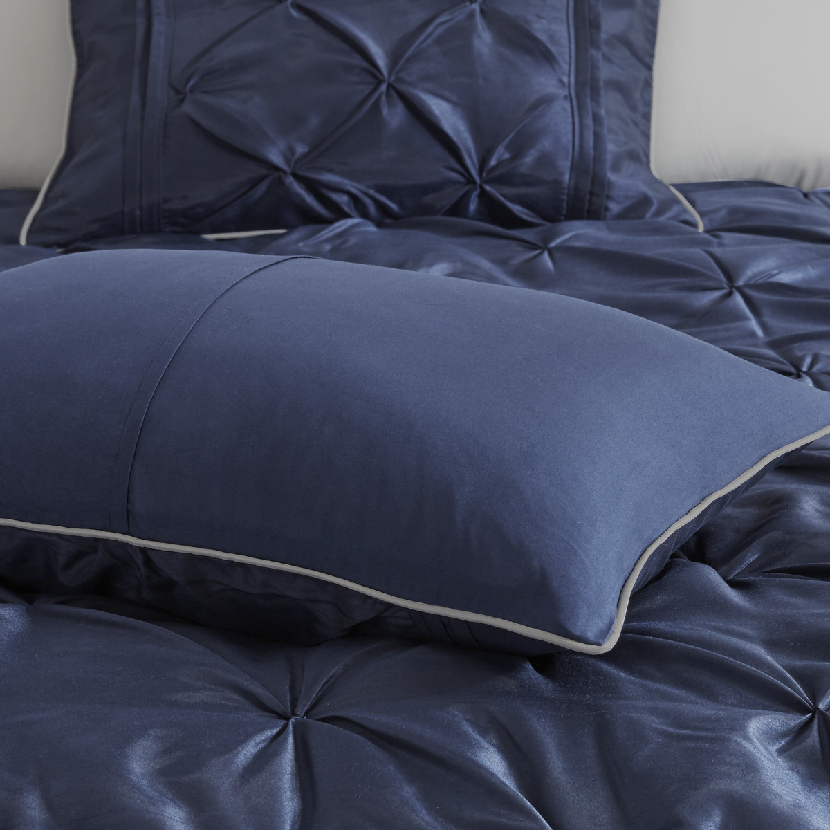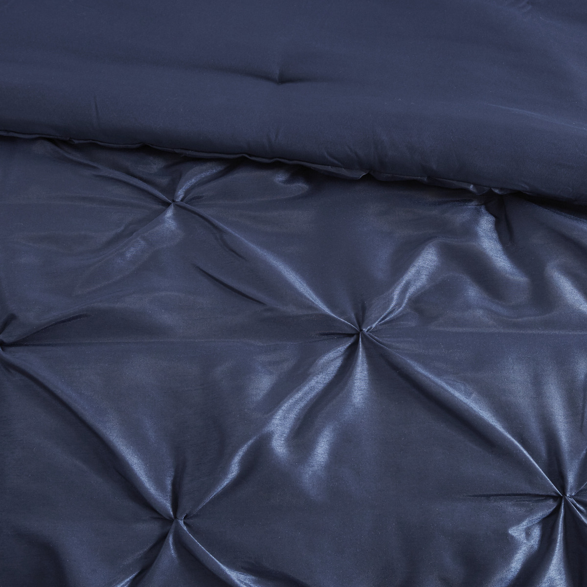 This utifully tufted bed is from the bedding collection. Its deep navy co ng makes this set create a statement in your bedroom. The collection is made from 100% polyester po i and has pieced fabric sewn together to give this set dimension. It is finished with a smooth edge of fabric that creates a utiful border around this comforter. Items in the set may come in a rolled or compressed packaging, which will need to be fluffed up or steam ironed before use to remove wrinkles.