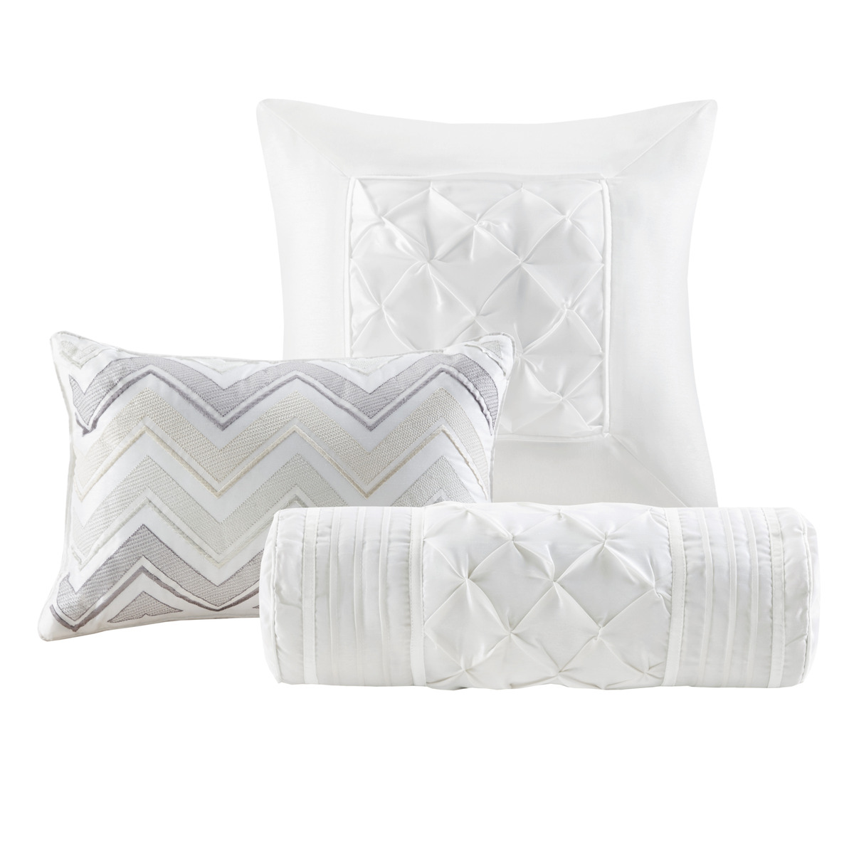 - Set includes 1 comforter, 2 matching shams, 3 decorative pillows and 1 bed skirt