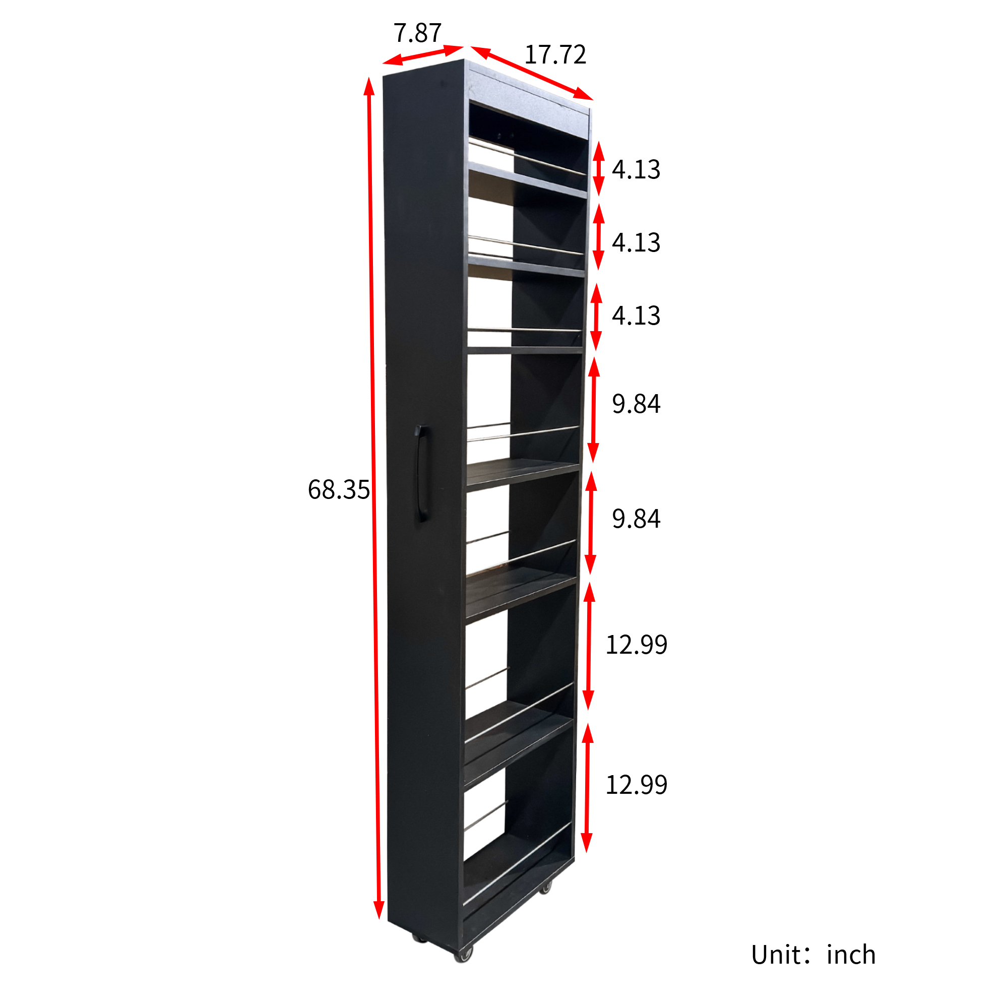Versatile Storage: This 7-tier multi-functional pull-out multi-tier storage shelf offers ample space to organize and store kitchen or office essentials in a compact footprint. Ample Storage: With 7 open shelves, this organizer provides ample space to store and display pantry items, bottles, jars, and more.Convenient Handle: The handle allows for effortless maneuverability when transporting the shelf. This storage shelf is only 7.80 inches wide, designed perfectly fits between refrigerator/counter, washer/dryer, or tight corners. Maximize every inch of space in your home, it is a small house storage savior. Different Height Storage Space.With 7-tier open shelves and an added top, this narrow kitchen cart can accommodates all of your essentials easily to make your room neat and clean, and it have two protection bar on each tier, so you do not need to worry about items falling. Mobile Shelving: Equipped with smooth-rolling casters, this utility cart allows you to easily move items from room to room. Material:Material is 15mm particle bpard,back board is 3mm MDF.Made of wooden structure with melamine finish for durability and easy maintenance. Aufgrund des Lichts oder der Anzeige kann die Farbe des tatsächlichen Produkts geringfügig vom Bild abweichen.