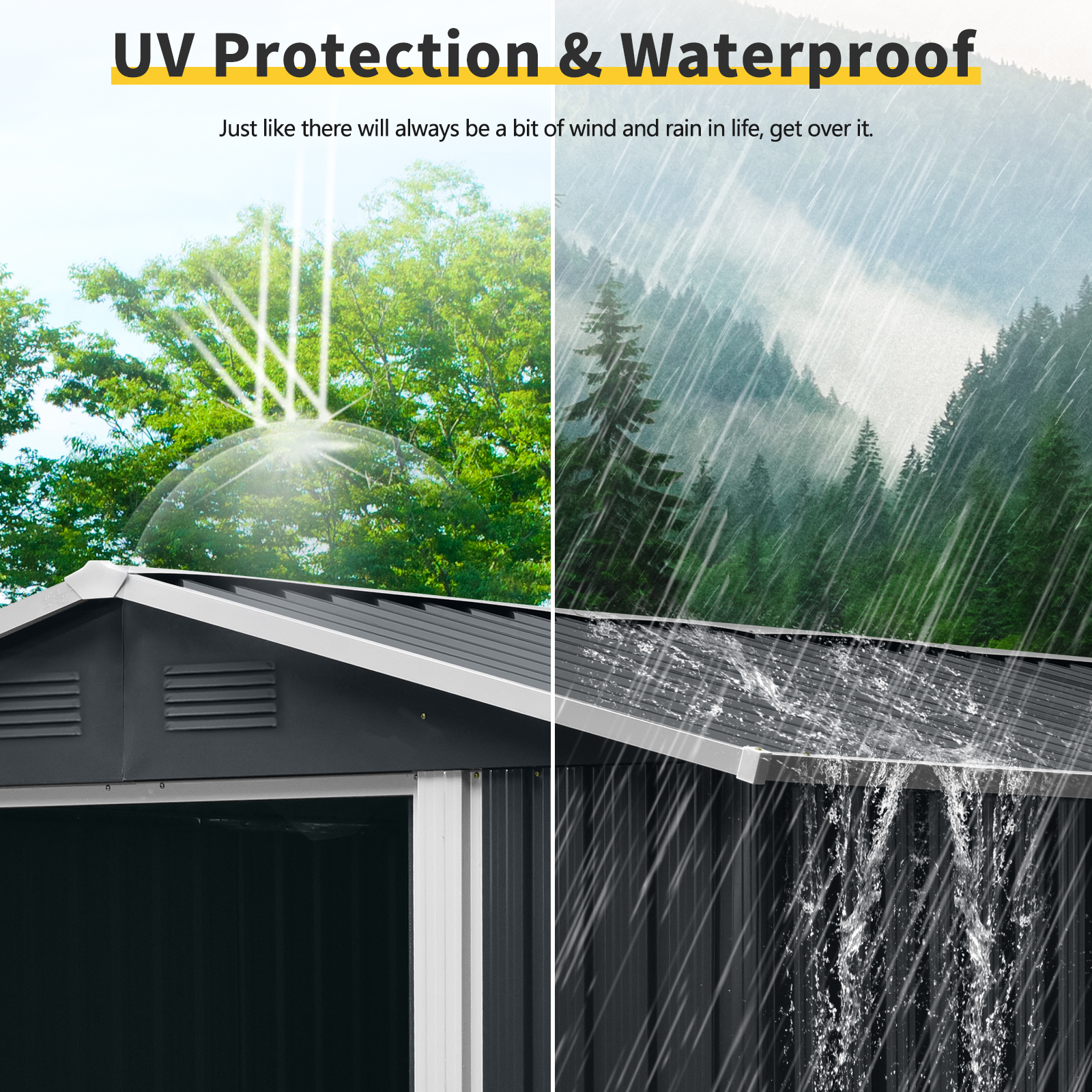 - [Gift Tool] Metal Foundation Frame,Anchors,Hooks,Shelf,Lock(padlock),Gloves Easy-build shed made of Electro Galvanized Steel treated for strong corrosion resistance. UV resistant steel panels protect against rot, insects, and extreme weather conditions.