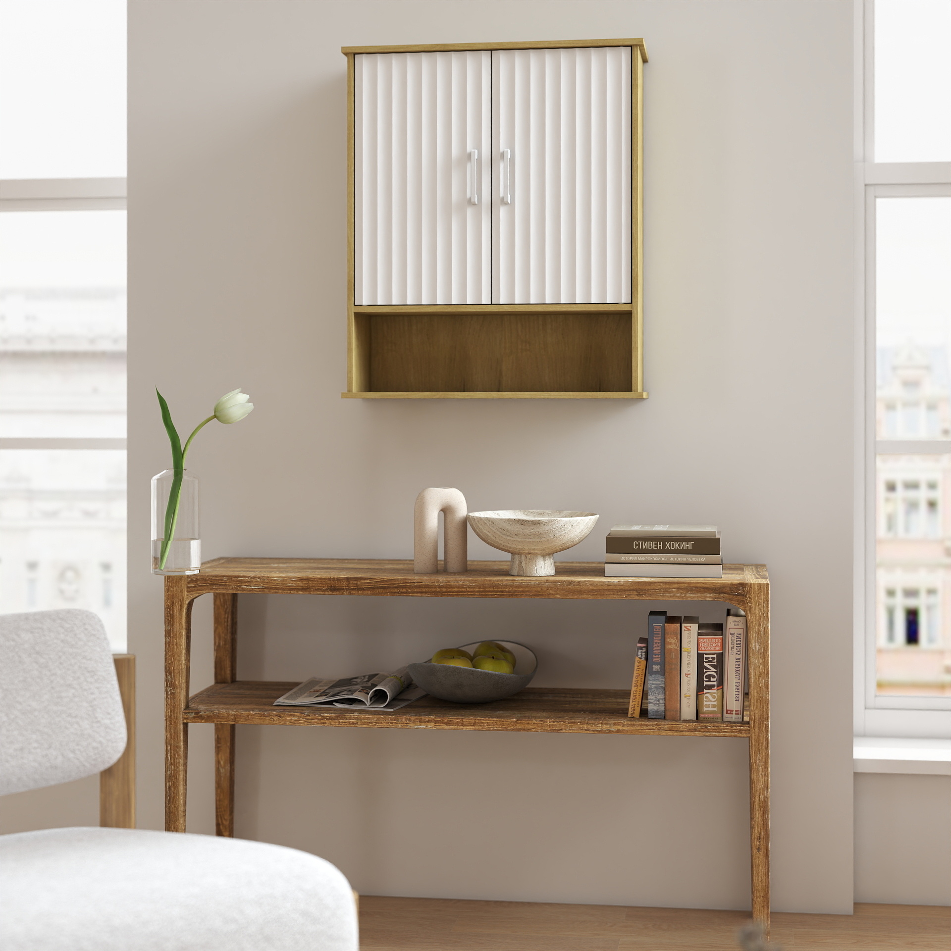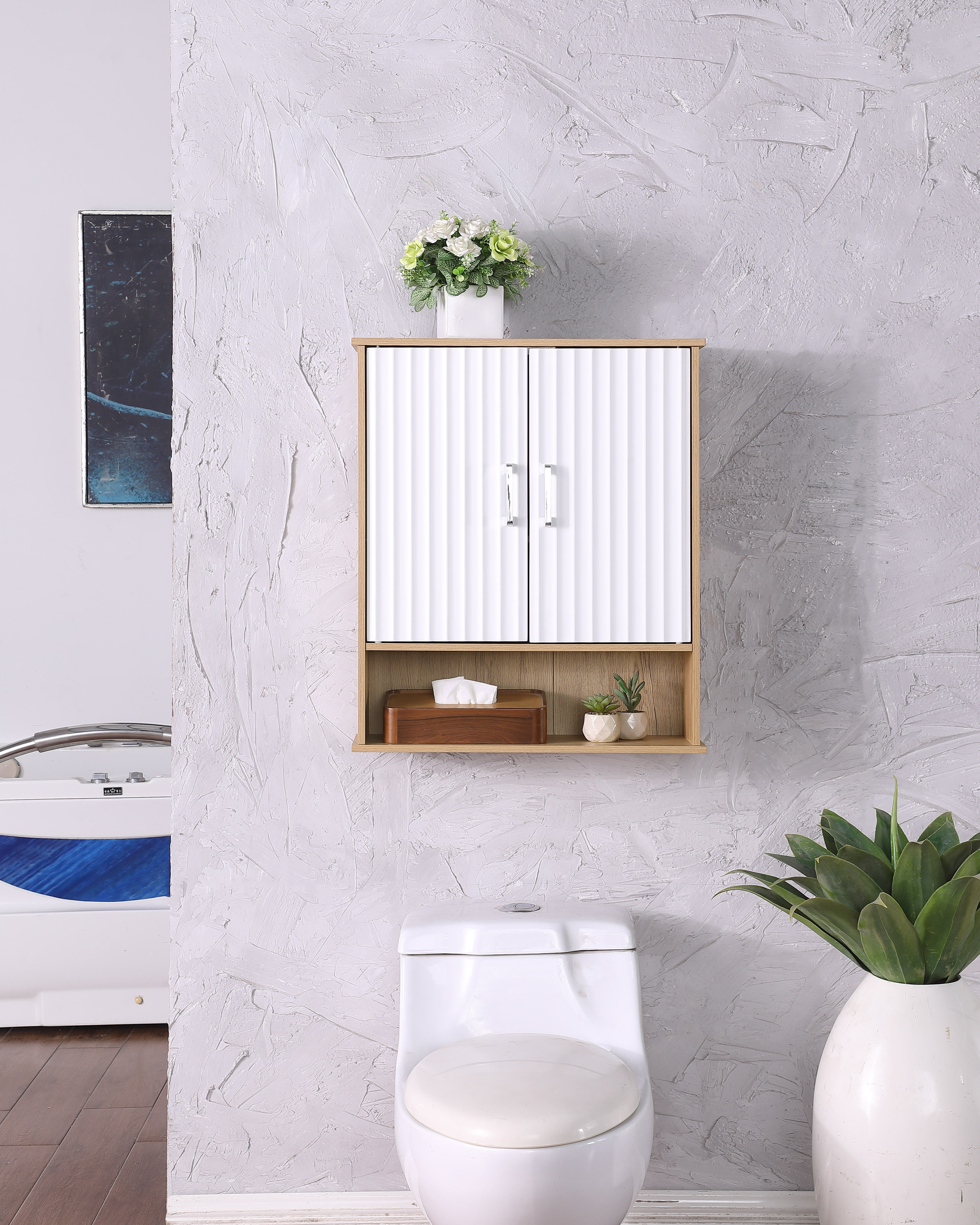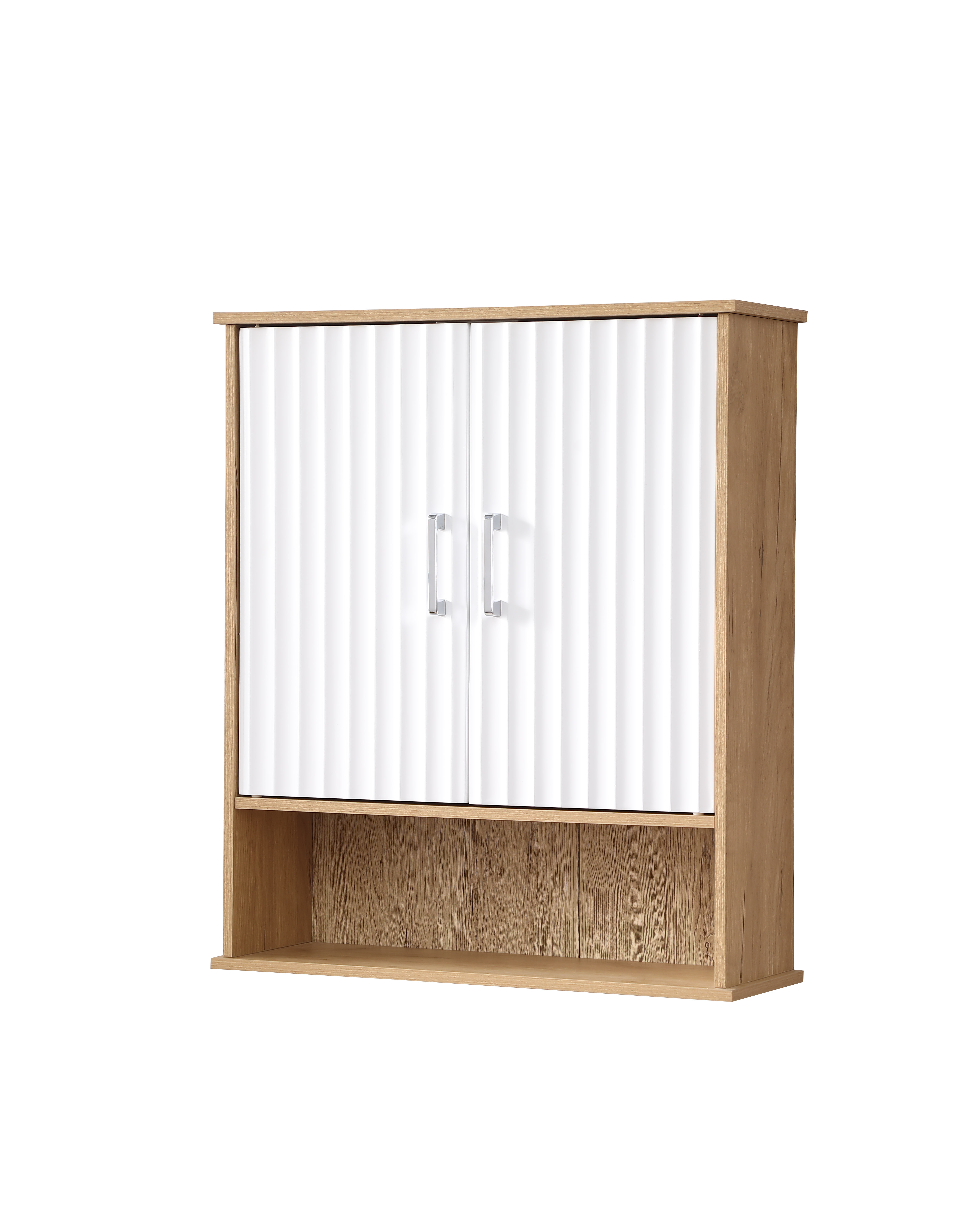 Product Name:Bathroom Wall Cabinet with Double - Door, Bottom Shelf, Wavy - Patterned Doors, Adjustable Inner Shelf, Easy Installation, White & Natural Wood