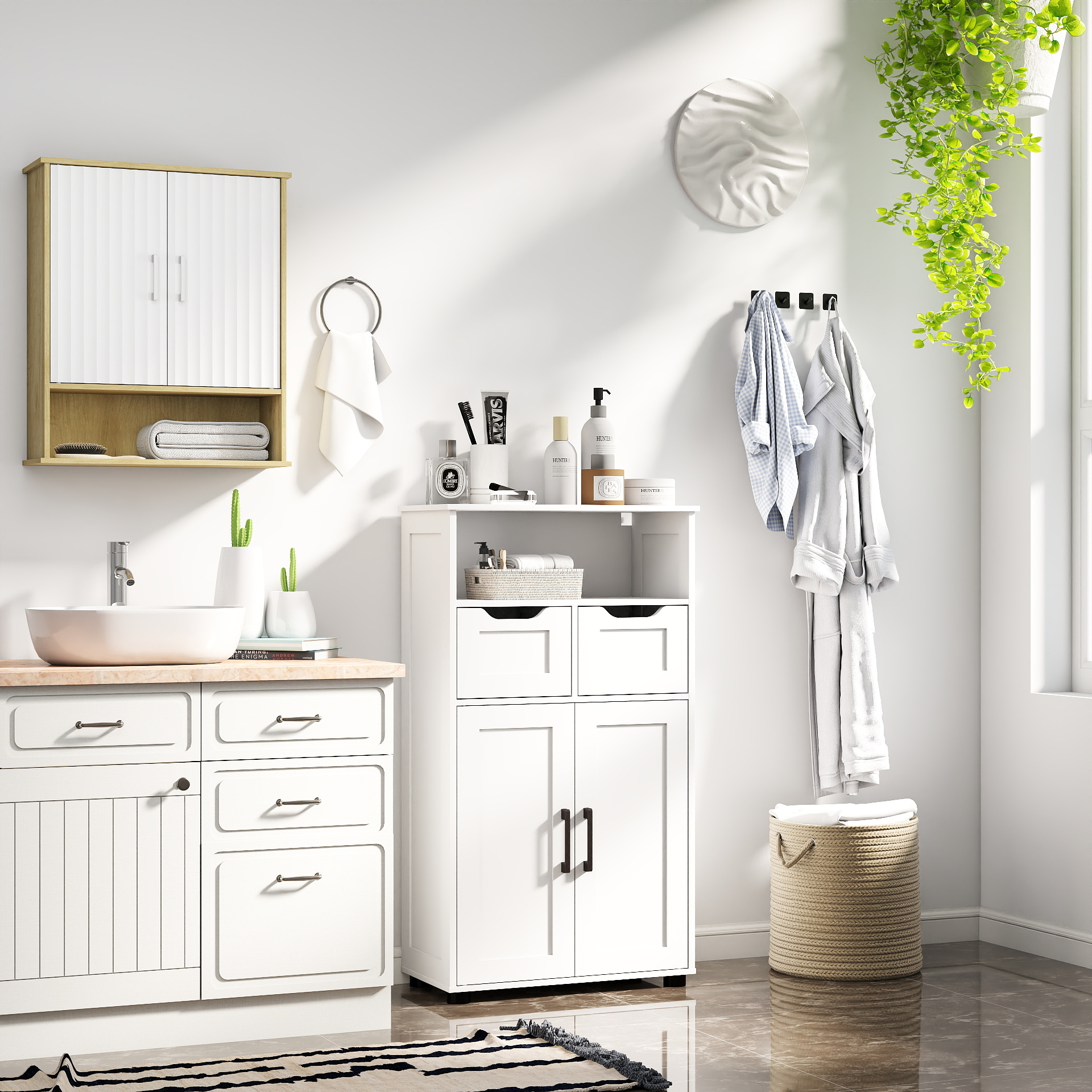 - Smart Storage Solutions:Designed with dual doors and a bottom shelf, this cabinet offers ample space to organize all your bathroom essentials. The adjustable interior shelf allows you to customize the storage to fit your needs, keeping your bathroom clutter-free and organized.