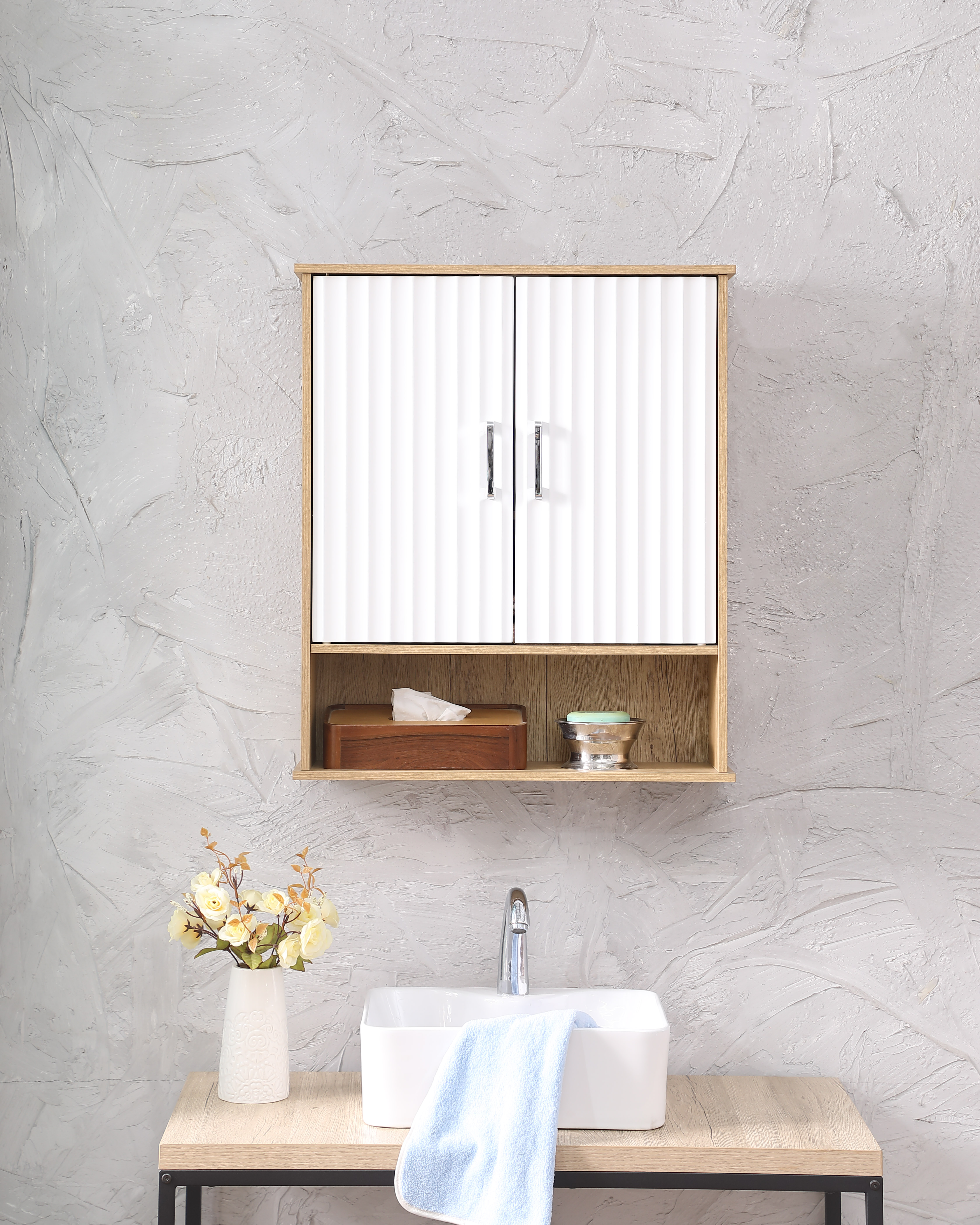 Specification Product Information Product Type :Single Box Product Product Name:Bathroom Wall Cabinet with Double - Door, Bottom Shelf, Wavy - Patterned Doors, Adjustable Inner Shelf, Easy Installation, White & Na...