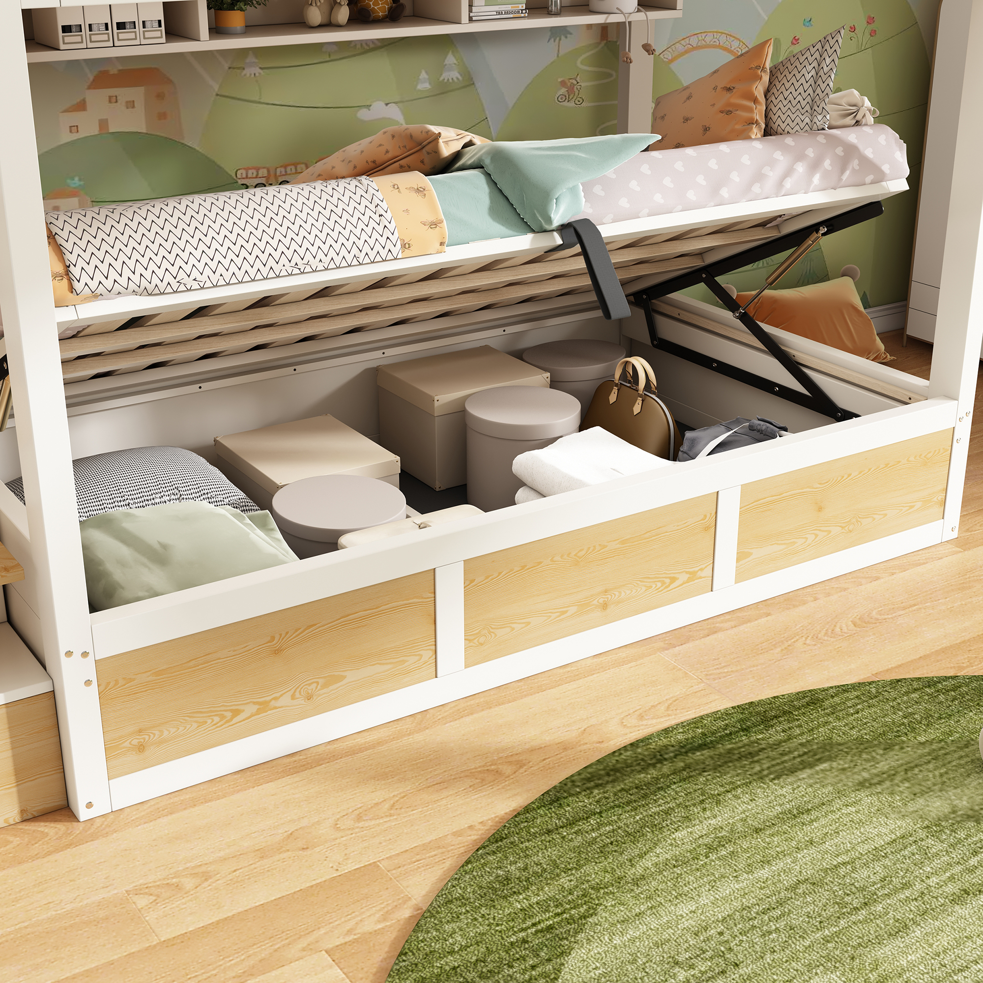 - ⭐【Charming Cabin Look】This bunk bed impresses with its white and wood color scheme. The upper bunk features a surrounding safety rail, while the lower bunk's frame is equipped with a hydraulic system, straps, and a non-woven fabric backing, allowing for optimal use of the storage space underneath. Above the lower bunk are three open hanging baskets with rounded corners for added protection – ideal for displaying crafts or family photos.