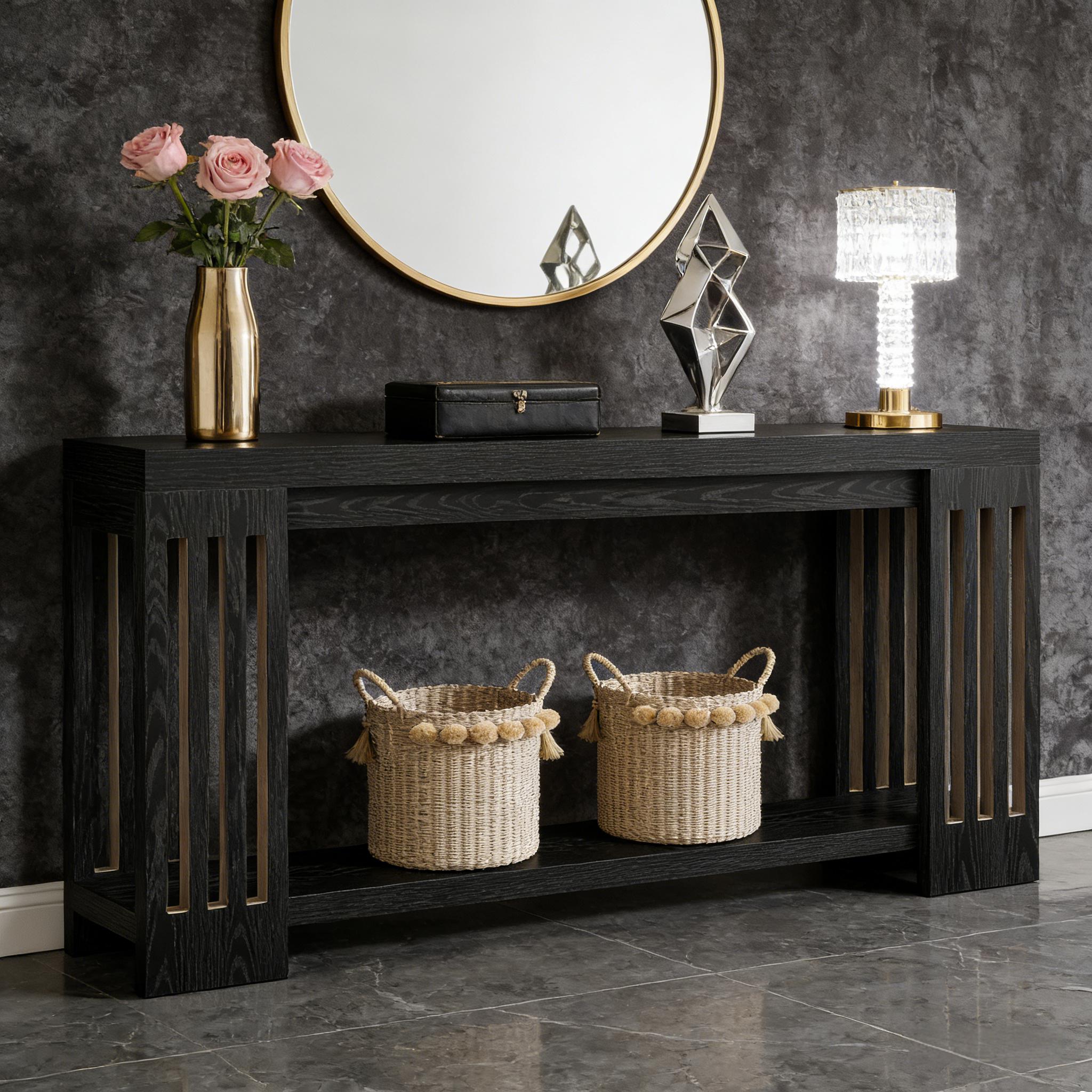 Important Reminder!!! 1) Attention: All products in our store do not support Canada self pickup ordering. Please do not create shipping labels for Canada. Our American products do not support self pickup to Canada 2)We do not ship to Alaska, Hawaii, US protectorates (e.g., Puerto Rico), P.O. boxes, or APO/FPO addresse 3)We don’t accept non-defective remorse returns Durable Structure - Made of premium E1 MDF, this extra-long console table boasts durability and stability, holding a variety of items without any concerns. Farmhouse Charm - With a classic farmhouse-inspired design, this 2-tier entryway table sports vintage vertical stripe legs, adding warmth and style to any room. Ample Storage - With dimensions of 11.81"D x 70.9"W x 31.49"H, this provides generous space for books, decor, or baskets, while maintaining a sleek design. Versatile Use - Ideal for living rooms, hallways, or entryways, this table offers multifunctional storage and enhances the aesthetics of your home. Easy Assembly - Including all required hardware and detailed instructions makes the assembly process easy and convenient. For any problems, feel free to consult us.
