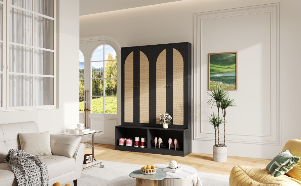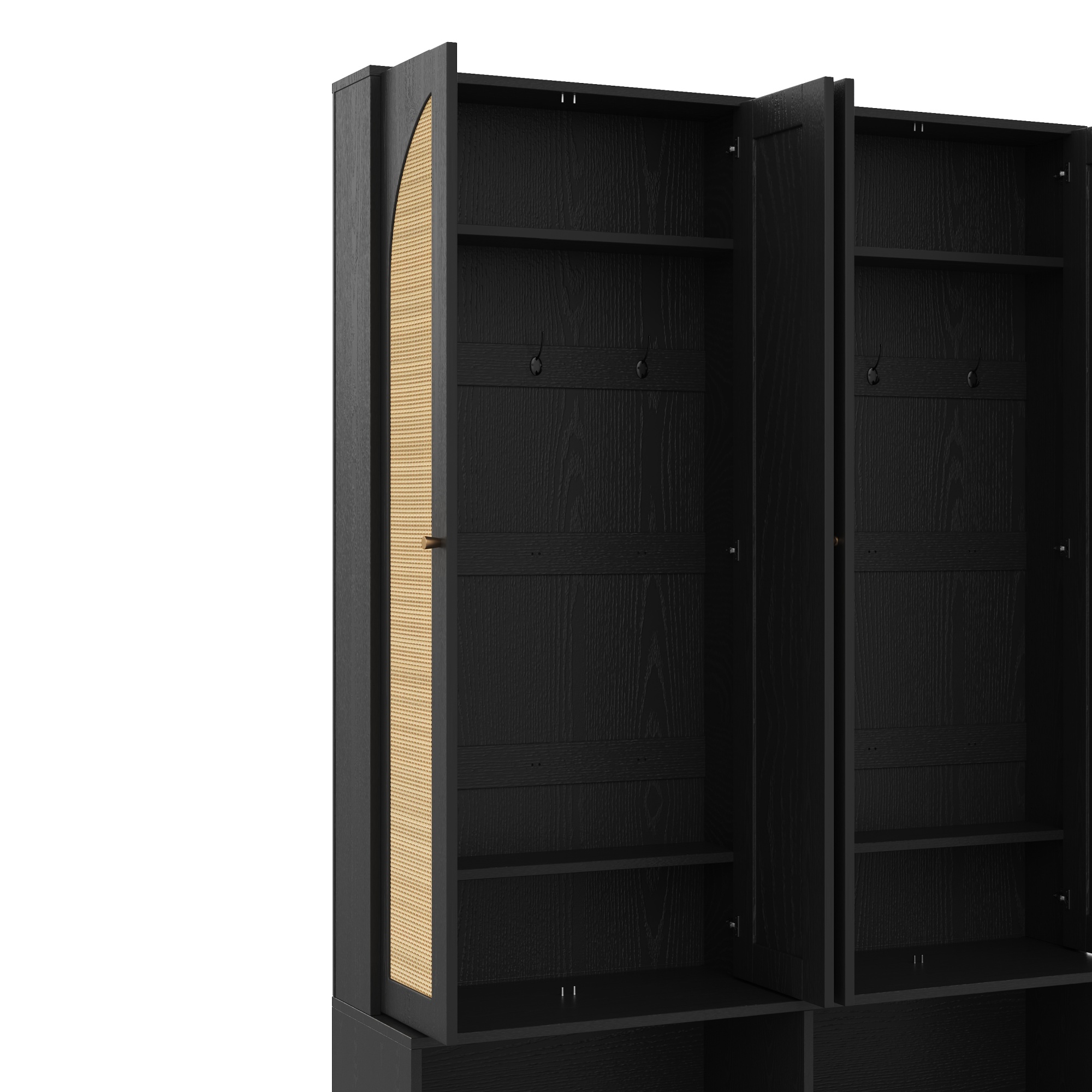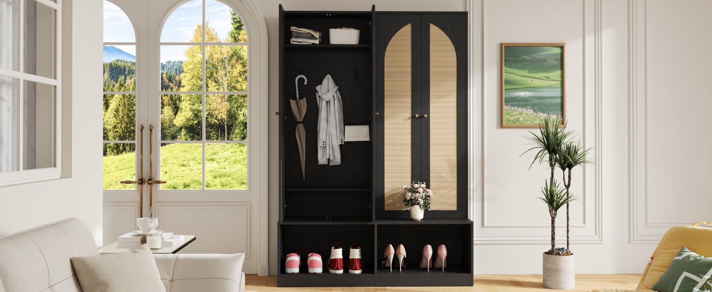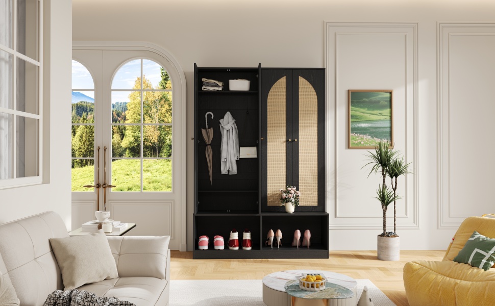 Product Name:[Assembly Video] Farmhouse Hall Tree with Rattan Doors, Versatile 4-In-1 Seating Bench with 6 Hooks, Mid-Century Entryway Shoe Cabinet with Shelf for Living Room, Black, 55.1"W