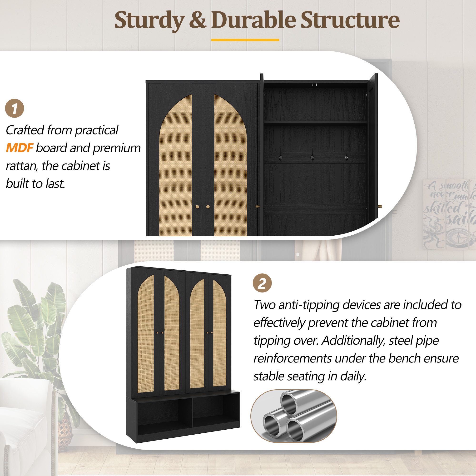 - Sturdy & Durable Structure: Crafted from practical MDF board and premium rattan, the cabinet is built to last. Two anti-tipping devices are included to effectively prevent the cabinet from tipping over. Additionally, steel pipe reinforcements under the bench ensure stable seating in daily.