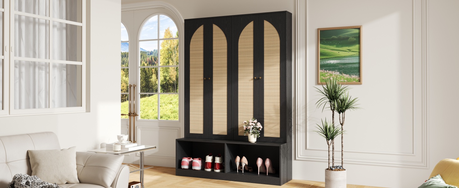 Product Specifications: Basic information Product Type:Combo Item Product Name:[Assembly Video] Farmhouse Hall Tree with Rattan Doors, Versatile 4-In-1 Seating Bench with 6 Hooks, Mid-Century Entryway Shoe Cabinet wit...