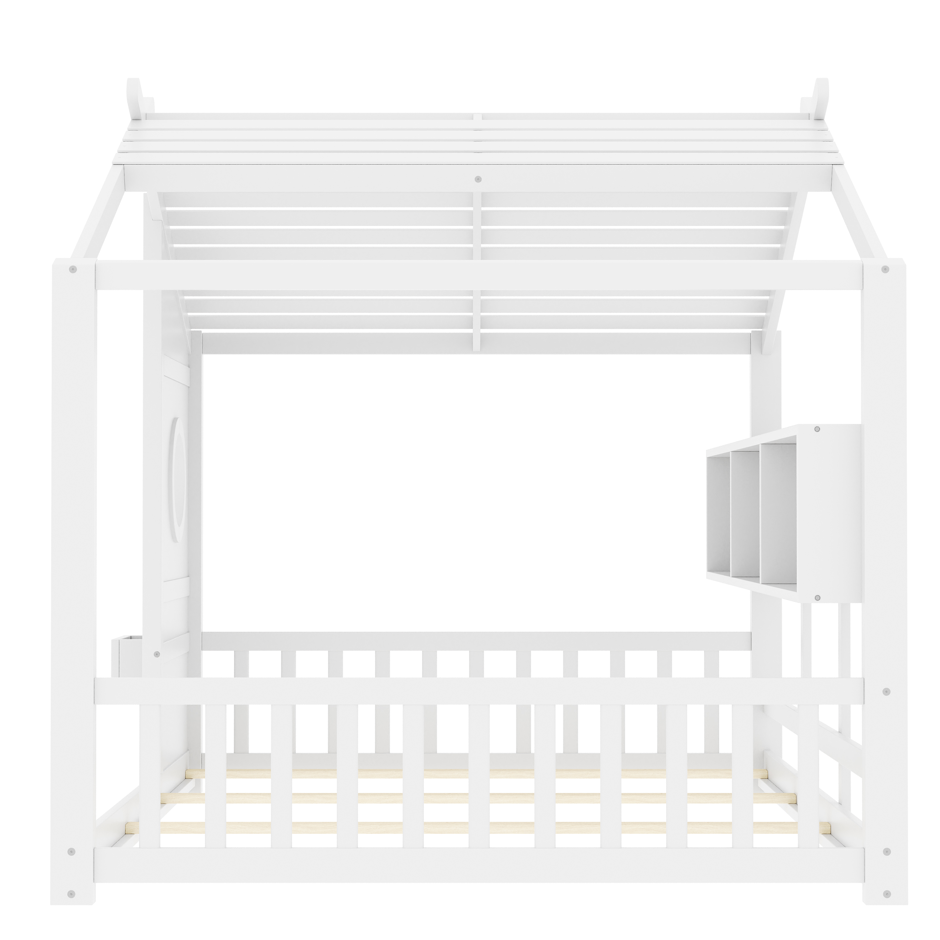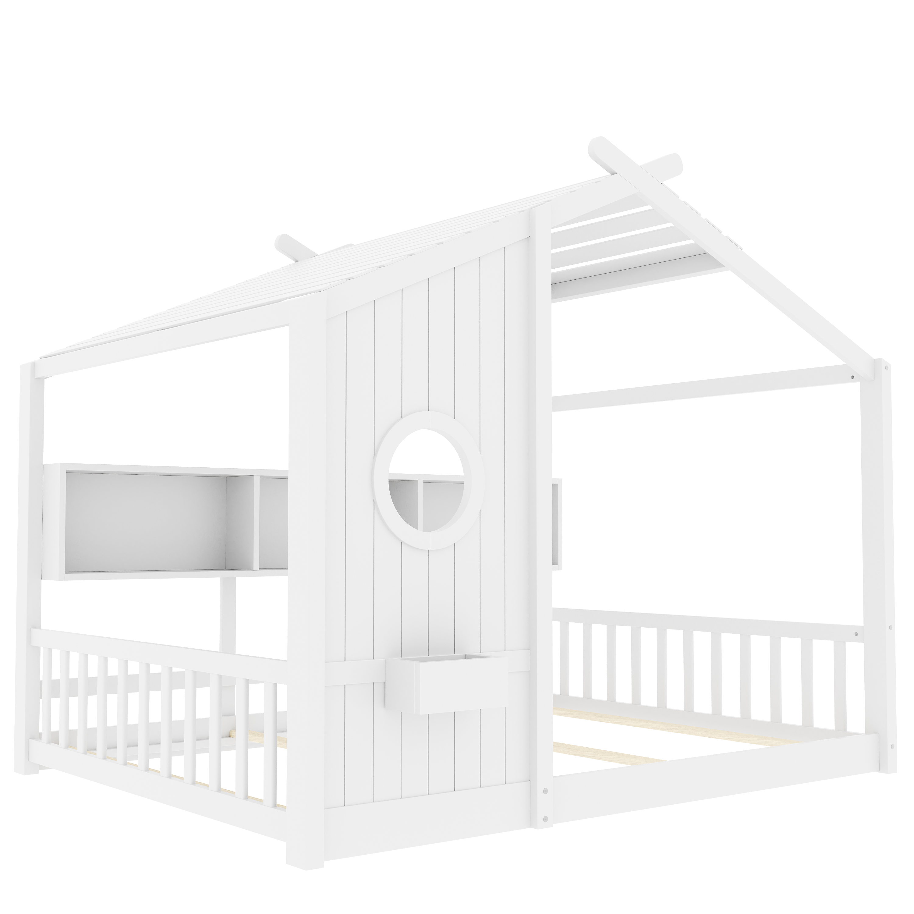 Product Name:Full Size Floor House Bed for Toddler, Kids Montessori Bed with Storage Shelf, Playhouse Bed with Roof Design, White