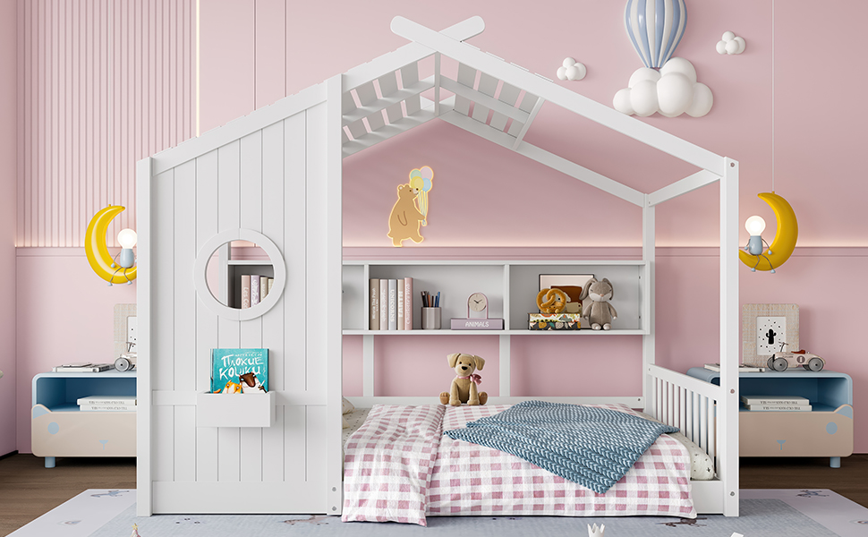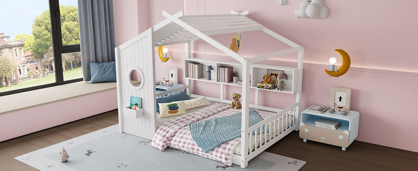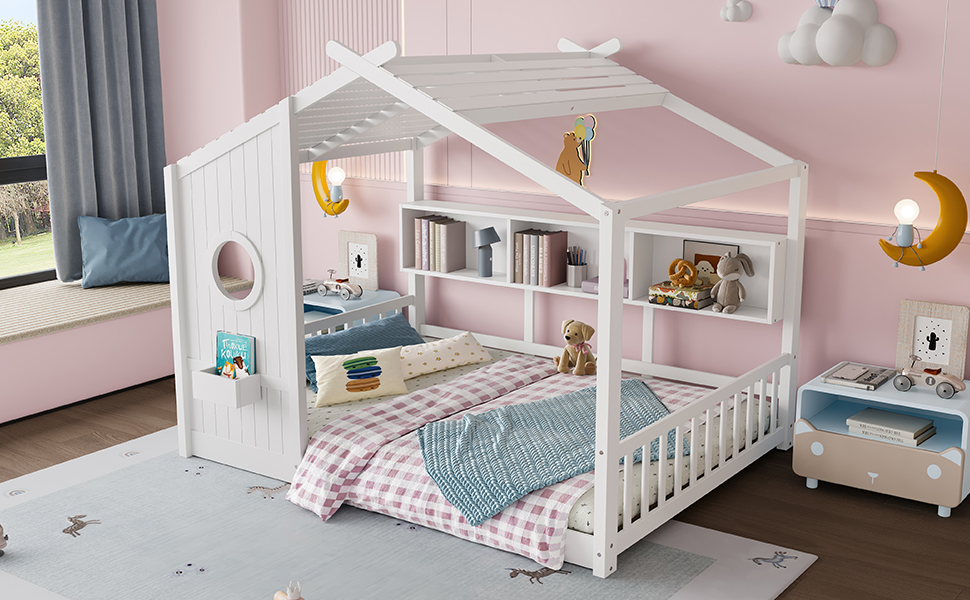 Product Specifications: Basic information Product Type:Single Box Product Product Name:Full Size Floor House Bed for Toddler, Kids Montessori Bed with Storage Shelf, Playhouse Bed with Roof Design, White Color:White M...