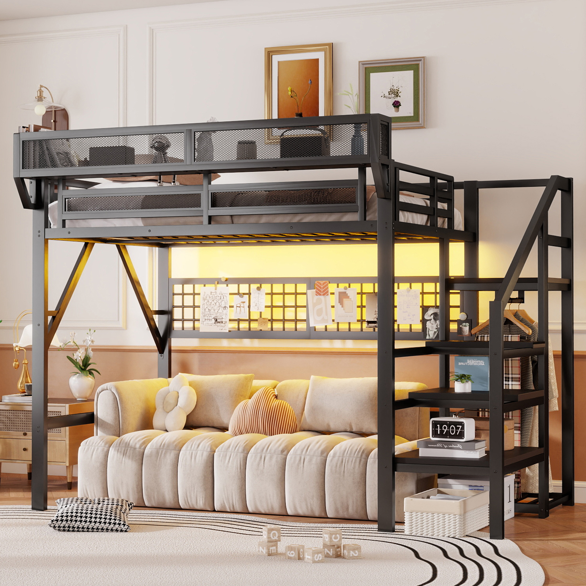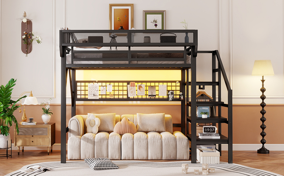 - 【Metal Loft Bed with Light and Grid】Full size metal loft bed frame with RGB LED lights(over 60000 colors), in addition to directly adjusting the light colors in the APP or controller, you can customize the brightness, speed and timing modes. The lights offers a nice ambiance for your bedroom, bright up your night. And the grid can be DIY decoration.