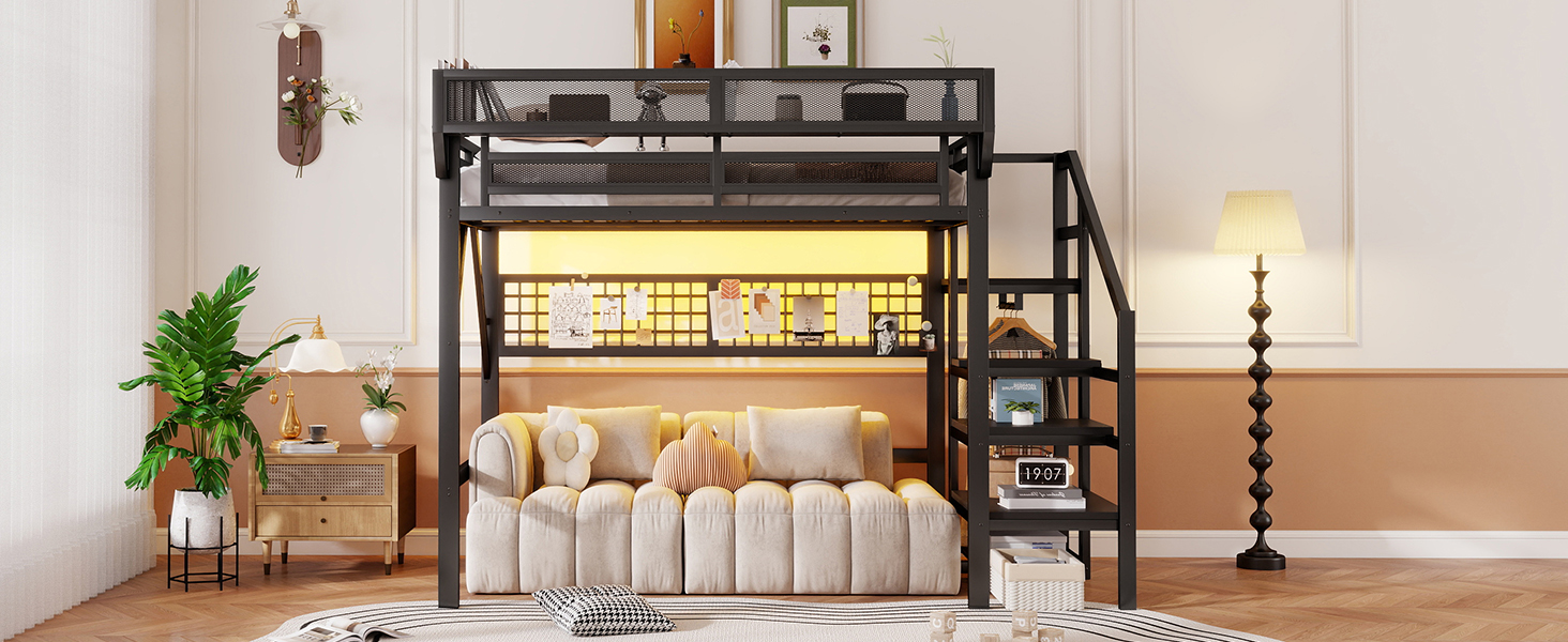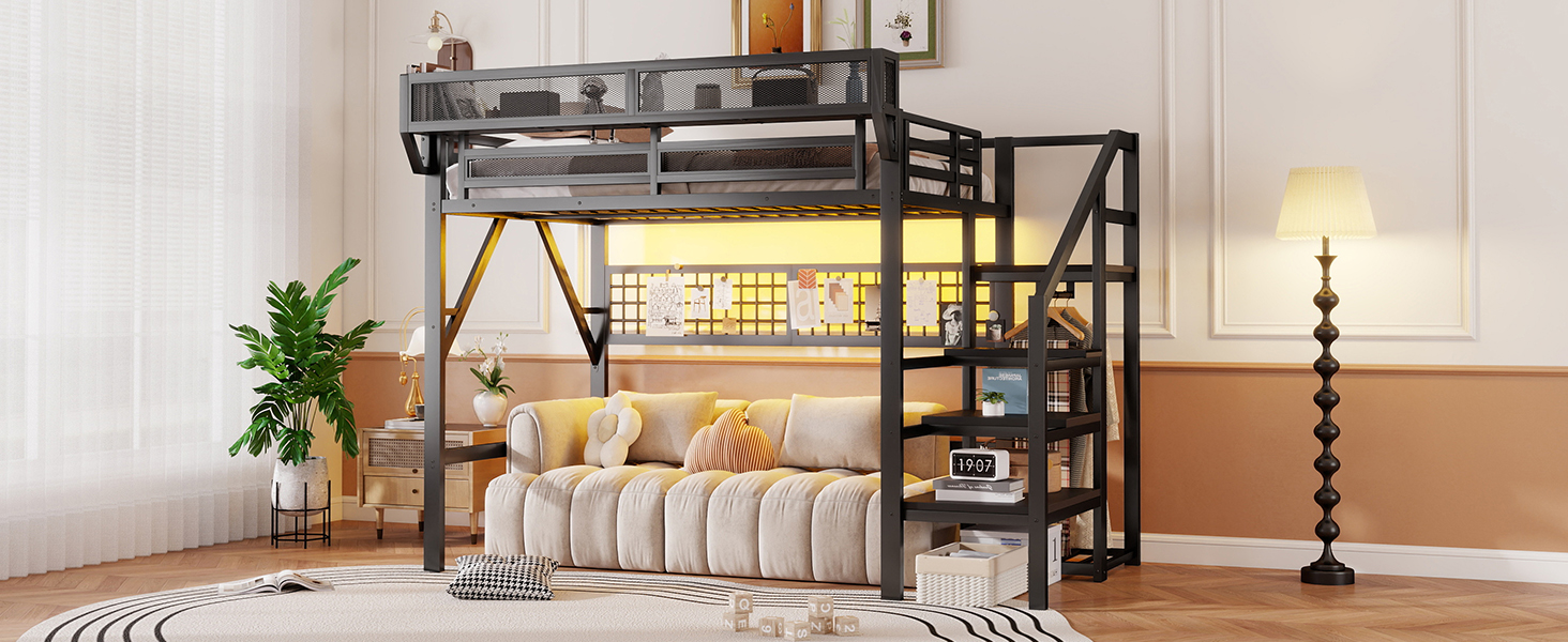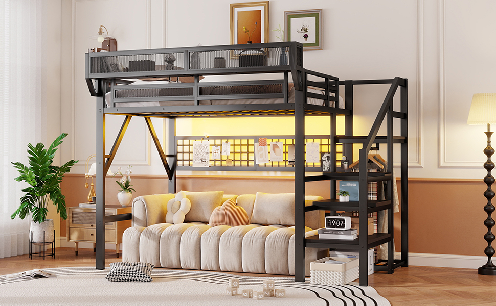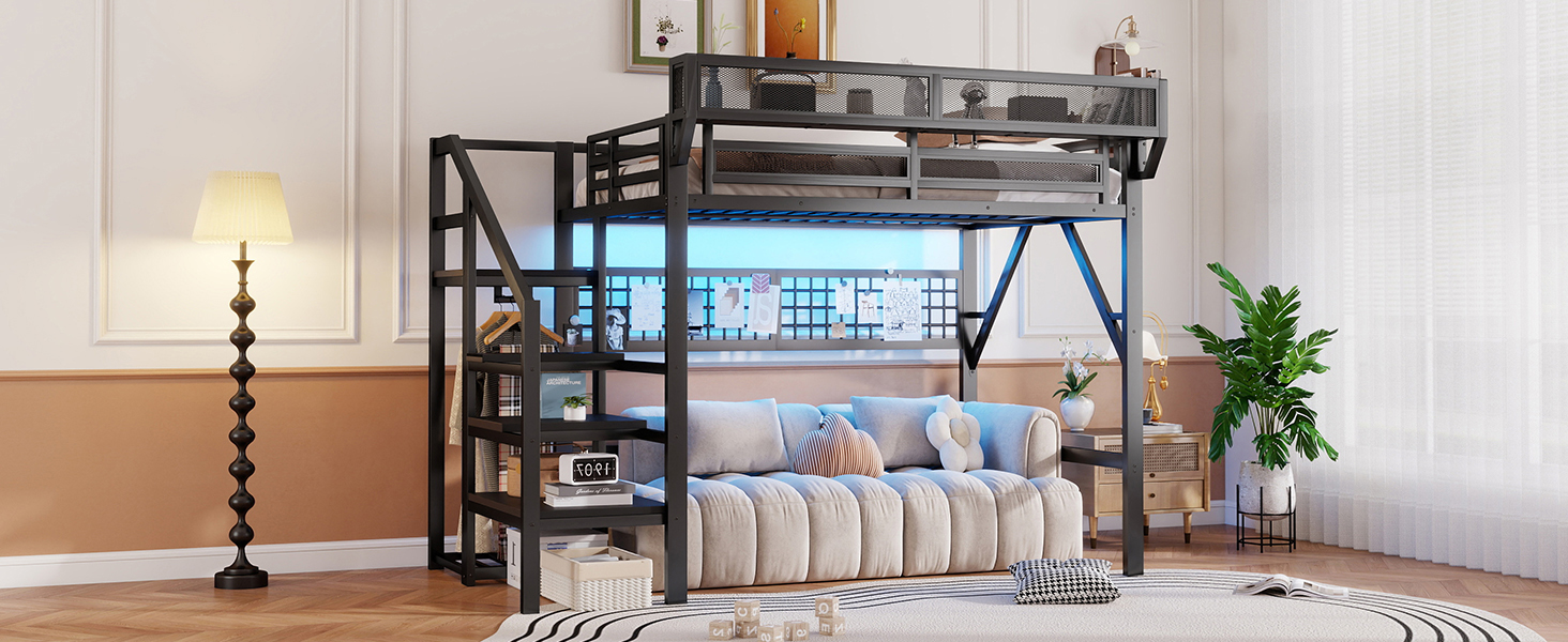 Product Name:Full Size Loft Bed with Stairs, Metal Full Loft Bed with Light and Storage, High Loft Bed with Wardrobe and Storage for Kids Teens Adults, Black