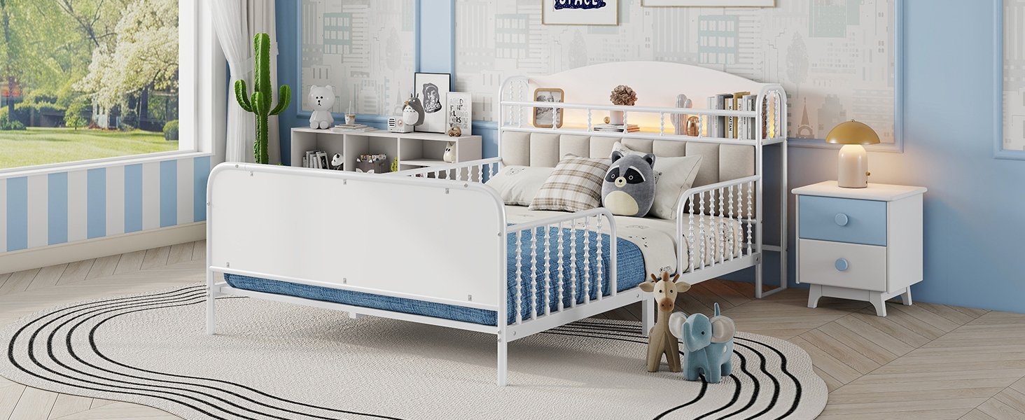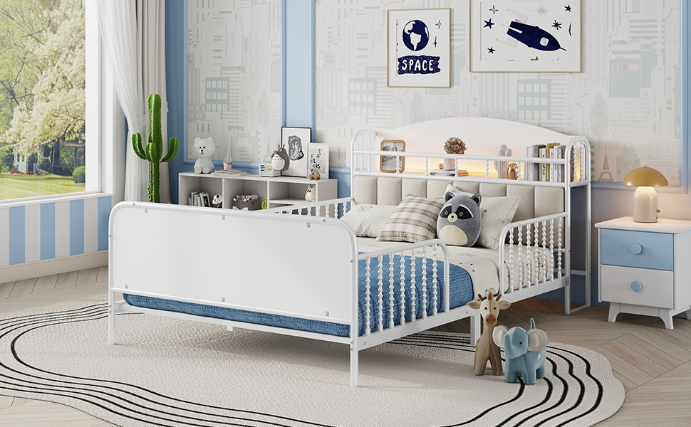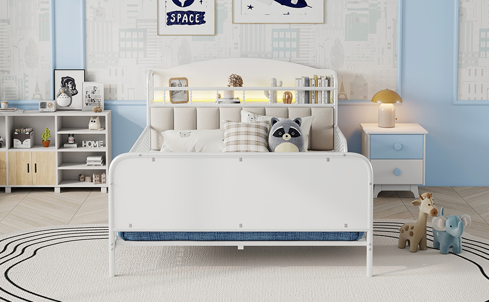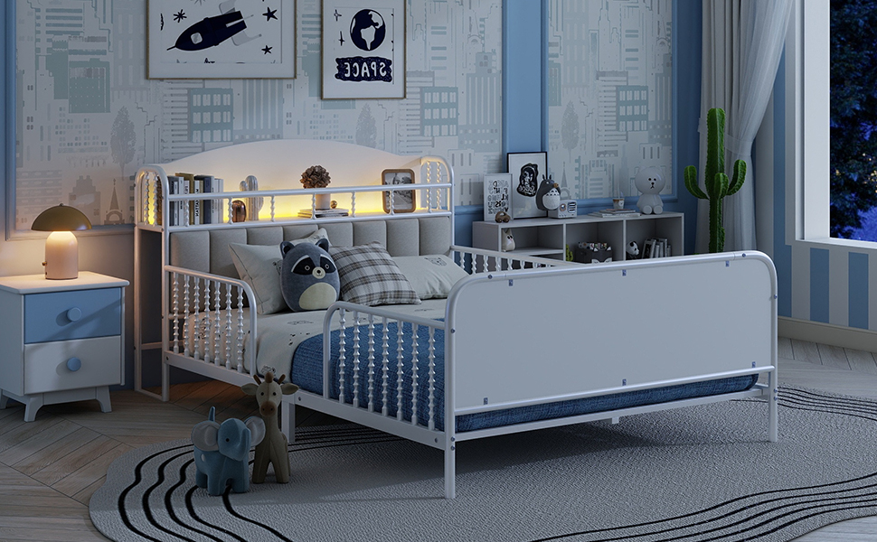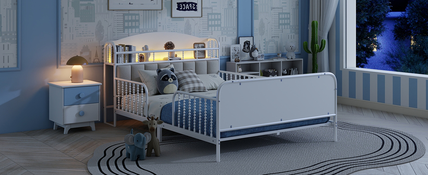 Product Name:Full Size Metal Platform Bed Frame with Light, Kids Full Metal Bed with Upholstered and Storage Headboard, White (Expect Arrival Date 2025/10/5)