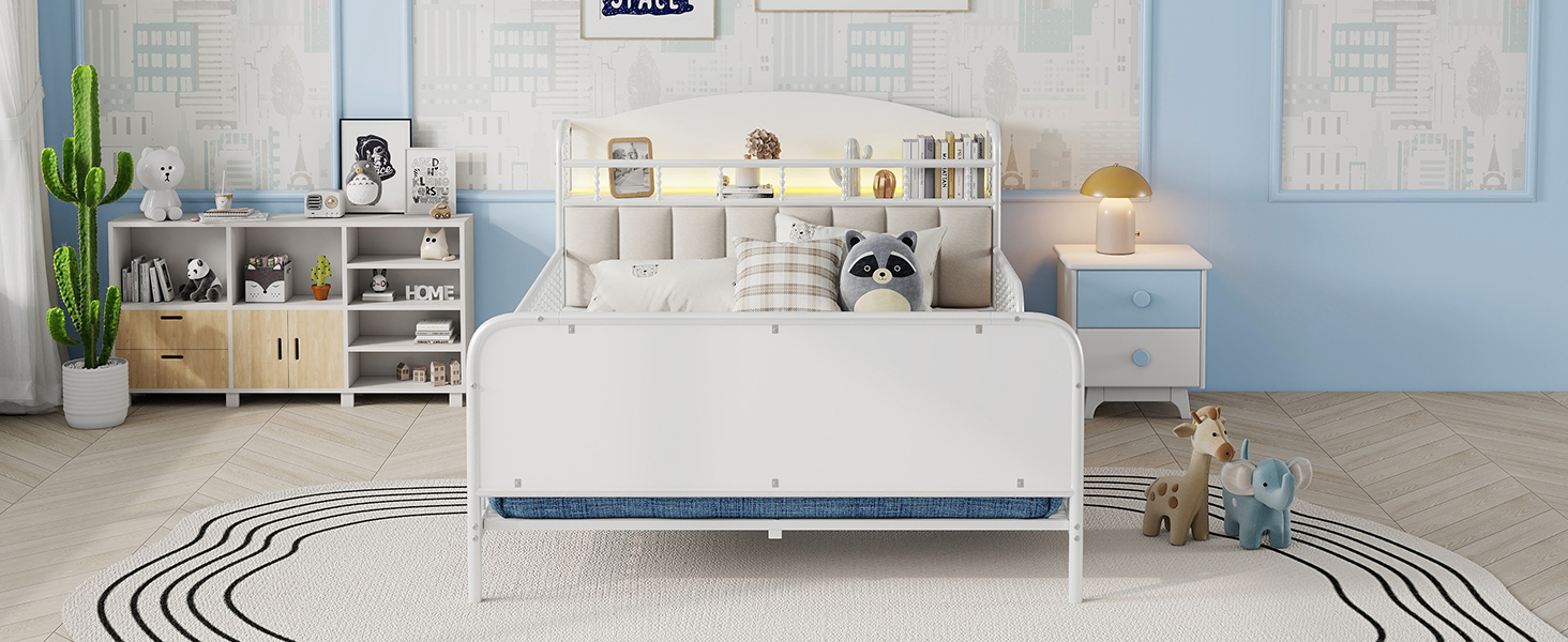 Specification Product Information Product Type :Single Box Product Product Name:Full Size Metal Platform Bed Frame with Light, Kids Full Metal Bed with Upholstered and Storage Headboard, White (Expect Arrival Date 202...