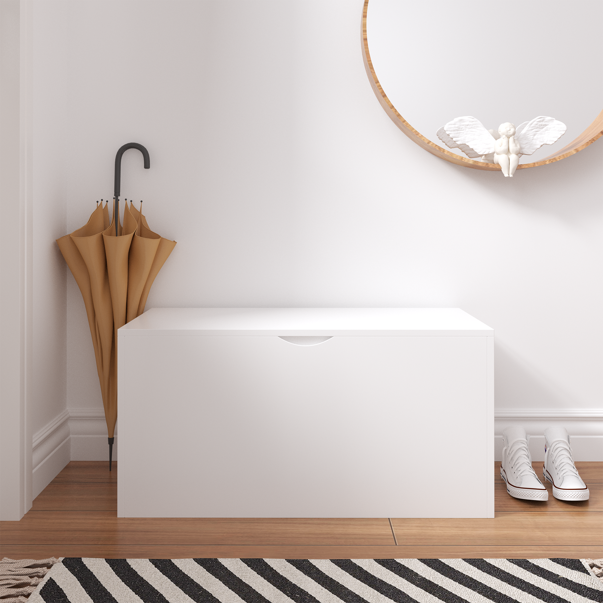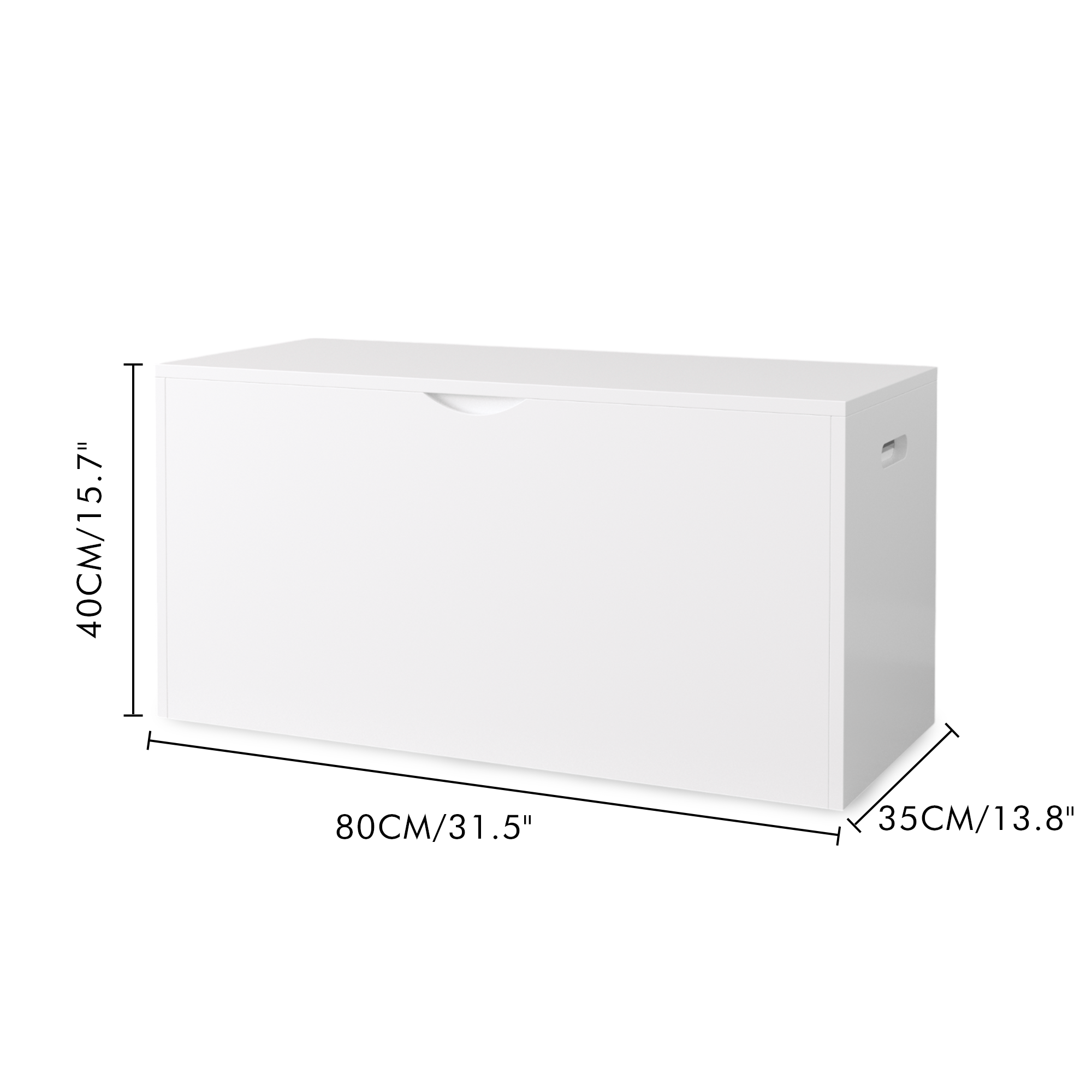 Large Wooden Toy Chest: Spacious toy box that is 31.5” wide is the perfect organizational solution for keeping playrooms, nurseries, and bedrooms tidy and organized. On trend, modern finishes make this a great addition to any room. Premium MDF Construction:Crafted from durable MDF board, this toy storage chest offers a smooth finish, excellent stability, and long-lasting durability. Unlike solid wood, MDF is resistant to warping and cracking, providing a cost-effective yet high-quality solution for daily use in kids’ spaces. Spacious 5-Cubic Feet of Storage: With almost 5 cubic feet of storage, this toy box measures 31.5"L x 13.8"W x15.7"H when assembled.