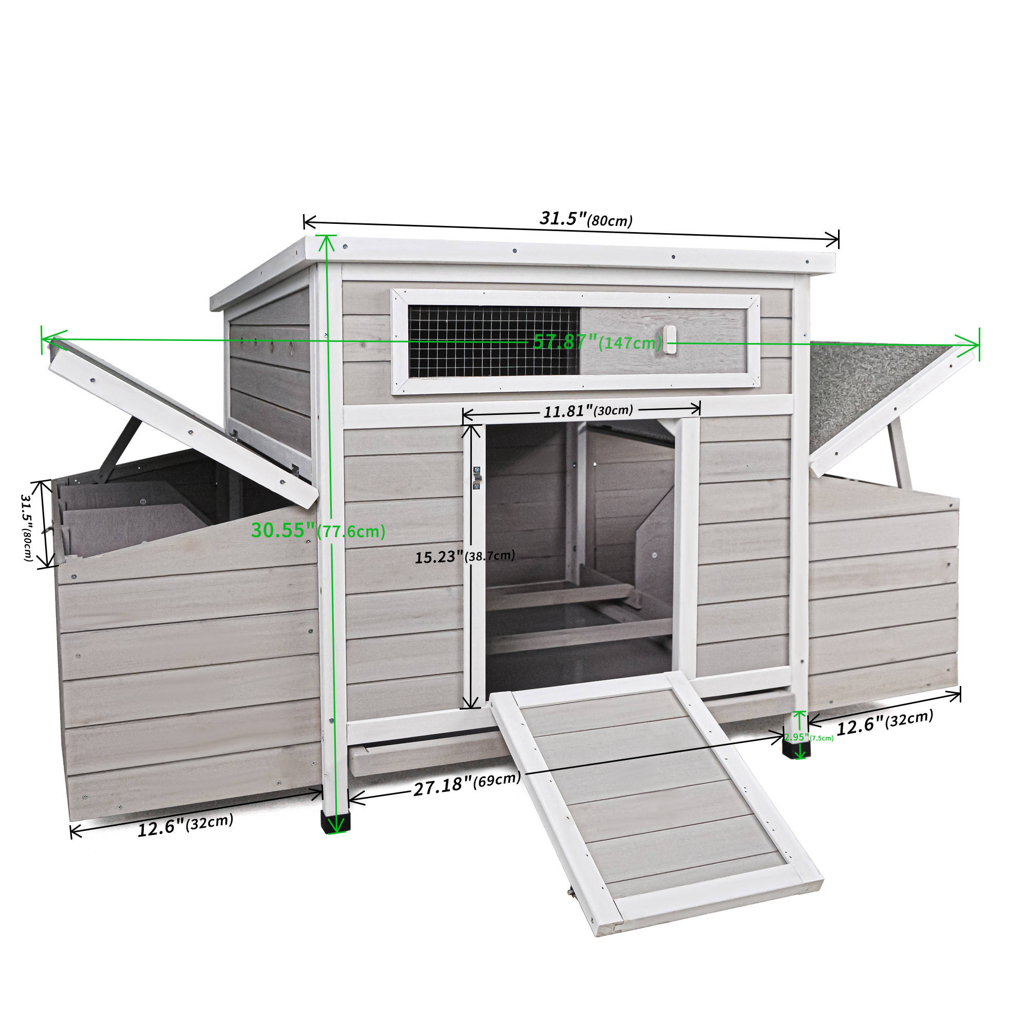 Product Specifications: Basic information Product Type:Single Box Product Product Name:Large Wooden Chicken Coop Outdoor Hen House Poultry Cage for Outdoor with 2 Sides Nesting Boxes Color:Gray+White Matte Material:Wo...