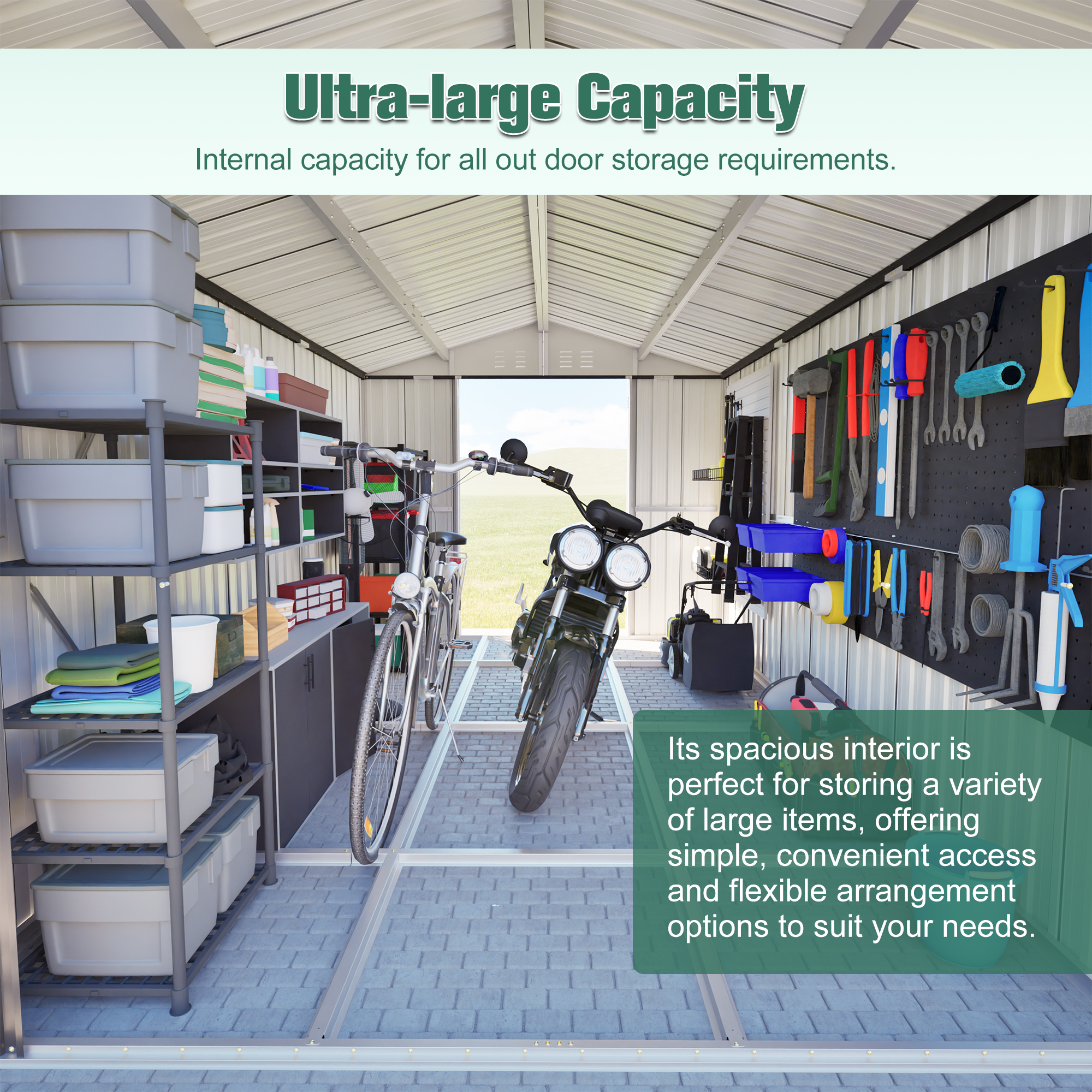- 【Ample Storage Space】This spacious 8x12 ft outdoor storage shed provides plenty of room for all your outdoor essentials. Easily store lawn mowers, bicycles, garden tools, and more—keeping everything organized and protected from the elements.