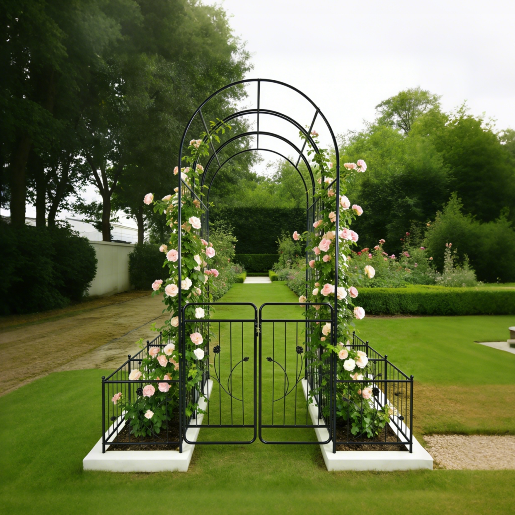 Product Name:Metal Garden Arch with Gate 79.5'' Wide x 86.6'' High Climbing Plants Support Rose Arch Outdoor Black