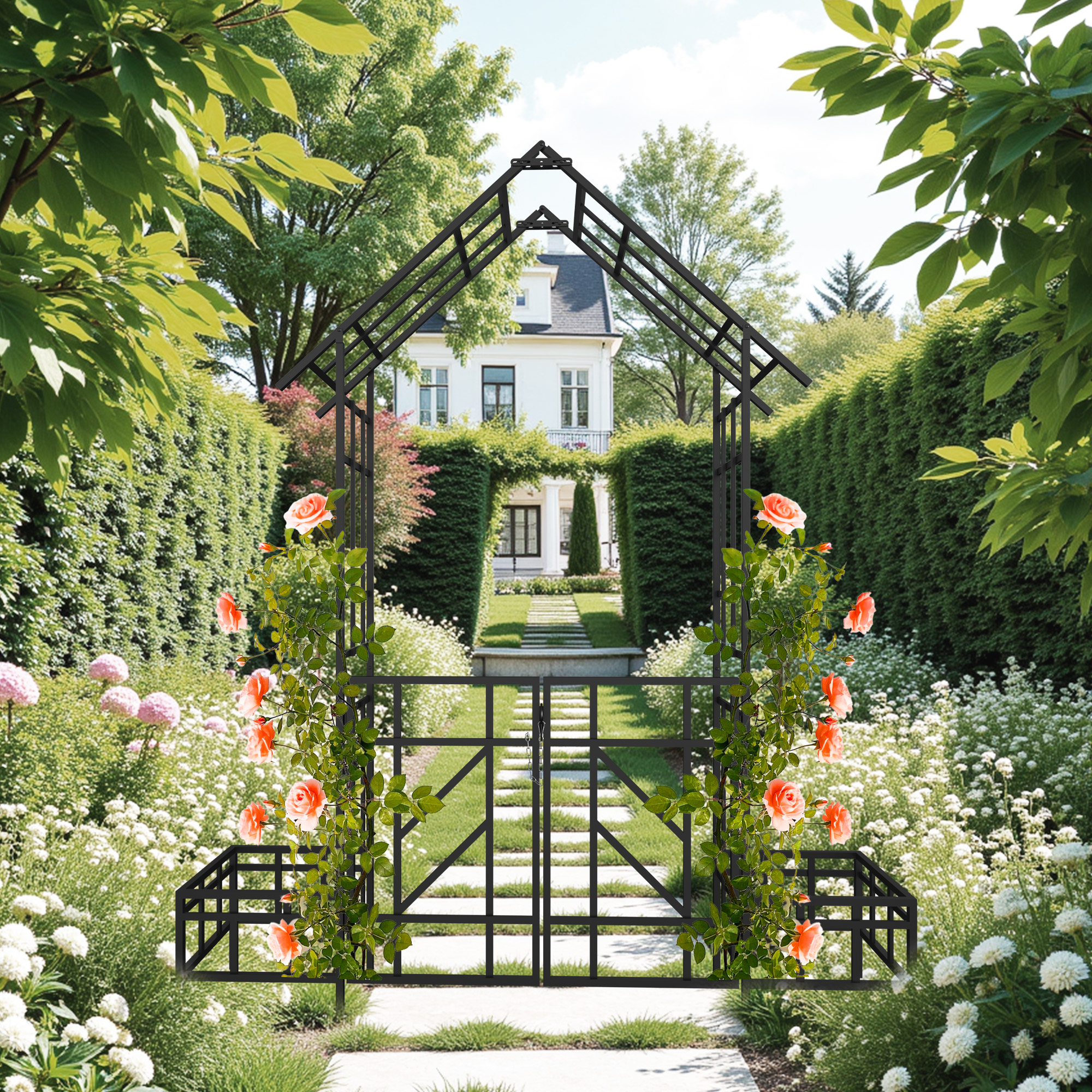 Product Specifications: Basic information Product Type:Single Box Product Product Name:Metal Garden Arch with Gate with planter W80.71*H97.24 Climbing Plants Support Rose Arch Outdoor Black Origin:China Color:Black Ma...