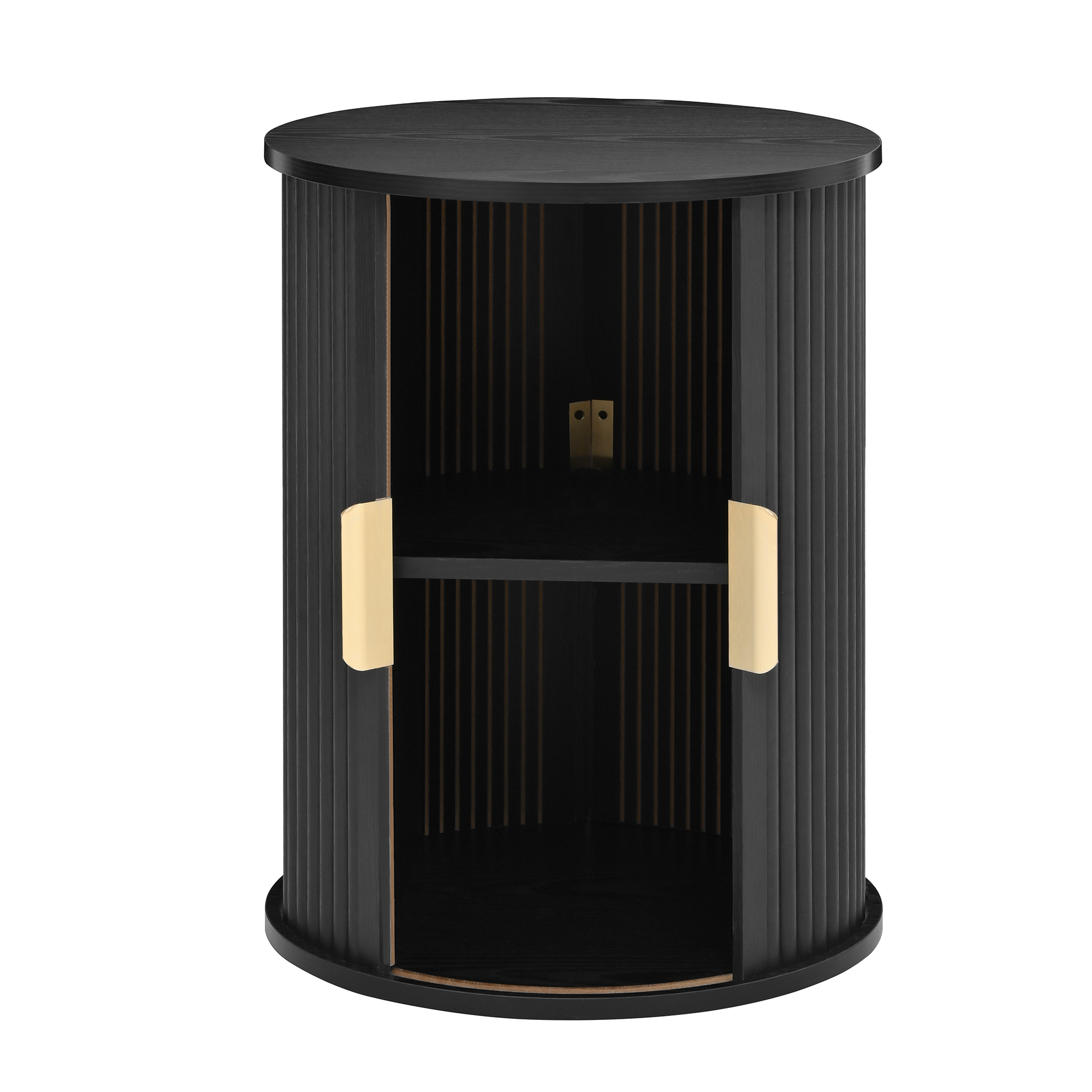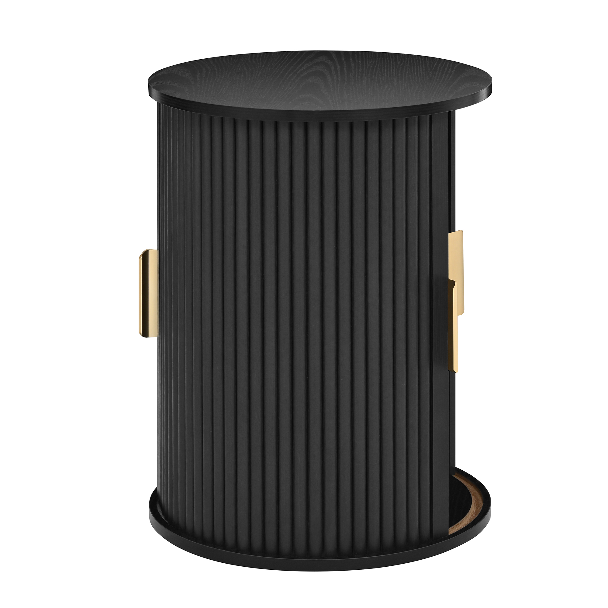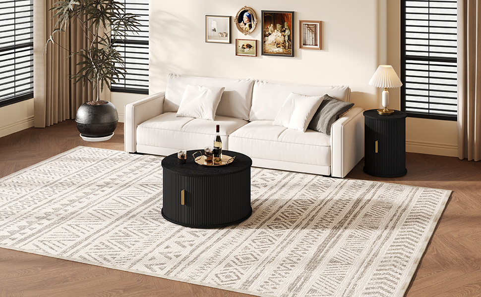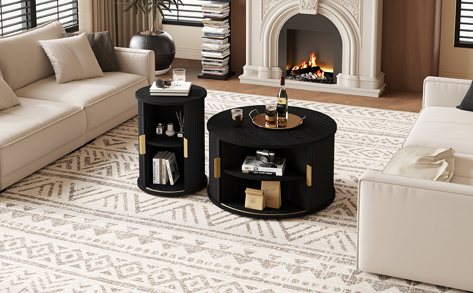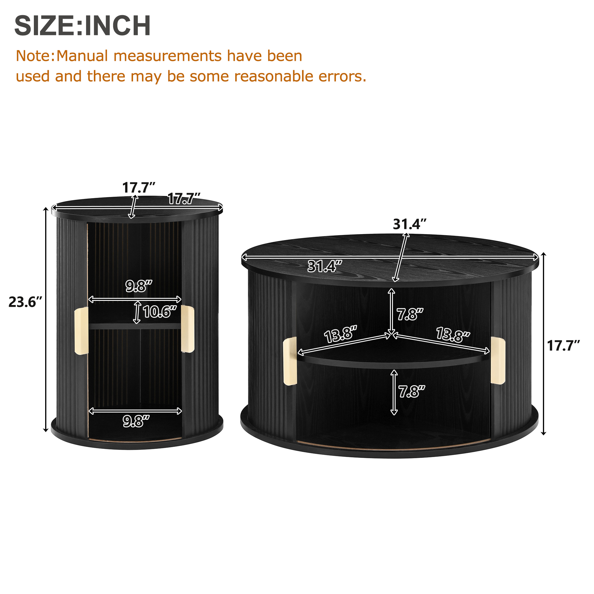 Product Name:[Assembly Video] Mid-Century Coffee Table Set with Sliding Tambour Door, Round Fluted End Table With Storage, Golden Handle Tall & Low Side Table with Wooden Finish for Living Room, Set of Two, Black