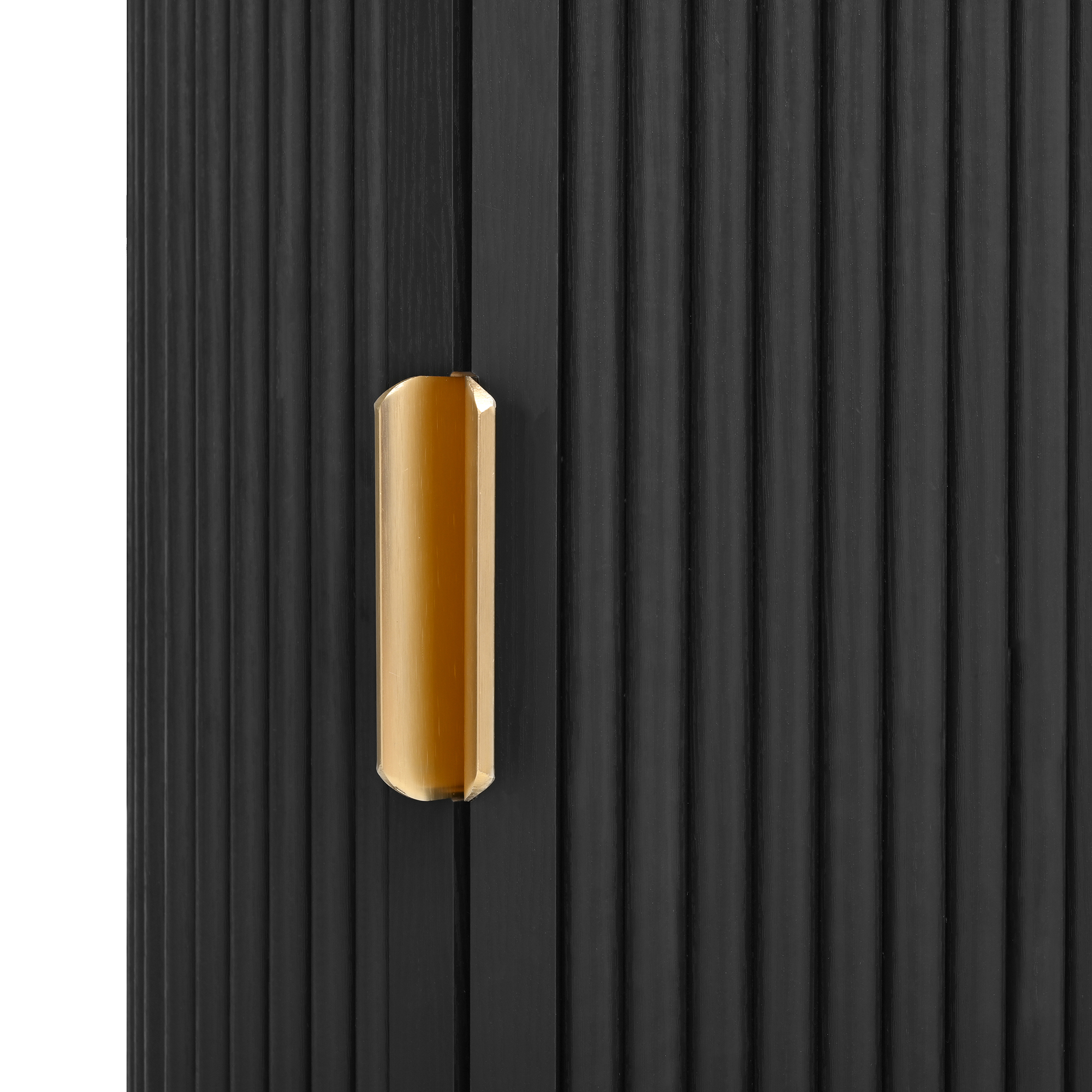 Designed with a balance of form and function, this coffee table set combines a wide low table and a tall slim companion. Wrapped in a warm wooden finish and accented with fluted tambour sliding doors, the design is elevated by golden handles, bringing both texture and elegance to your living room.