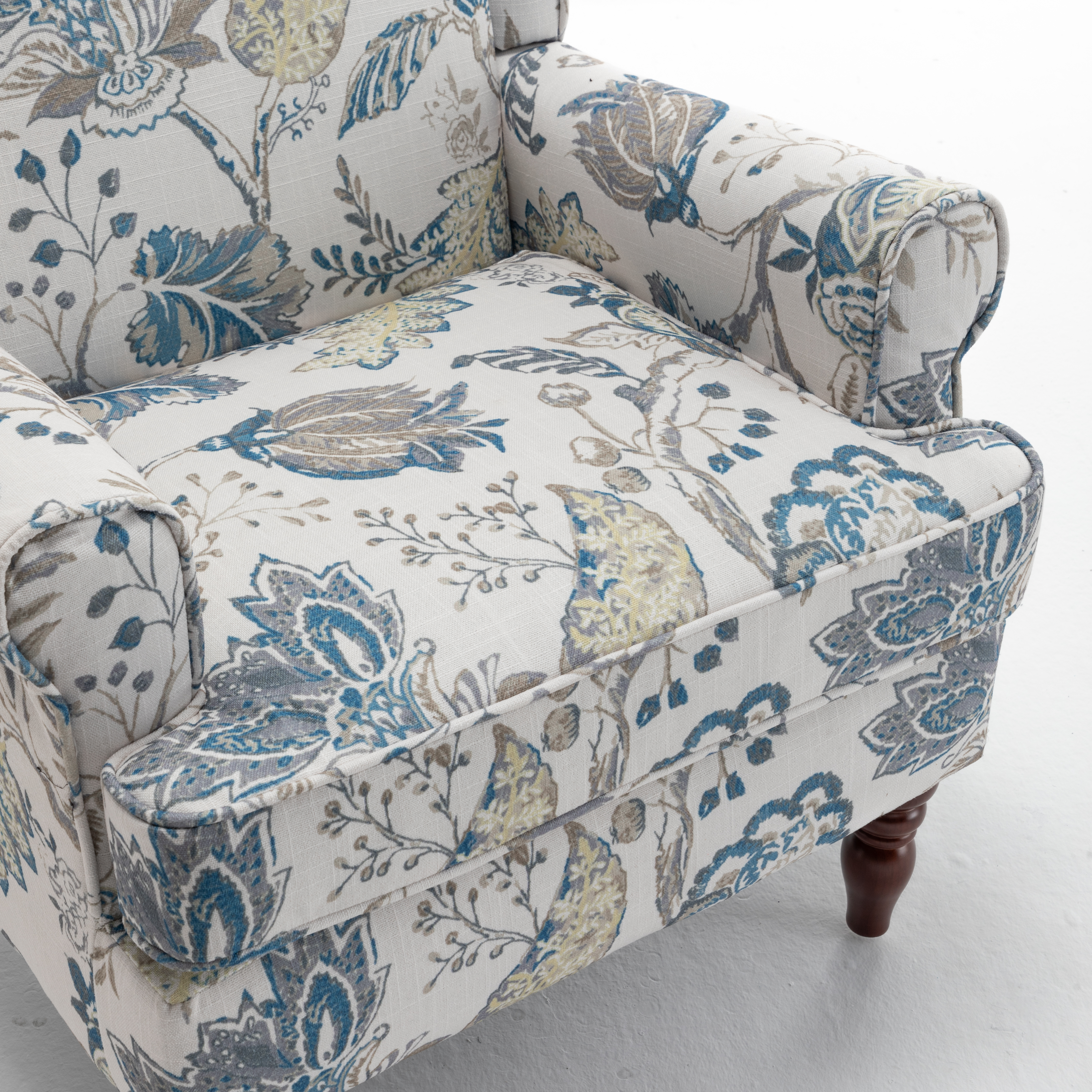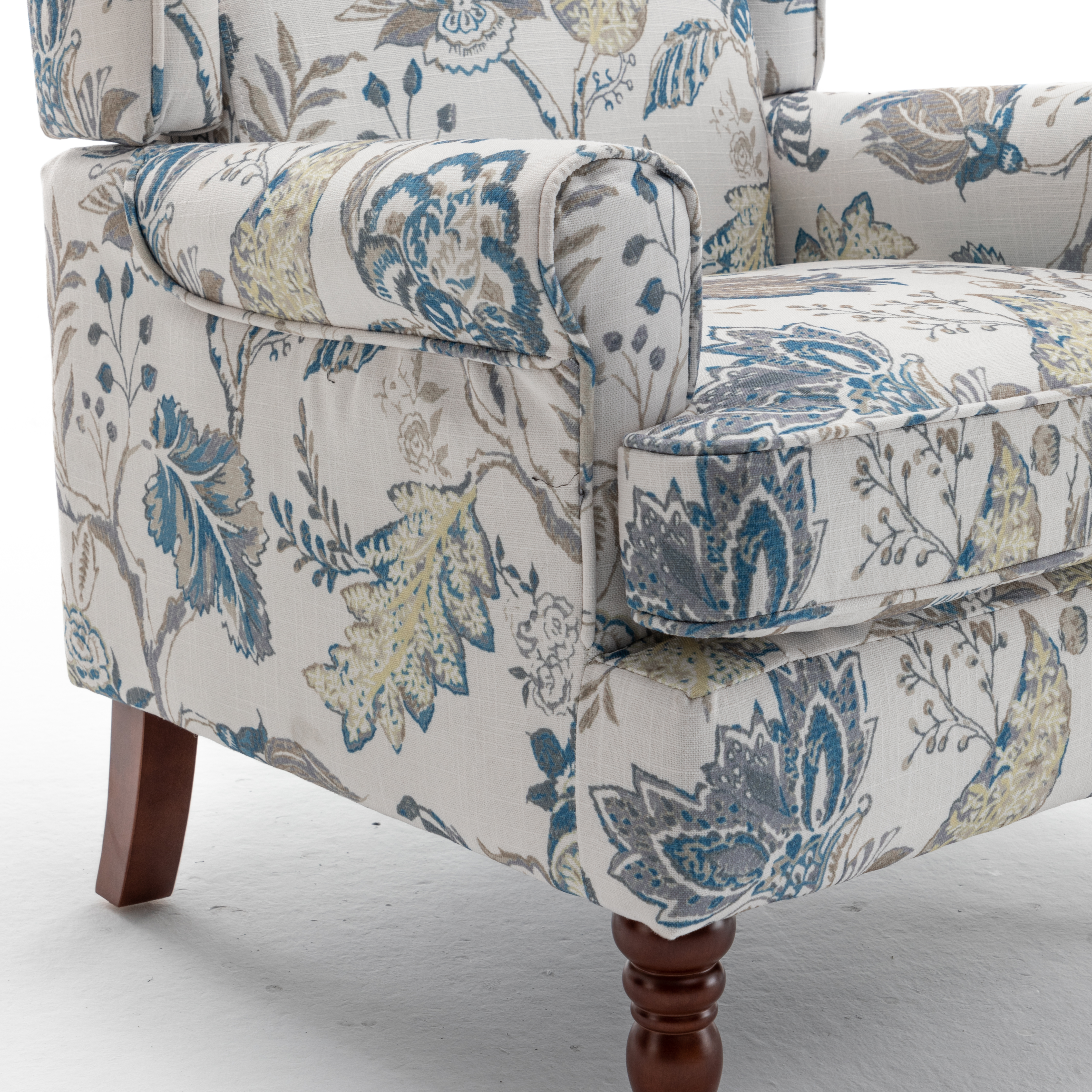 Product Name:Modern Accent Chair with Retro Wood Legs, Comfy Upholstered Armchair, Floral Design Single Sofa Chair for Living Room Bedroom Office - Floral Blue