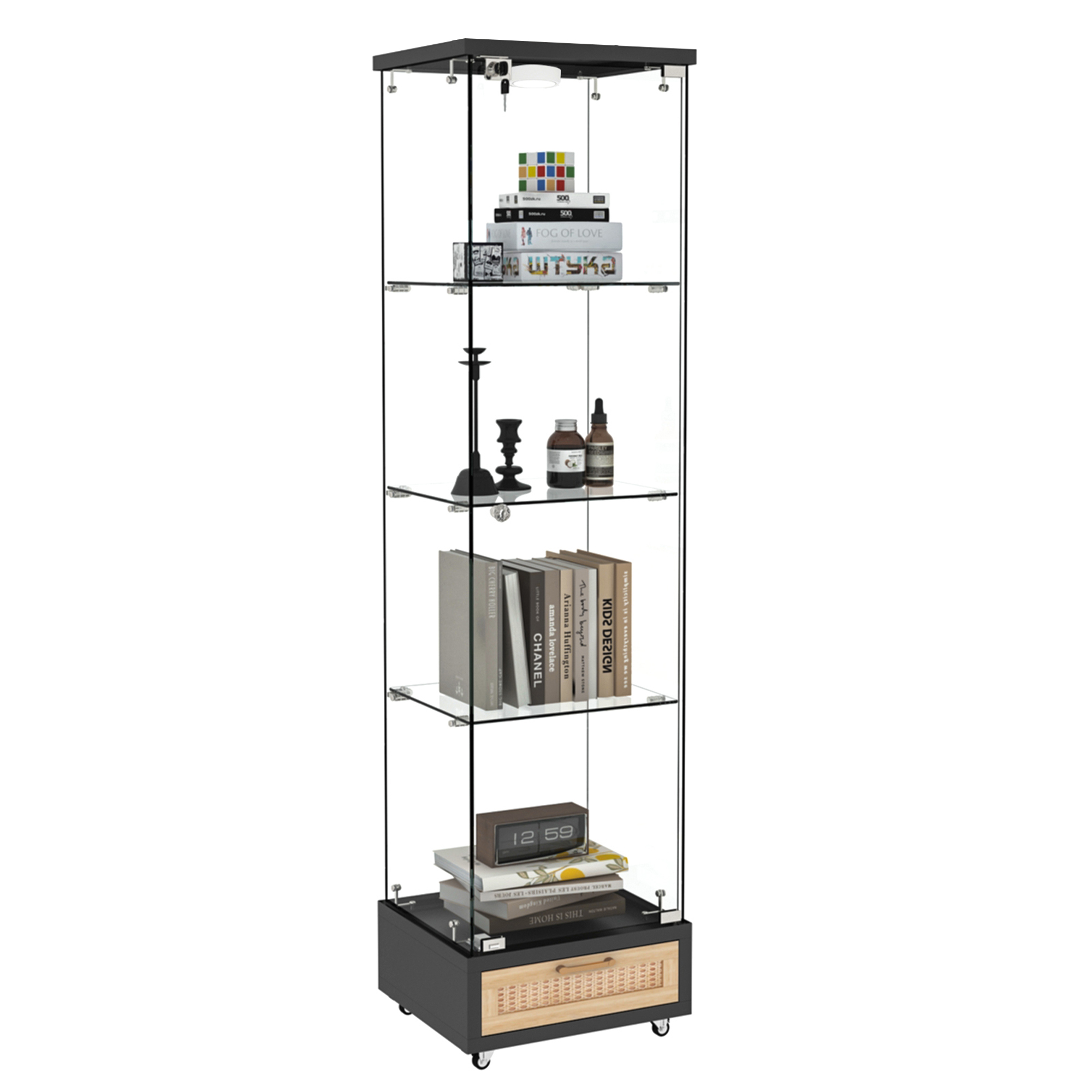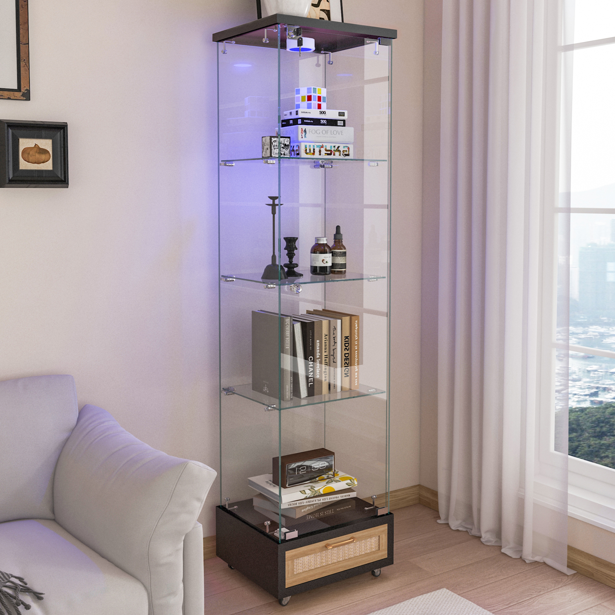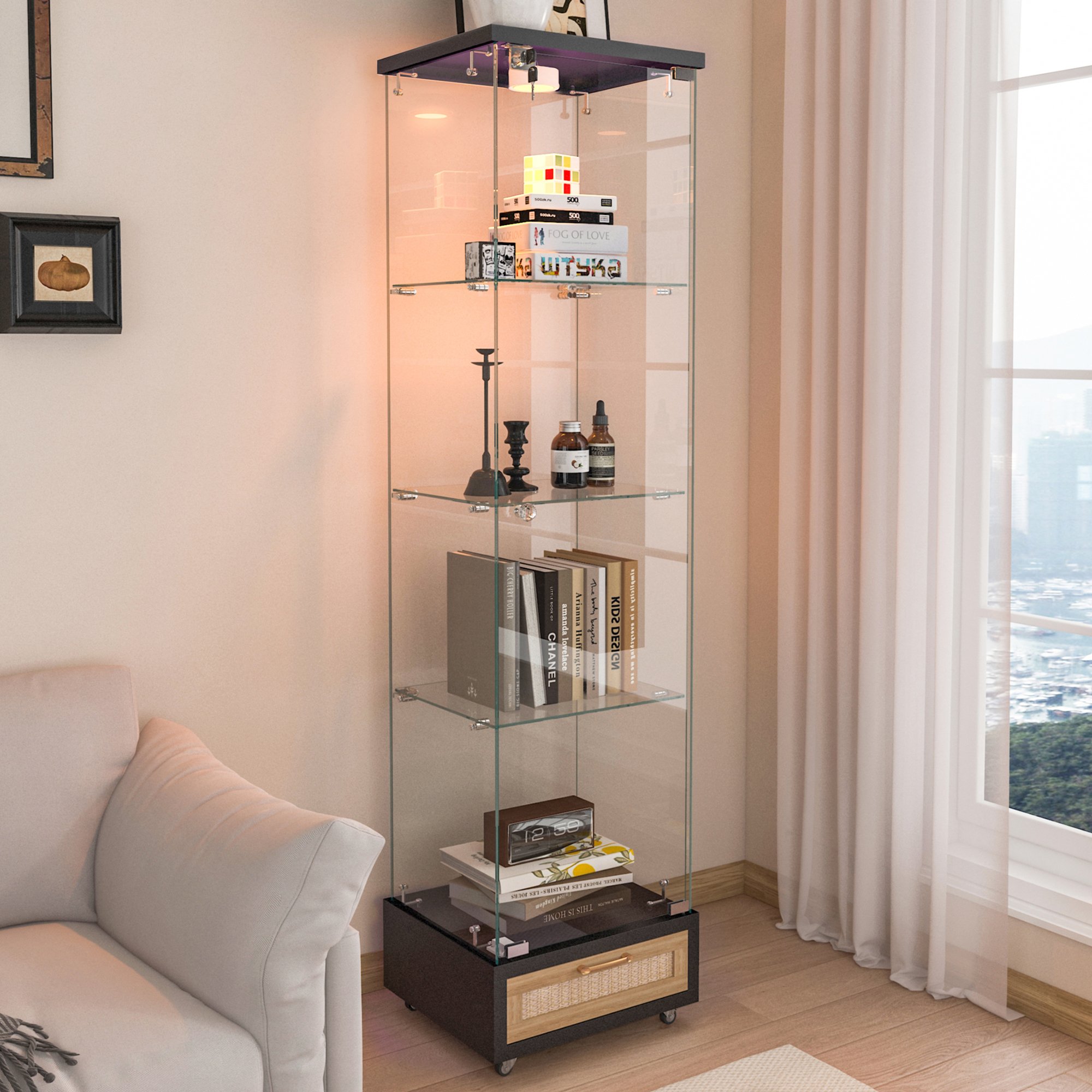 Product Name:Modern Glass Display Cabinet with Drawer , Quick-assembly Antique Cabinet with LED lights, Tempered Glass Bookshelf, 1-Door Storage Case with 4 Shelves for Living Room and Bedroom, black and natural