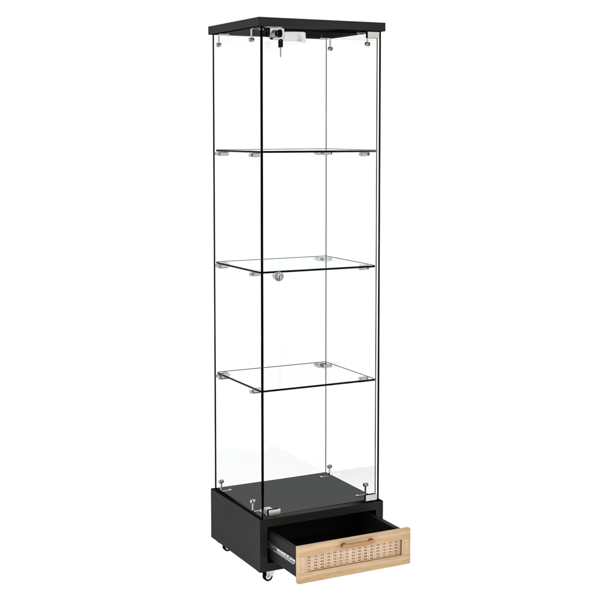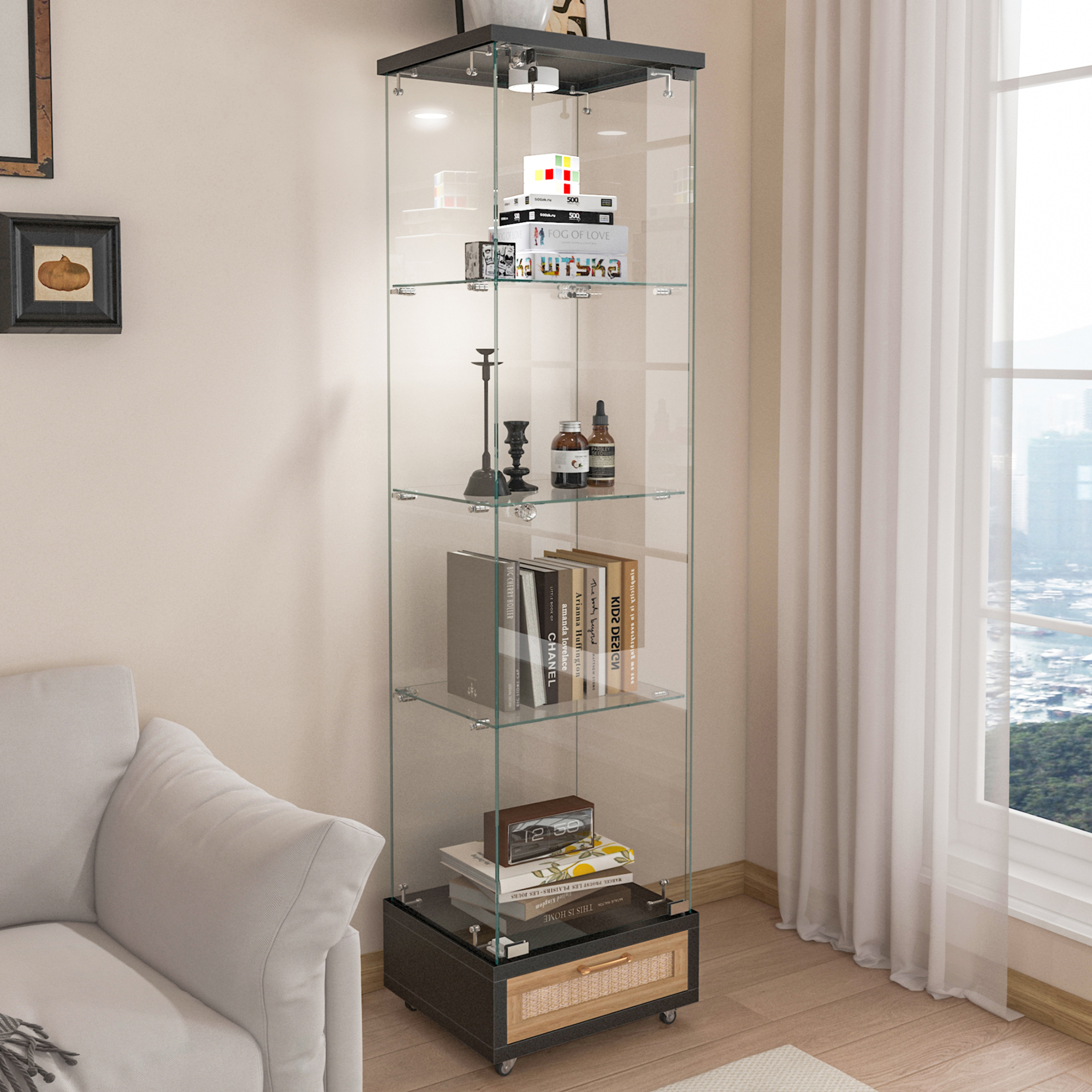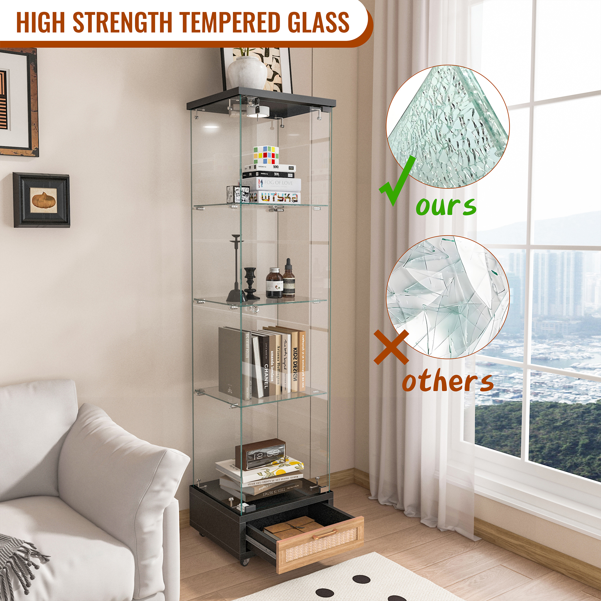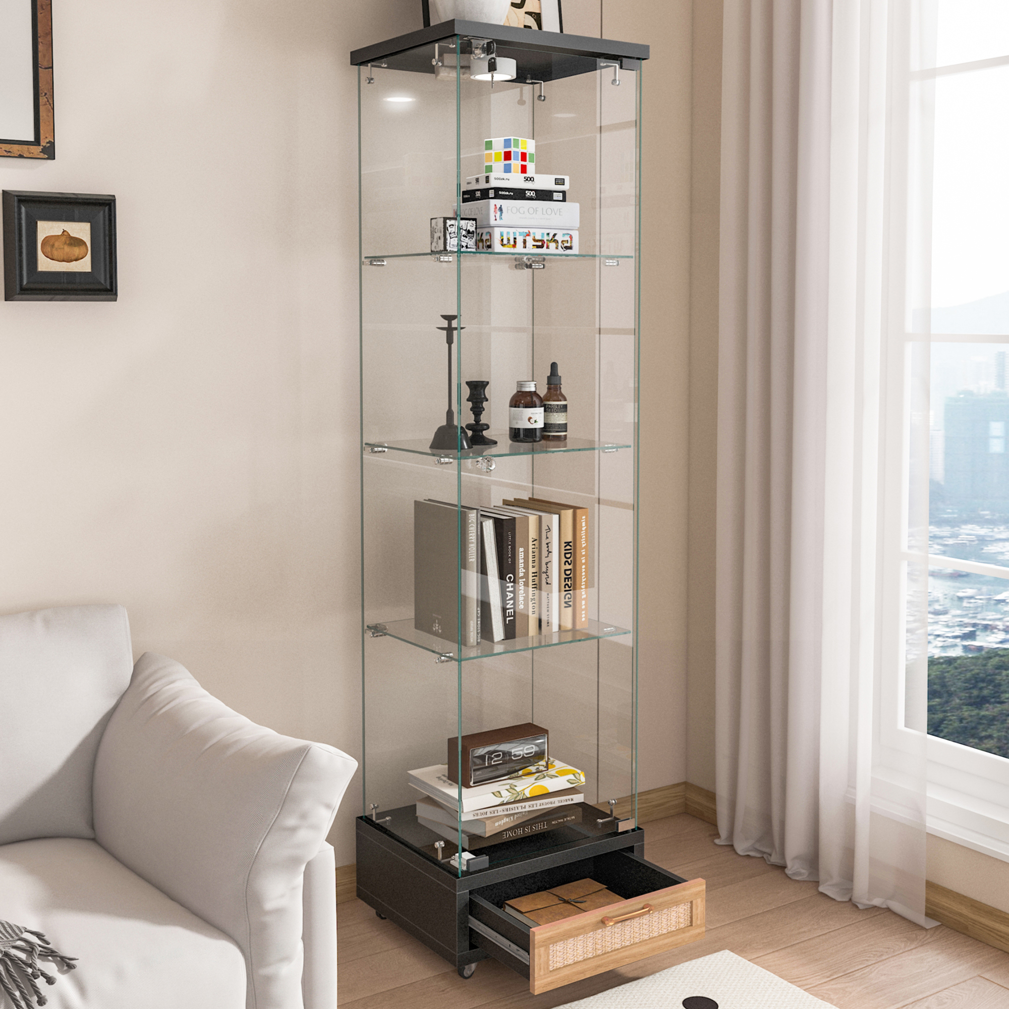 Specification Product Information Product Type :Single Box Product Product Name:Modern Glass Display Cabinet with Drawer , Quick-assembly Antique Cabinet with LED lights, Tempered Glass Bookshelf, 1-Door Storage Case...