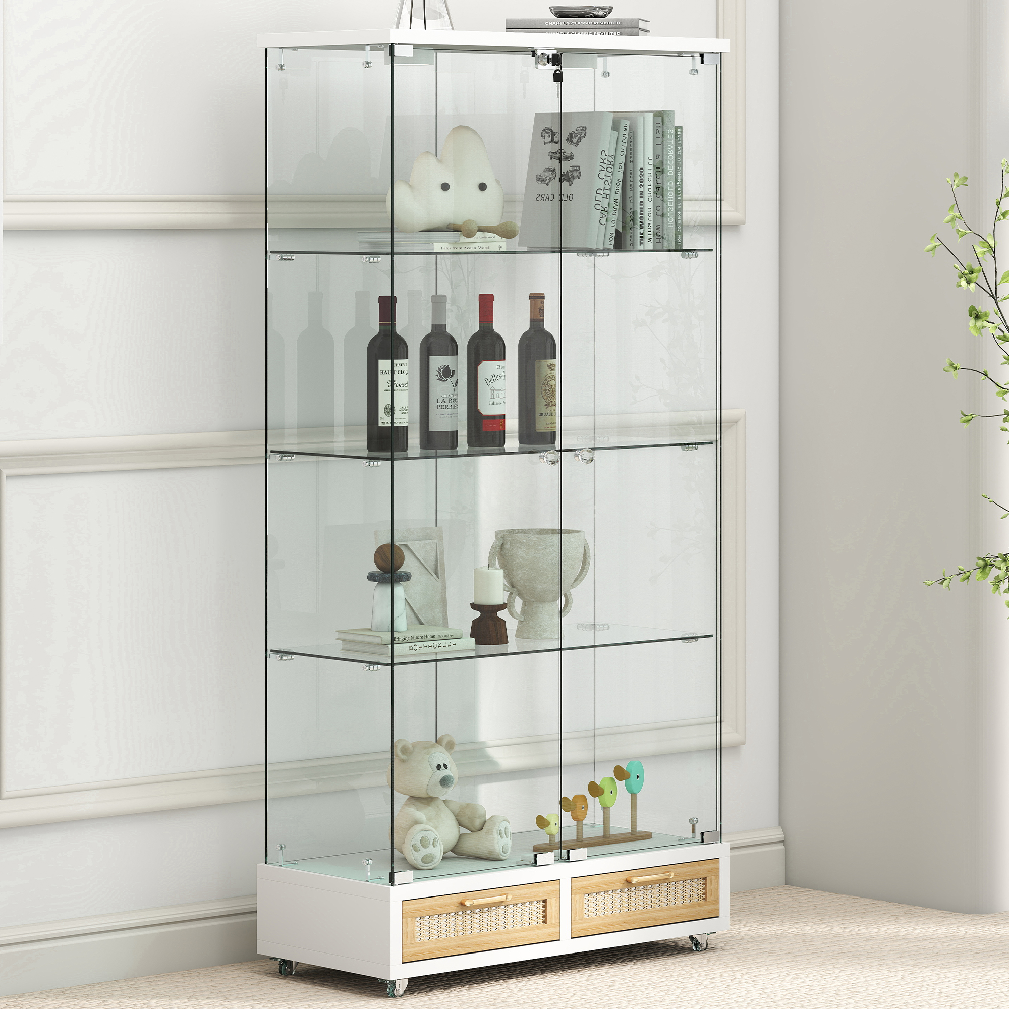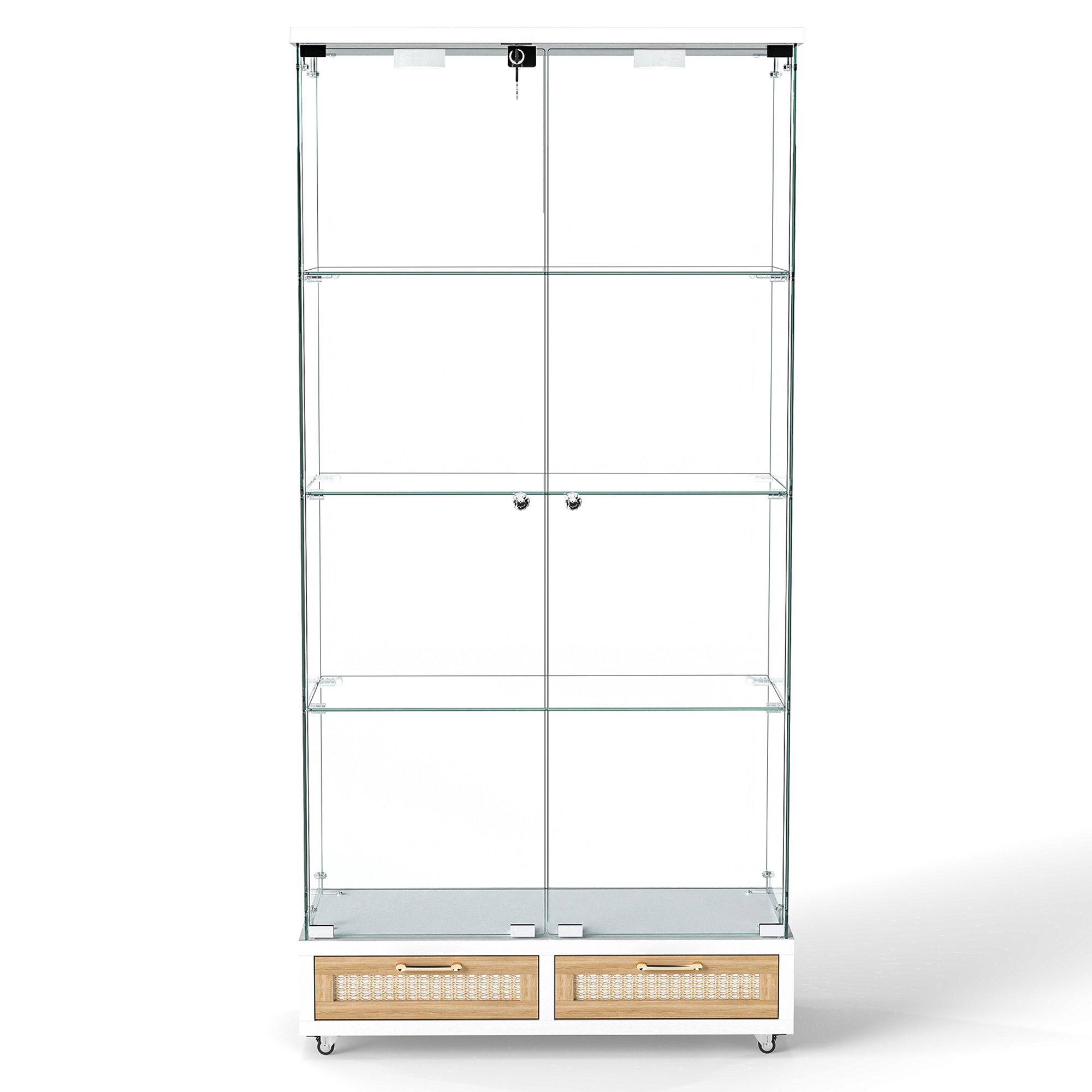 Product Name:Modern Glass Display Cabinet with Large Drawers,Quick-assembly Antique Cabinet with LED lights,empered Glass Bookshelf,2-Door Storage Case with 4 Shelves for Living Room and Bedroom,white and natural