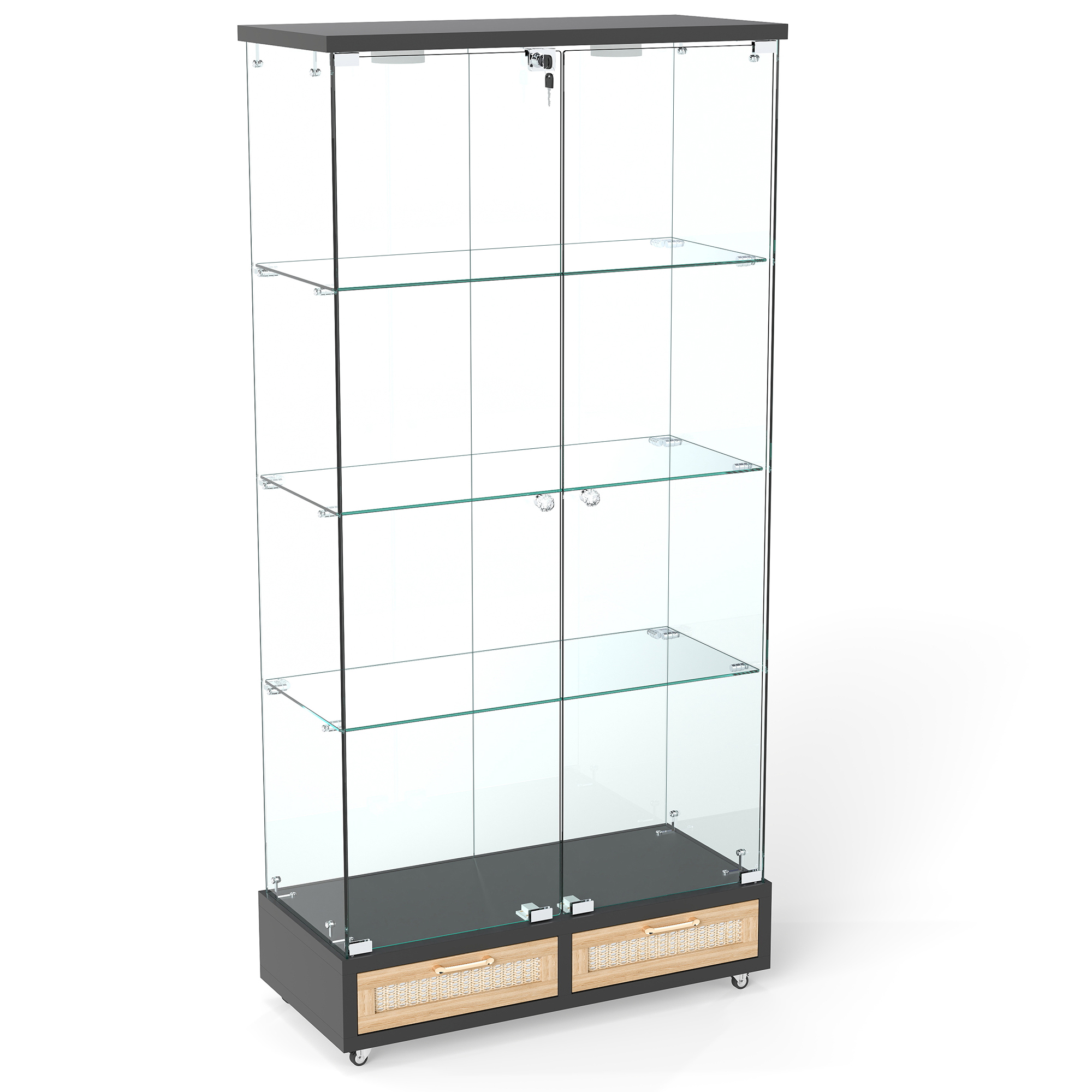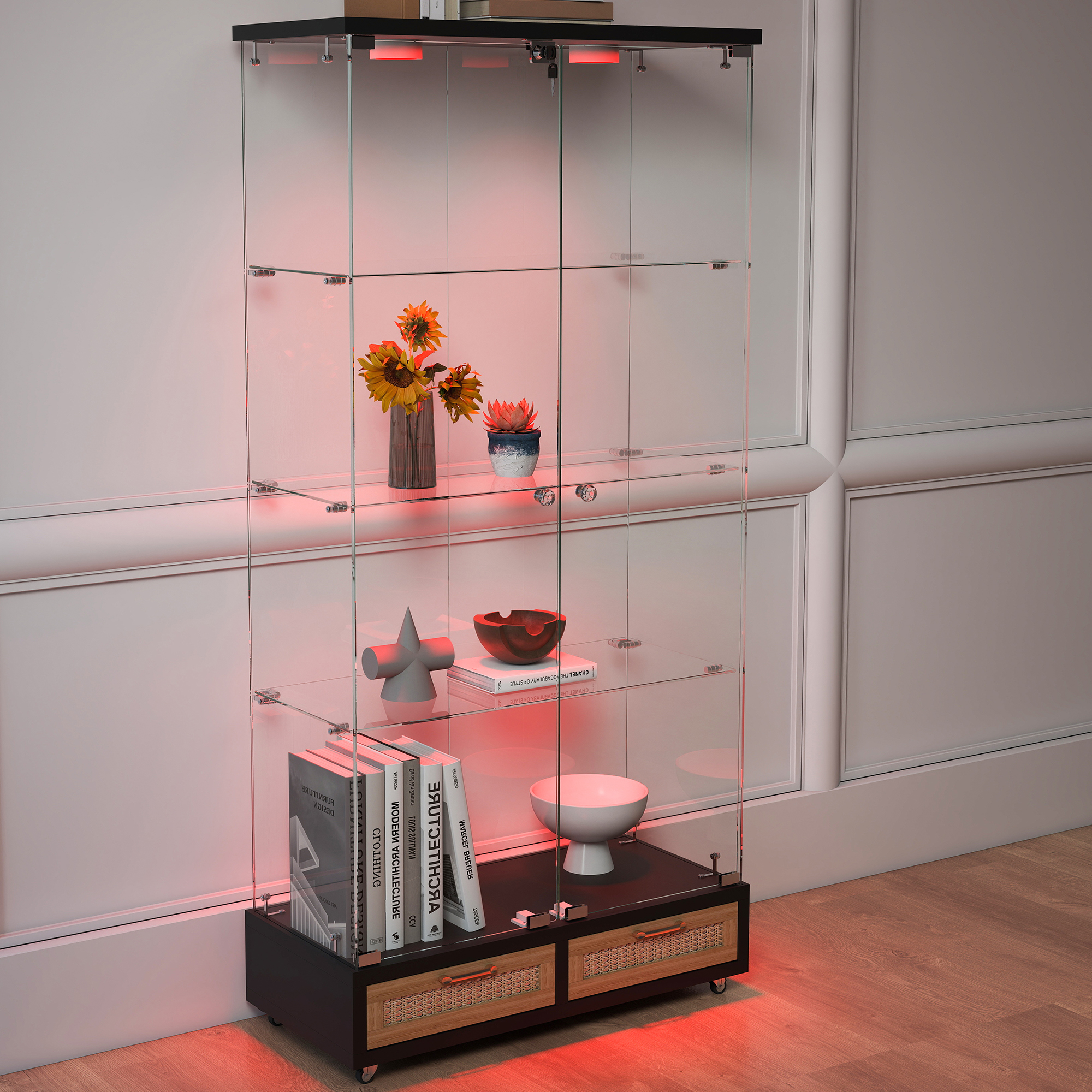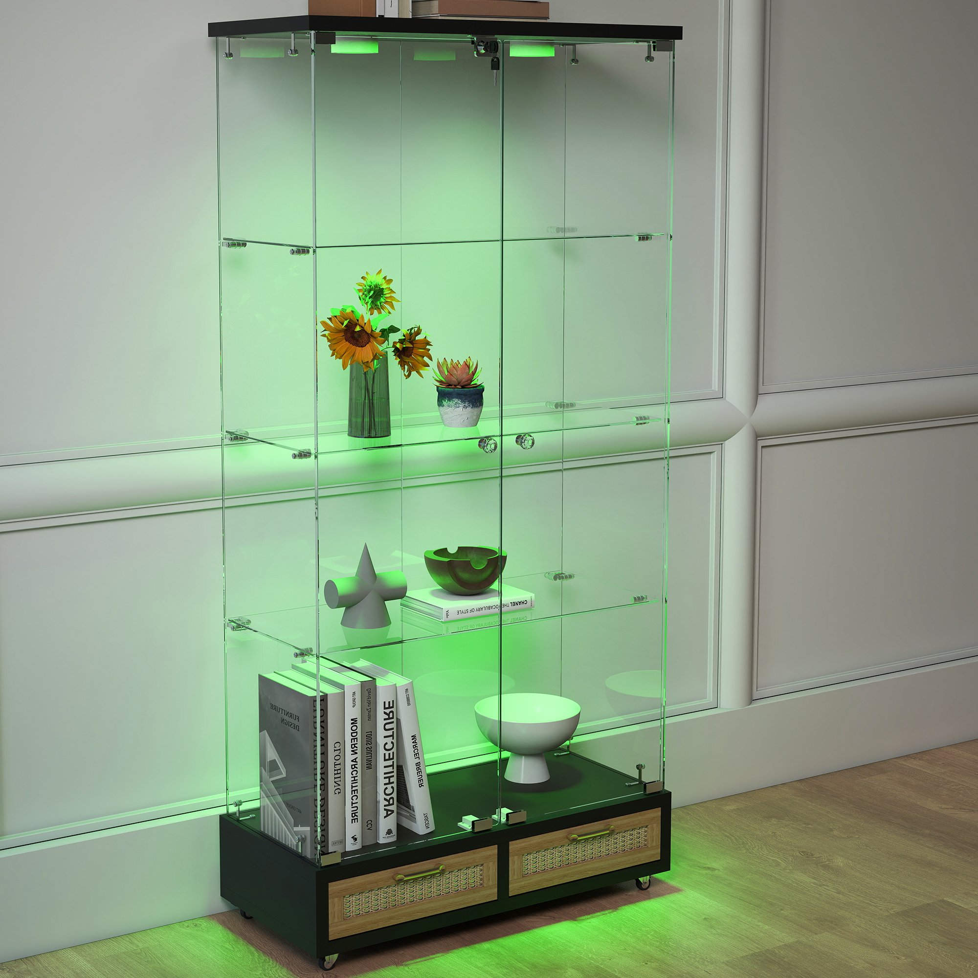 Product Name:Modern Glass Display Cabinet with Large Drawers,Quick-assembly Antique Cabinet with LED lights,Tempered Glass Bookshelf,2-Door Storage Case with 4 Shelves for Living Room and Bedroom,black and natural