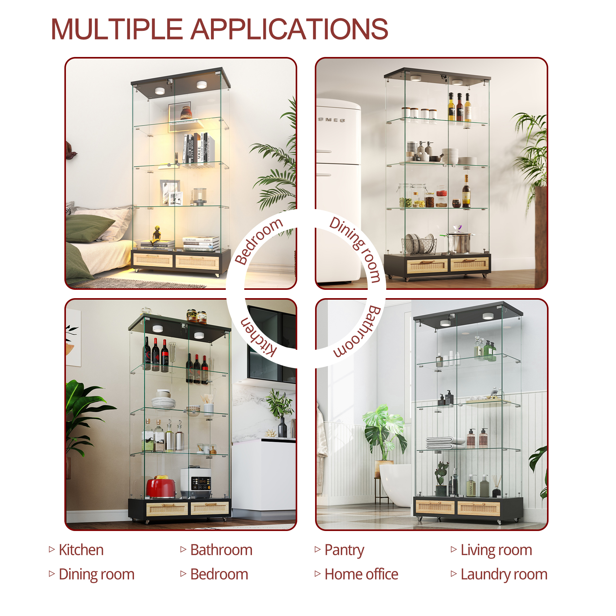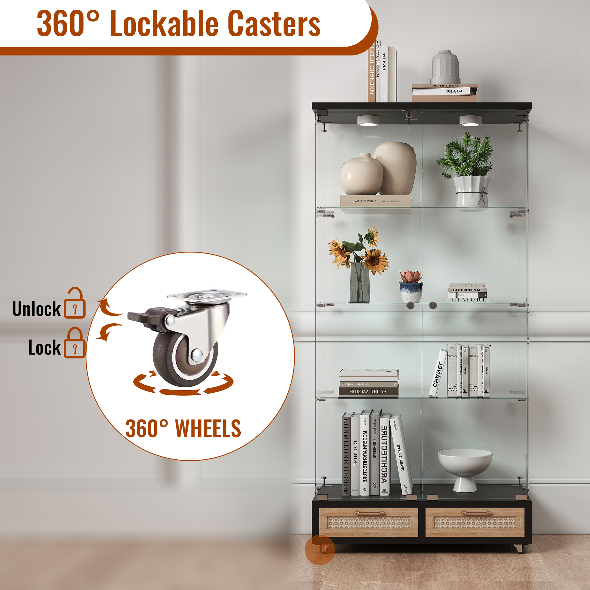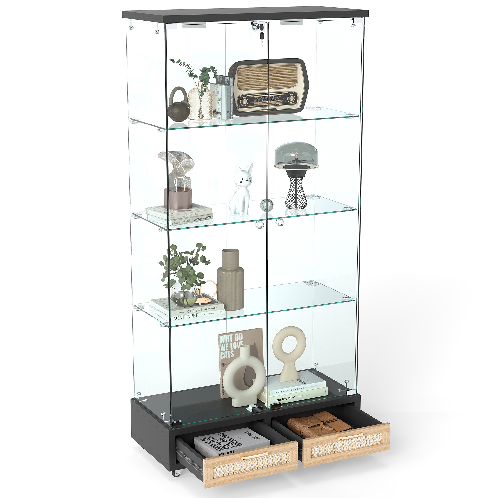 Product Name:Modern Glass Display Cabinet with Large Drawers,Quick-assembly Antique Cabinet with LED lights,Tempered Glass Bookshelf,2-Door Storage Case with 4 Shelves for Living Room and Bedroom,black and natural