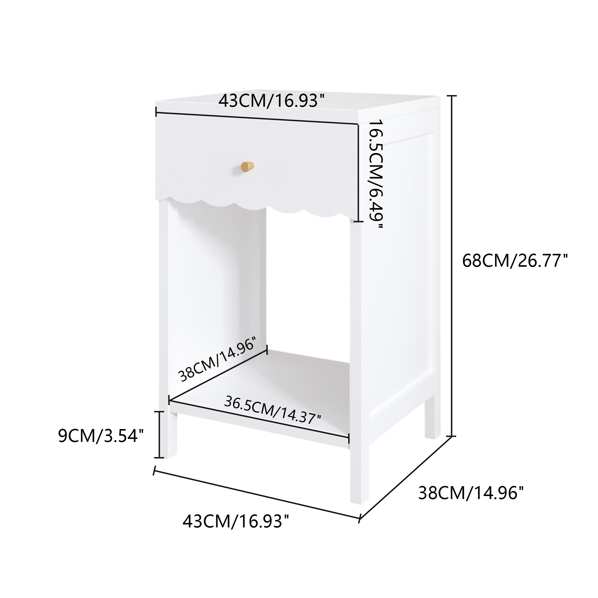 Product Specifications: Basic information Product Type:Single Box Product Product Name:Modern White Nightstand with Drawer and Open Shelf,Scalloped Edge Bedside Table for Bedroom, Cute Minimalist Side Table for Kids R...