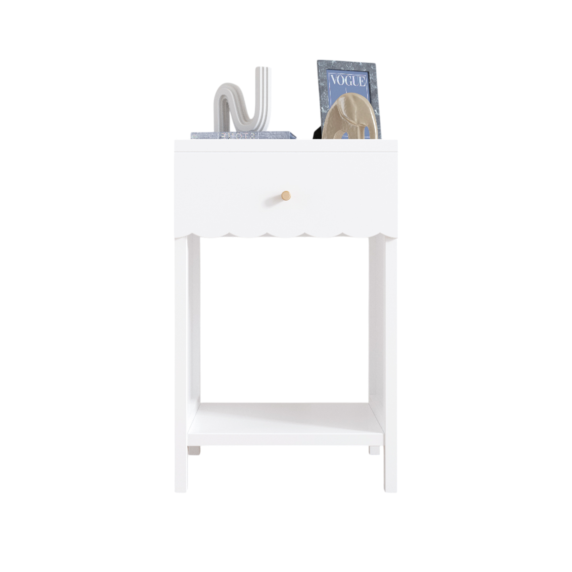 Product Name:Modern White Nightstand with Drawer and Open Shelf,Scalloped Edge Bedside Table for Bedroom, Cute Minimalist Side Table for Kids Room or Girls' Room