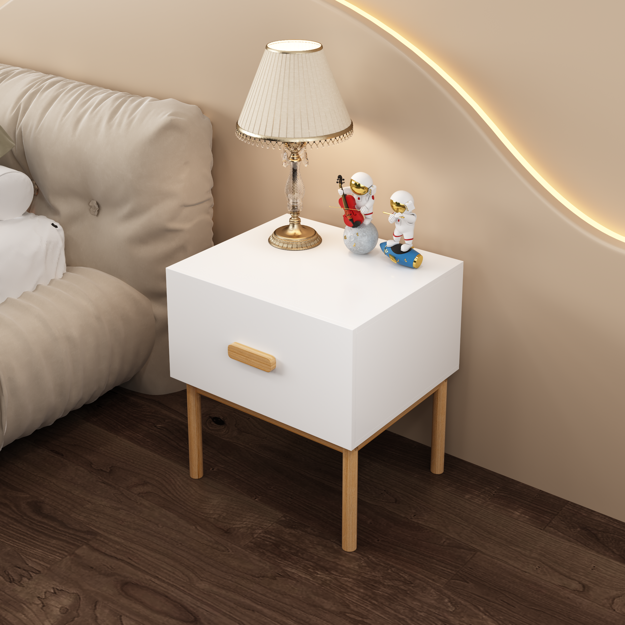 Modern White Nightstand With Drawer And Wood Legs, Minimalist Bedside Table With Handle For...
