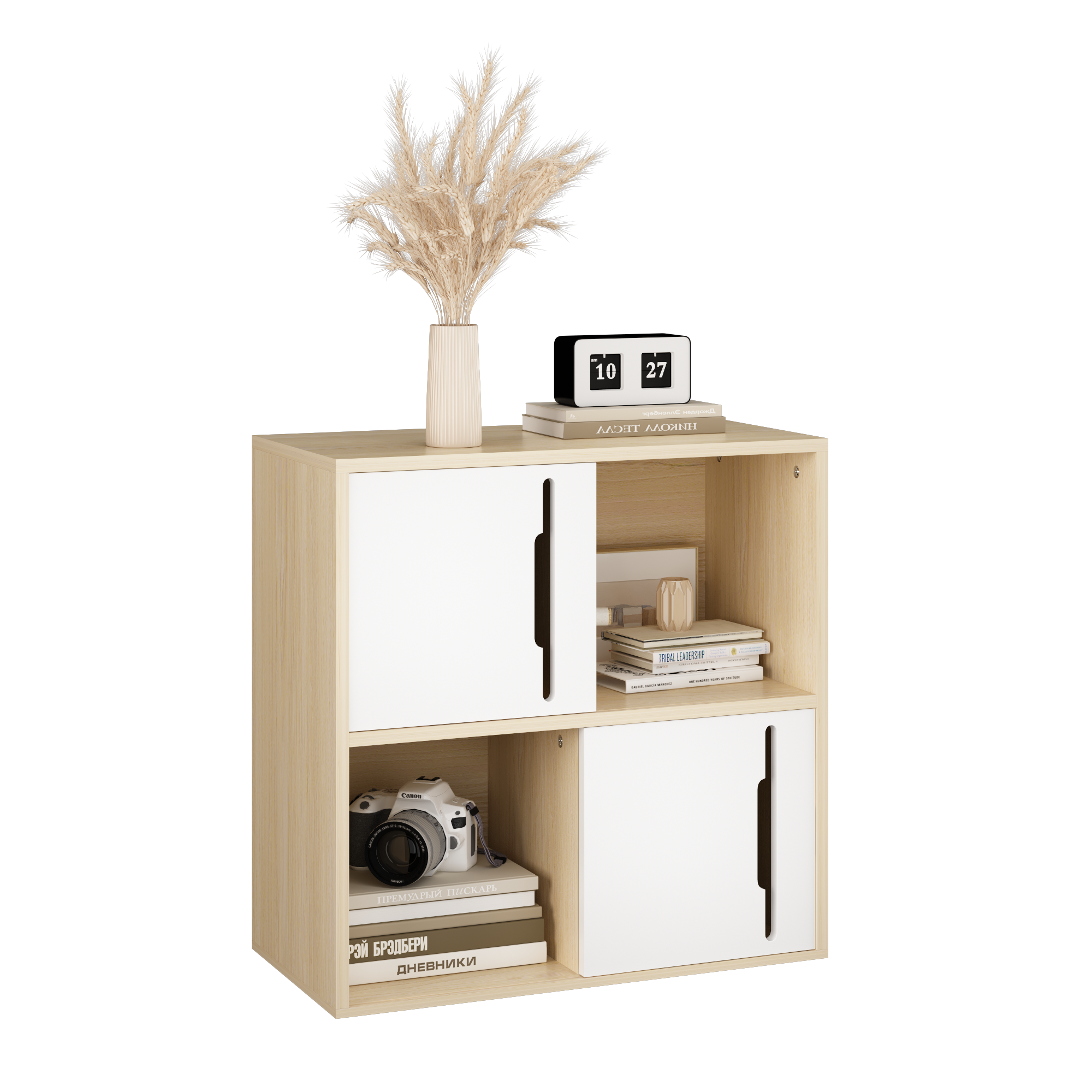 Product Name:Modern Wooden Storage Cabinet with Sliding Doors,2-Tier Open and Closed Shelves Organizer,Natural Wood Finish with White Panels,for Living Room,Bedroom,or Kids'Room