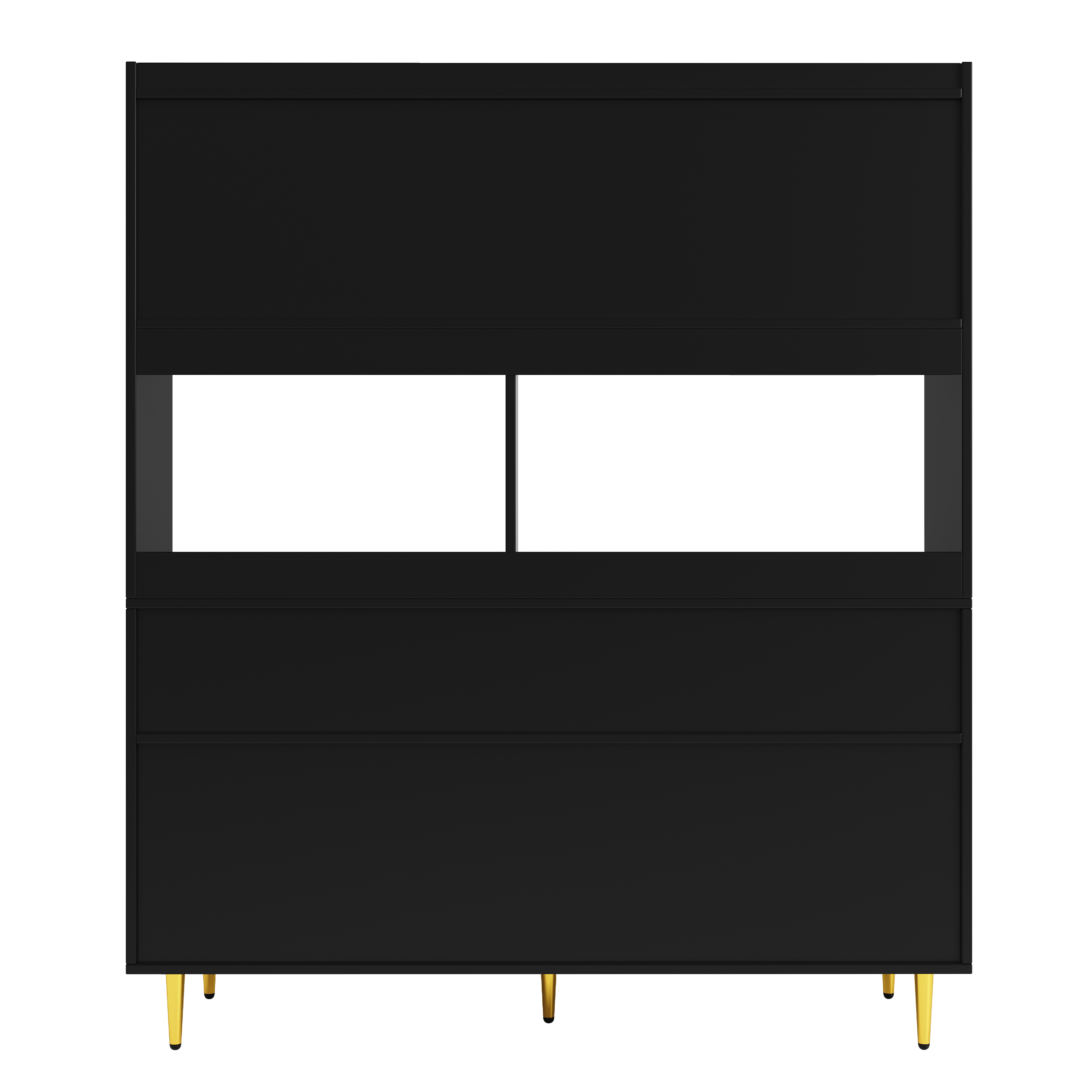 This sideboard not only provides a spacious desk space suitable for placing decorations or daily necessities, but also has extensive storage options, including multiple drawers, wine racks, open storage compartments and multi-layered dividers. Can easily handle different types of storage needs. Whether it's crockery, wine, kitchen utensils or various small items, you'll find the right place to store them. The raised floor design not only makes cleaning easy and convenient, but also provides additional storage flexibility by freeing up floor space. The exquisite metal handles are full of texture and the appropriate design of the cabinet height ensures a comfortable user experience, so that every opening and closing of the cabinet door is smooth and natural, greatly improving the convenience of daily life.