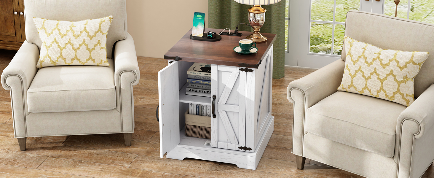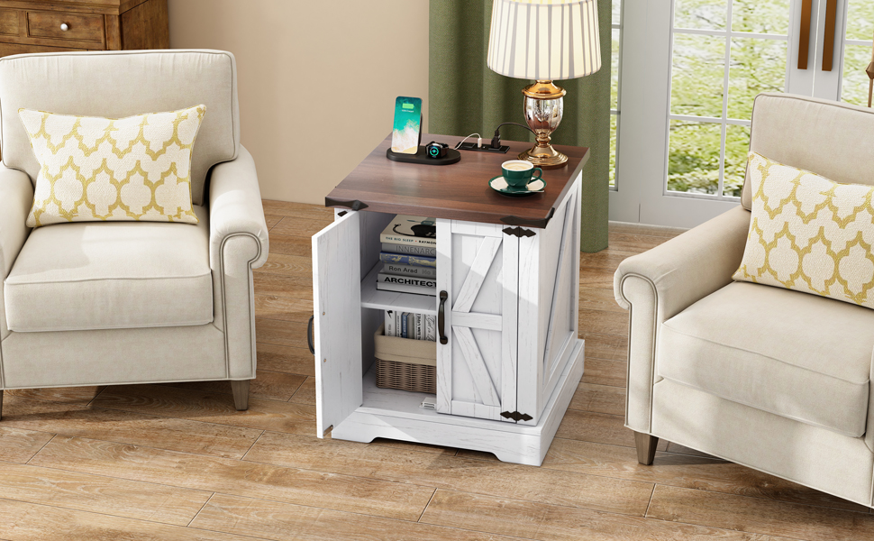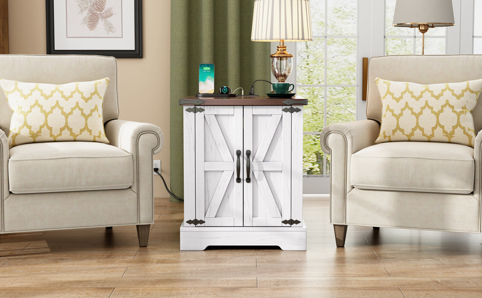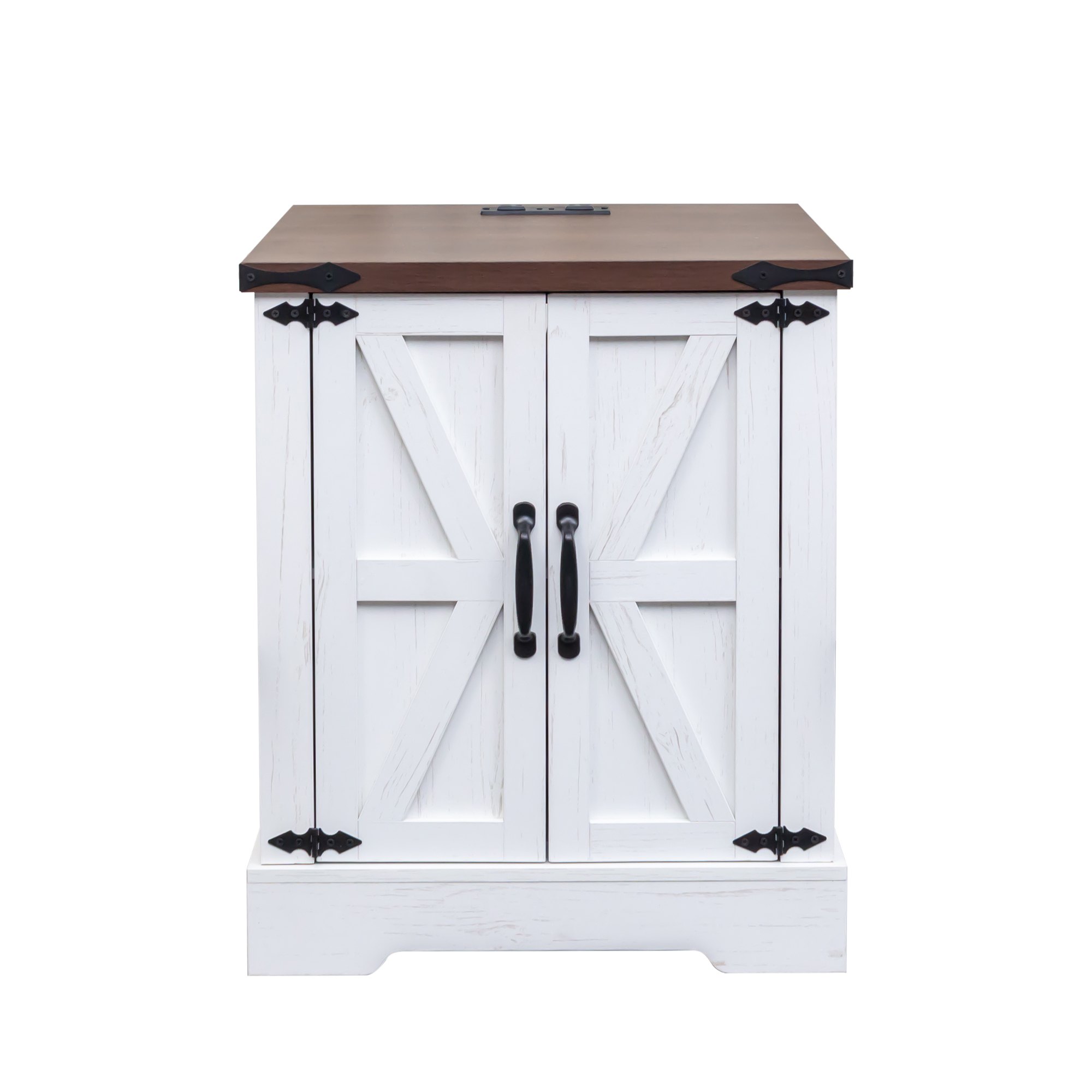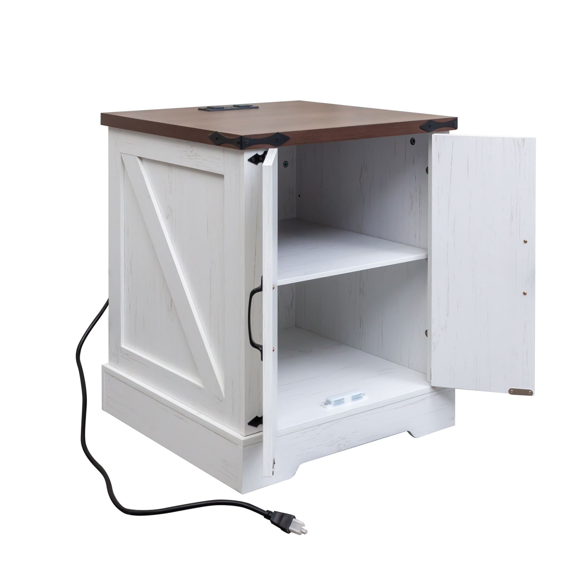 Product Name:ON-TREND Farmhouse End Table with Charging Station, Rustic Wood Nightstand with Adjustable Shelf, 19.6"W Versatile Walnut Sofa Side Table with Barn Doors & Retro Hinges for Bedroom, Living Room, White
