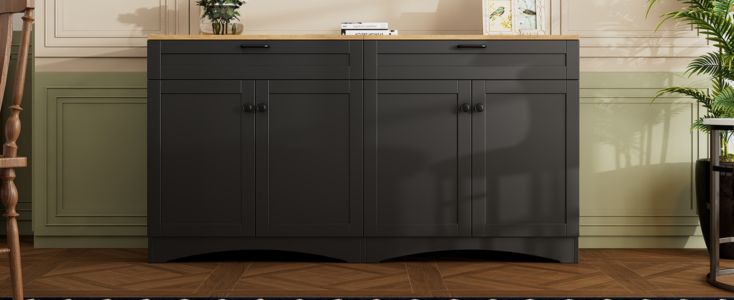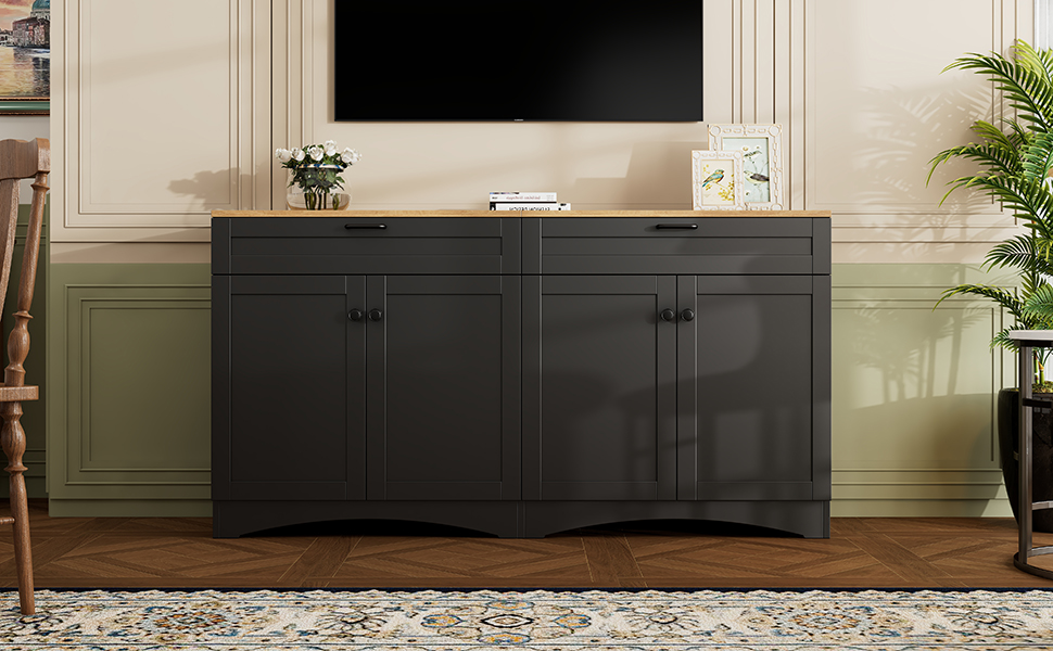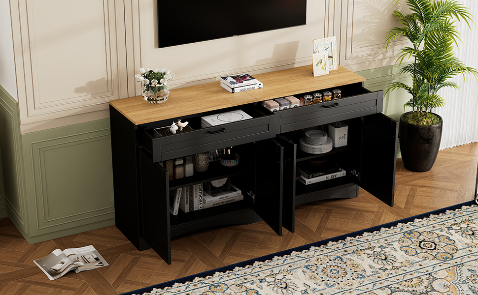 The 62.9”W tabletop is enough for you to place a 70-inch TV. Moreover, it can serve versatile functions such as a side cabinet, dressing cabinet, or bathroom storage cabinet in either the living room or bedroom. Also, placing it in the dining room allows for storing a variety of tableware and kitchen appliances, truly demonstrating the cabinet's multifaceted utility.